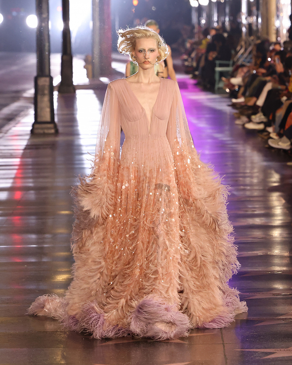 На импровизированном показе, модели появились в образах, включающих в себе все знаковые элементы нарядов «золотой эры» Голливуда. На подиуме можно было увидеть элегантные костюмы как у лощенных секс-символов 50-х, драматические халаты с перьями, которые голливудские дивы Мэй Уэст и Джин Харлоу носили за кулисами. Всю роскошь того времени передавали усыпанные сияющими пайетками вечерние платья, пышные боа из перьев до пола, те самые платья-неглиже.