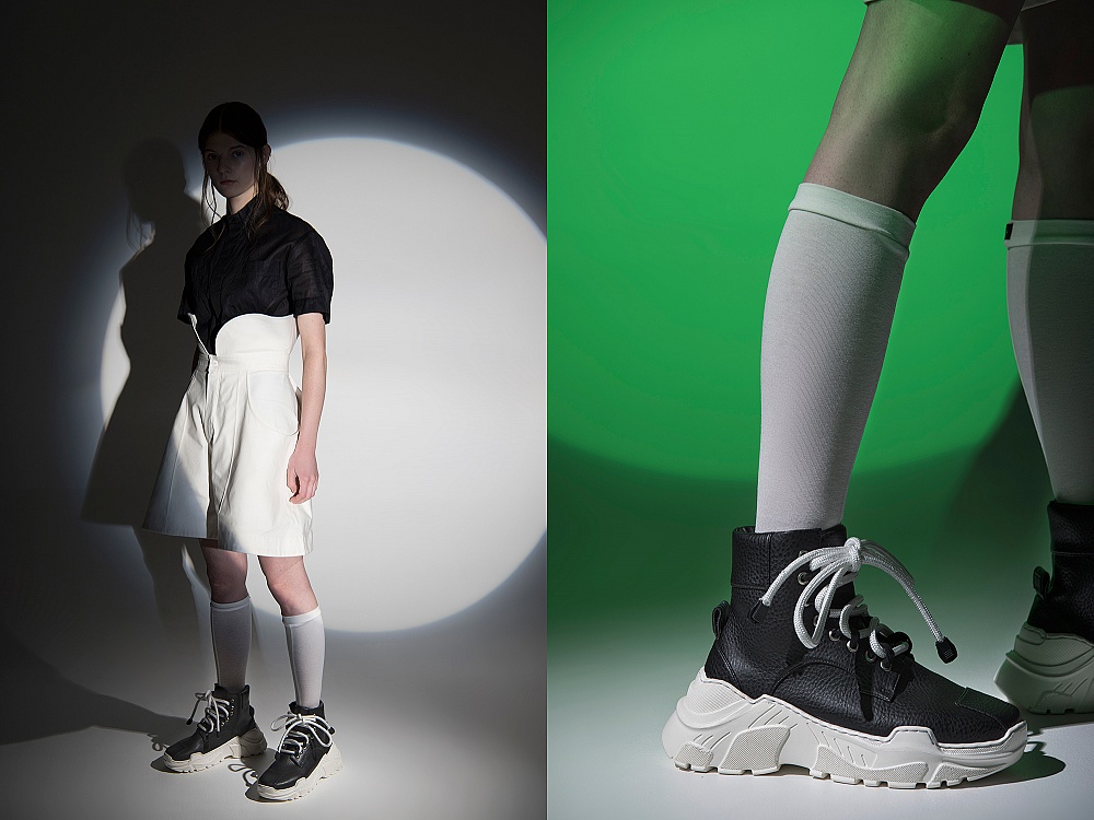 Новая модель представляет собой гибрид сникерсов на массивной подошве и ботинок с грубой шнуровкой. Модель выполнена из экокожи с хлопковой основой и полиуретановым покрытием.