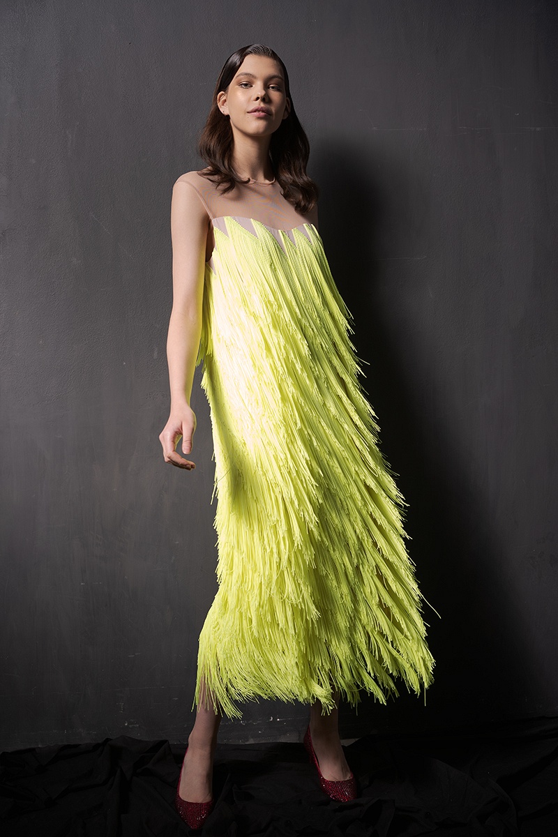 Коллекция Tango выполнена в шелковой органзе, шифоне, шерстяном и хлопчатобумажном крепи, трикотаже. Образы дополнены страусовыми перьями и хрусталем.