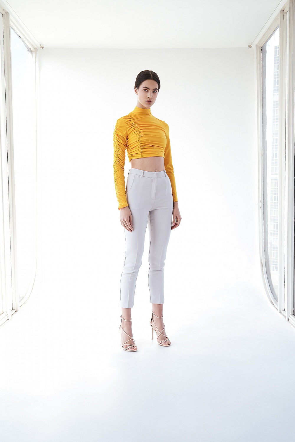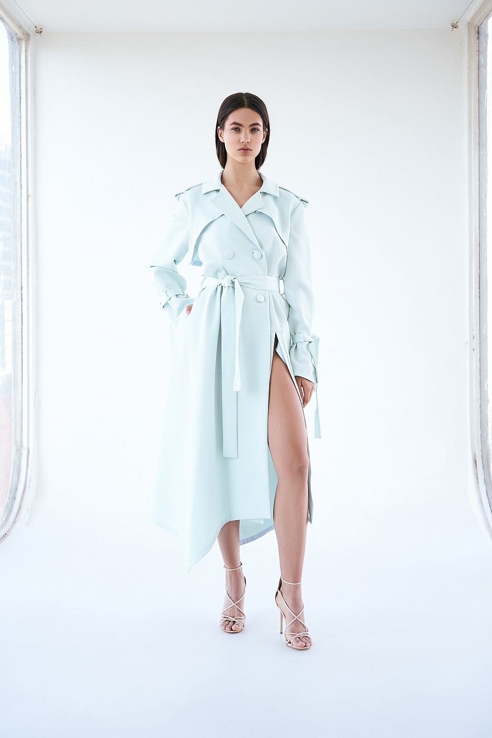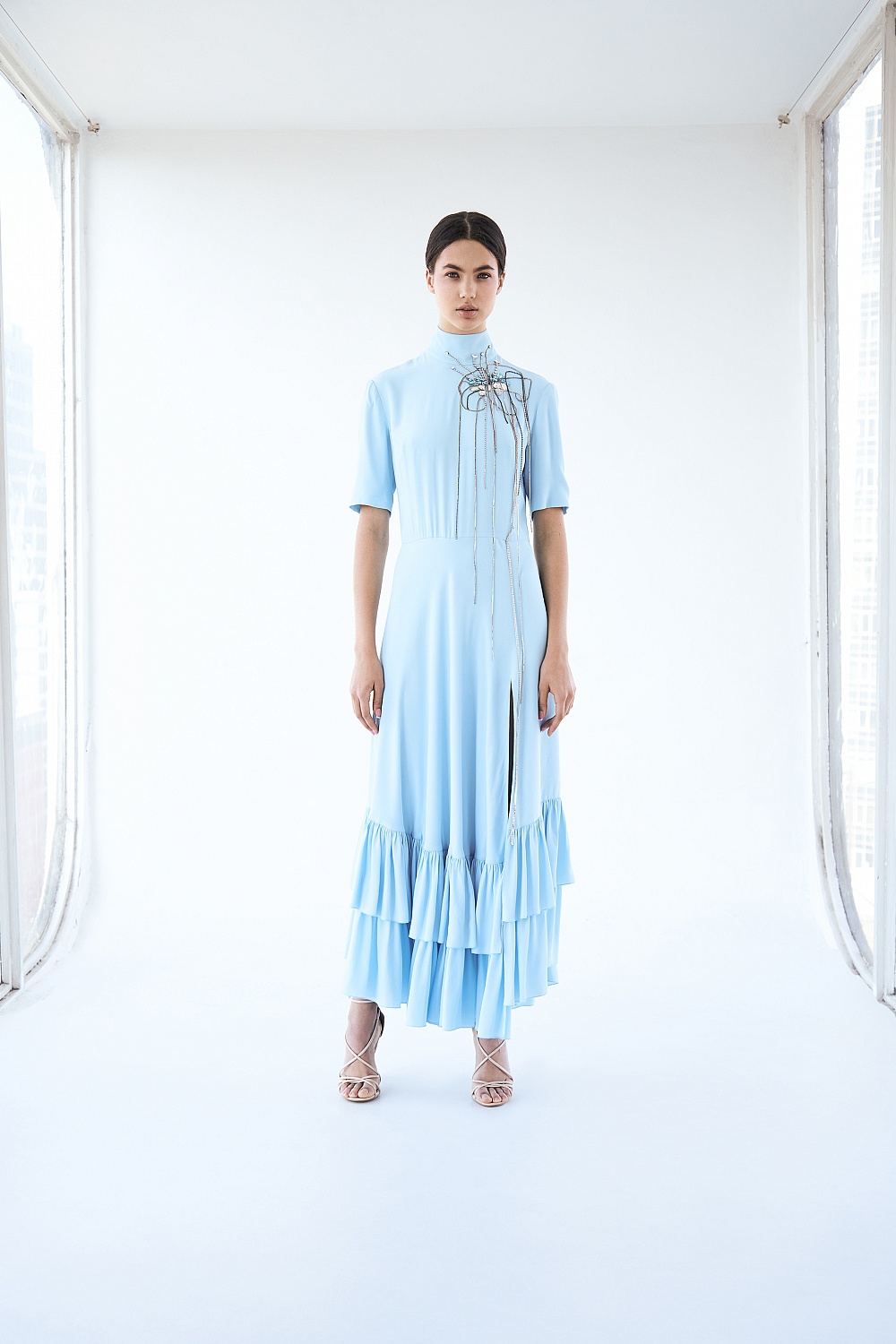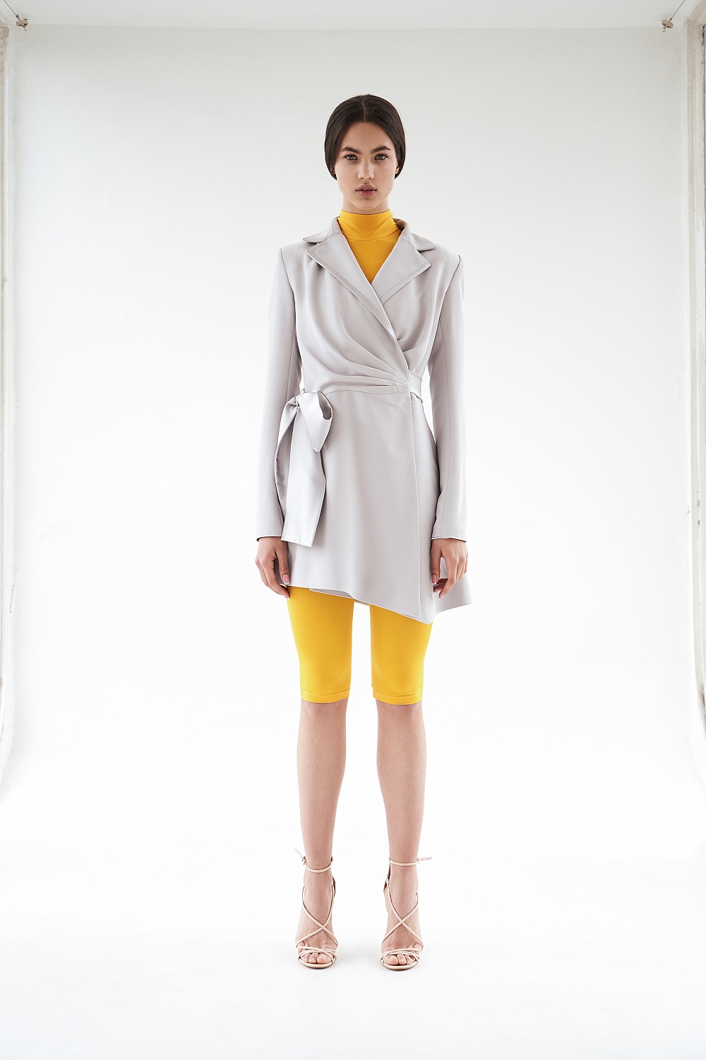 В весенне-летней коллекции Arutiunova удобный стиль athleisure словно танцует в паре с четкой структурностью костюмного кроя, к примеру, худи с вечерним платьем, а джерси с нарядным шелком, плотный трикотаж с прозрачной органзой. Мотив выхода из тени под свет софитов подчеркивает сочетание открытых солнечных цветов: лазурного, кораллового, мангового, багрового, бирюзового, с богатой гаммой оттенков белого, серого и черного.