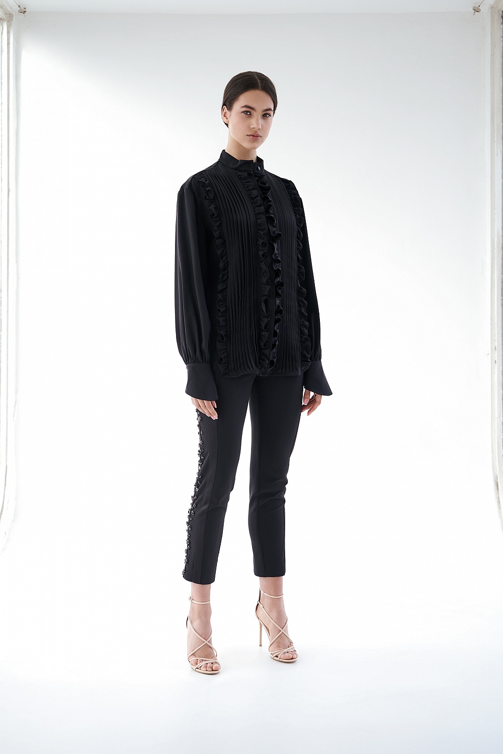 Изысканный декор в этом сезоне представлен объемной аппликацией, вышивкой и инкрустацией кристаллами. Главной декоративной деталью коллекции стал цветок лилии — символ женственности и флористический талисман дизайнера.
