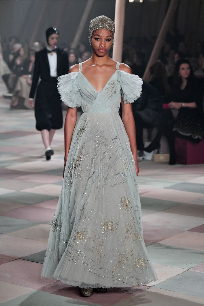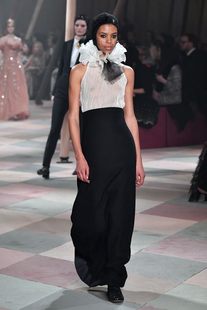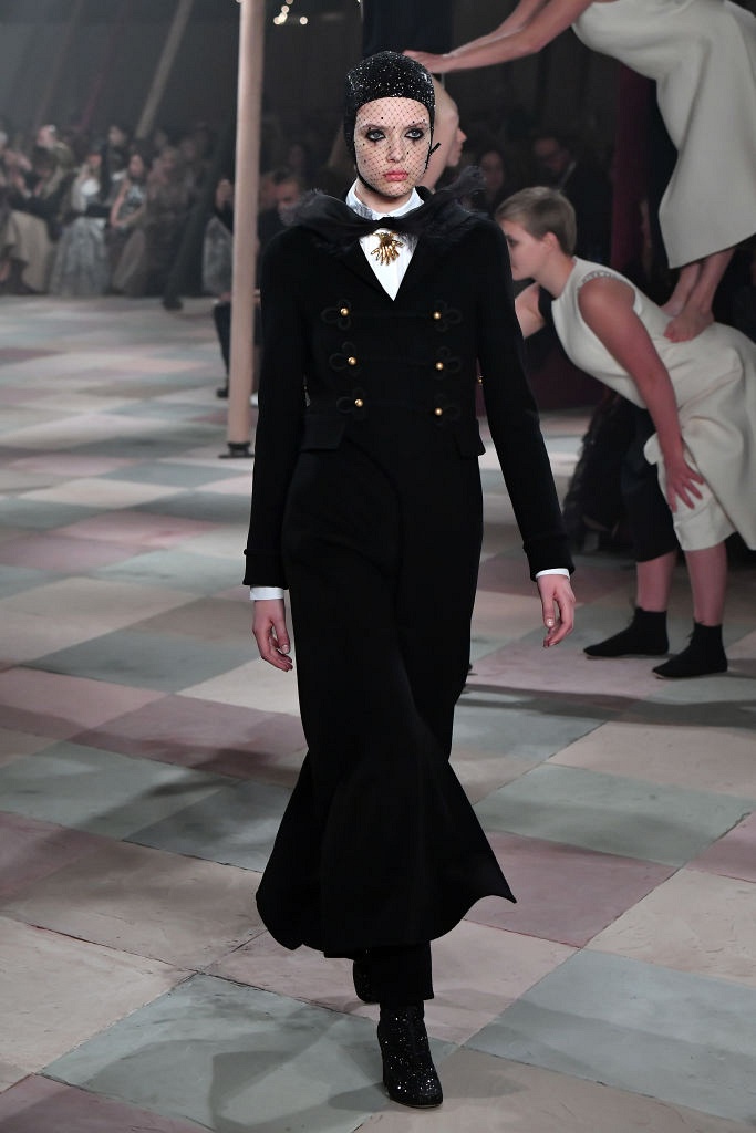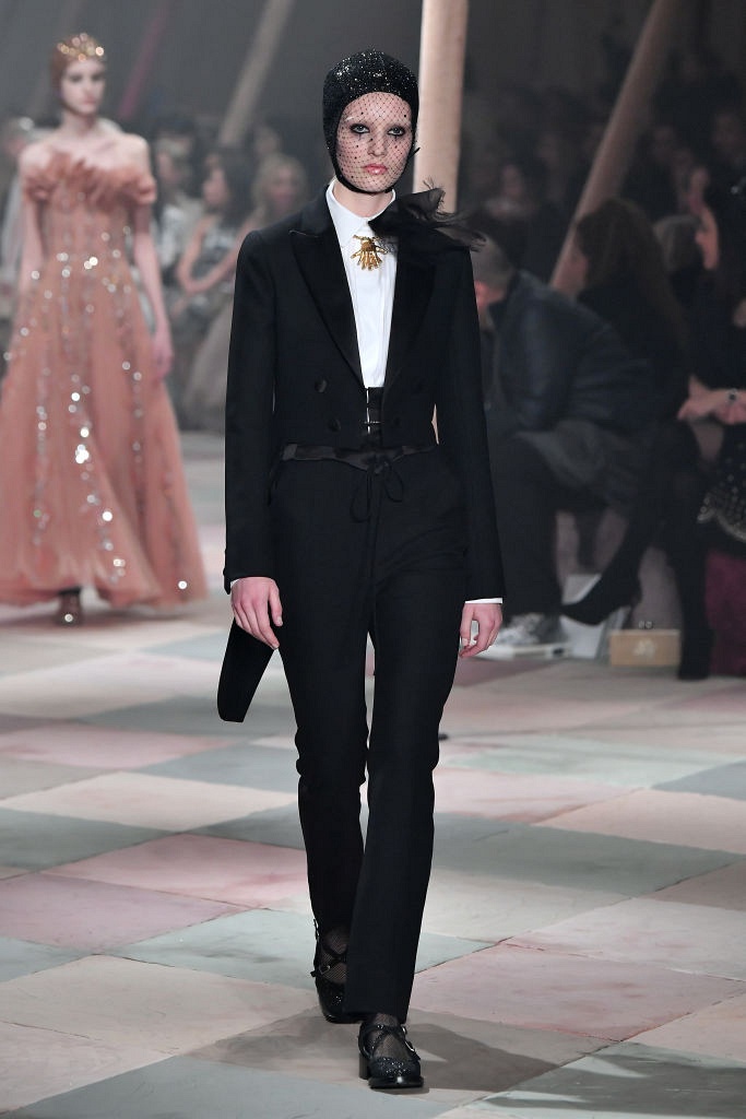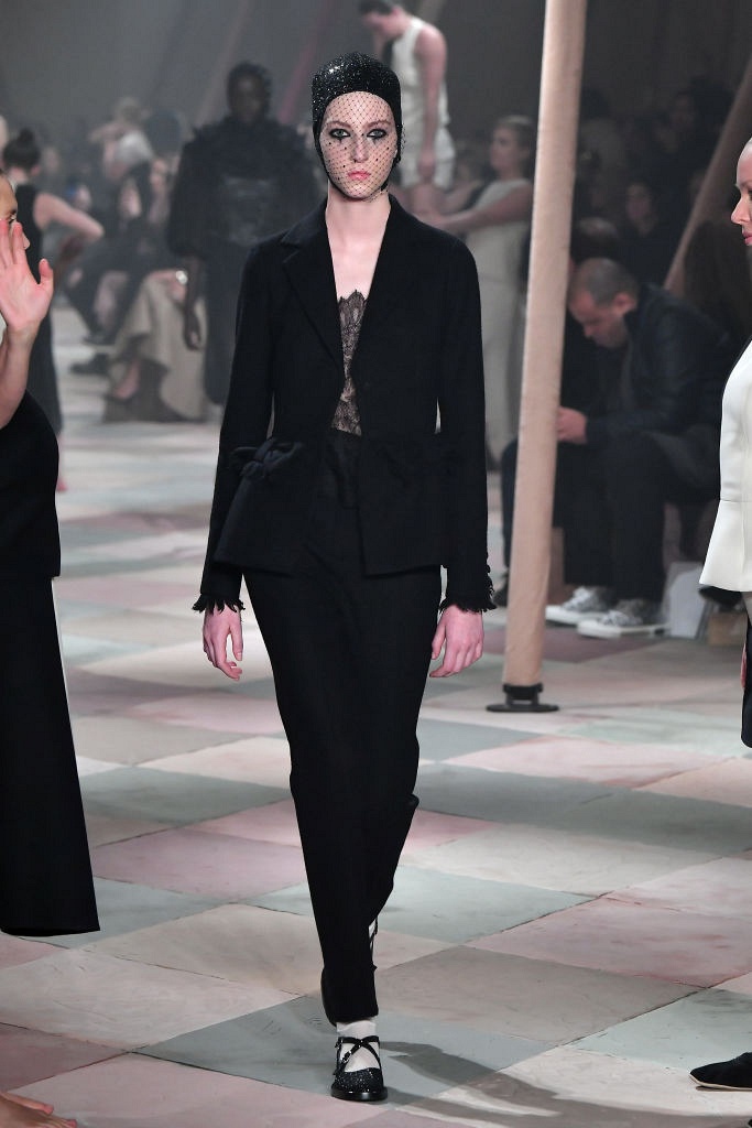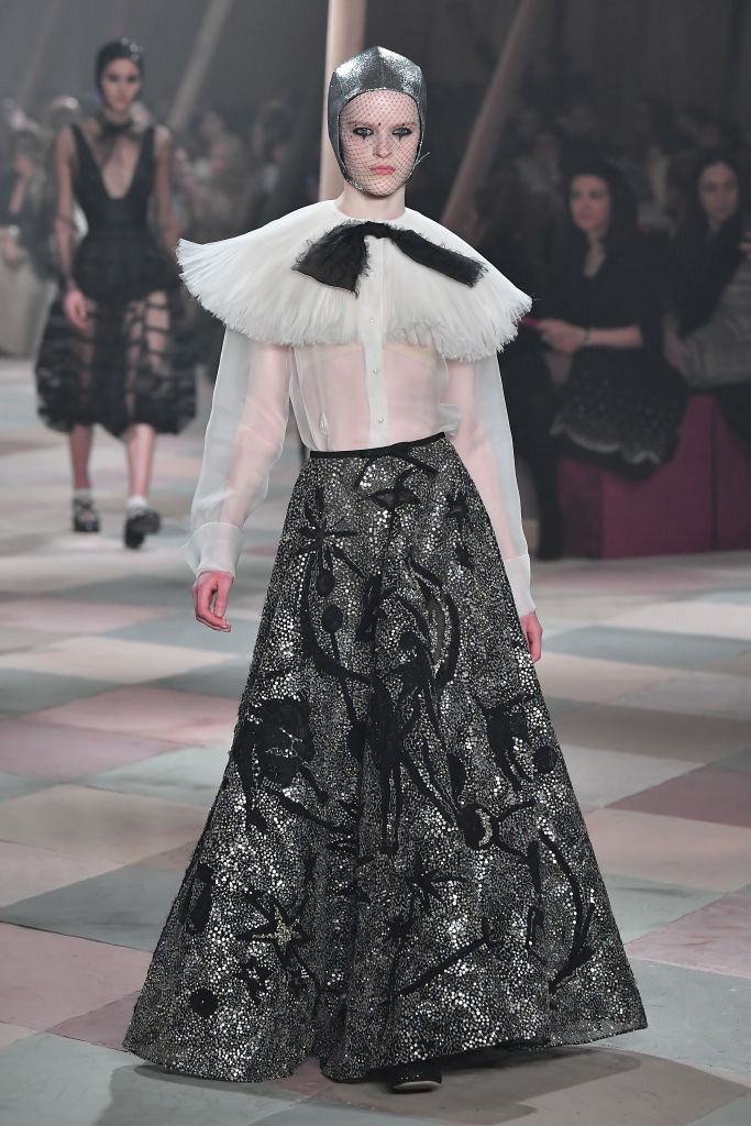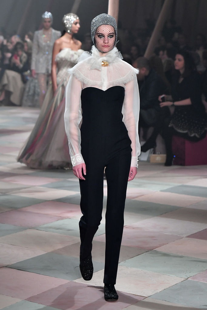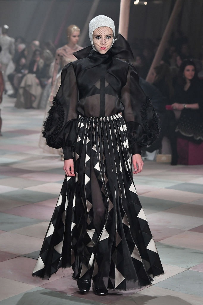 Несмотря на выбранную тему, коллекция Christian Dior Haute Couture получилась сдержанной и изысканной: струящиеся силуэты, воздушные блузы, полупрозрачные материалы и обильная драпировка. На контрасте с черными костюмами из плотной ткани, платья с легким сиянием смотрелись еще более воздушно. Особое внимание заслуживают головные уборы с вуалью, напоминающие кутюрную версию балаклав.