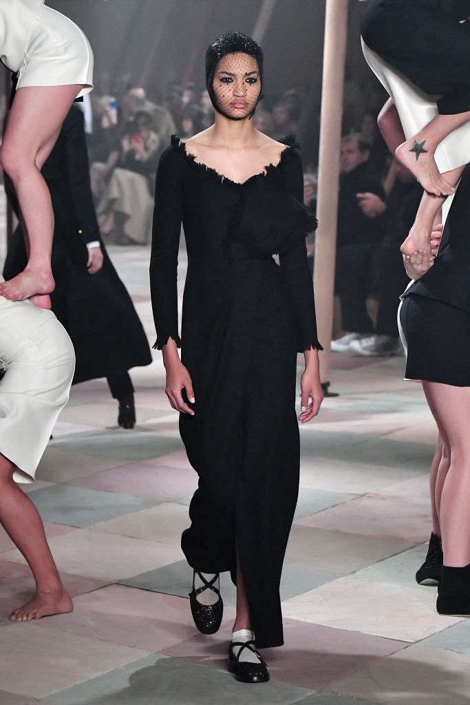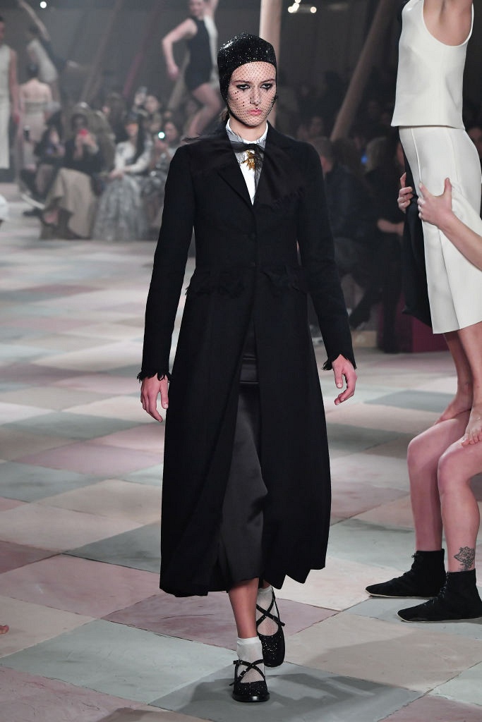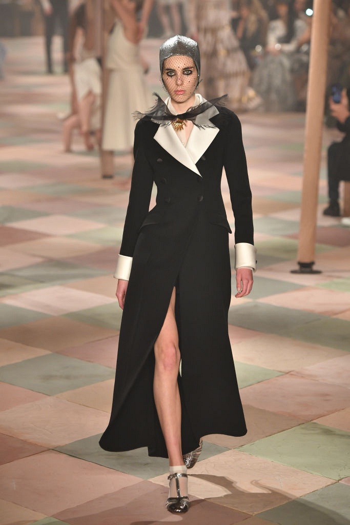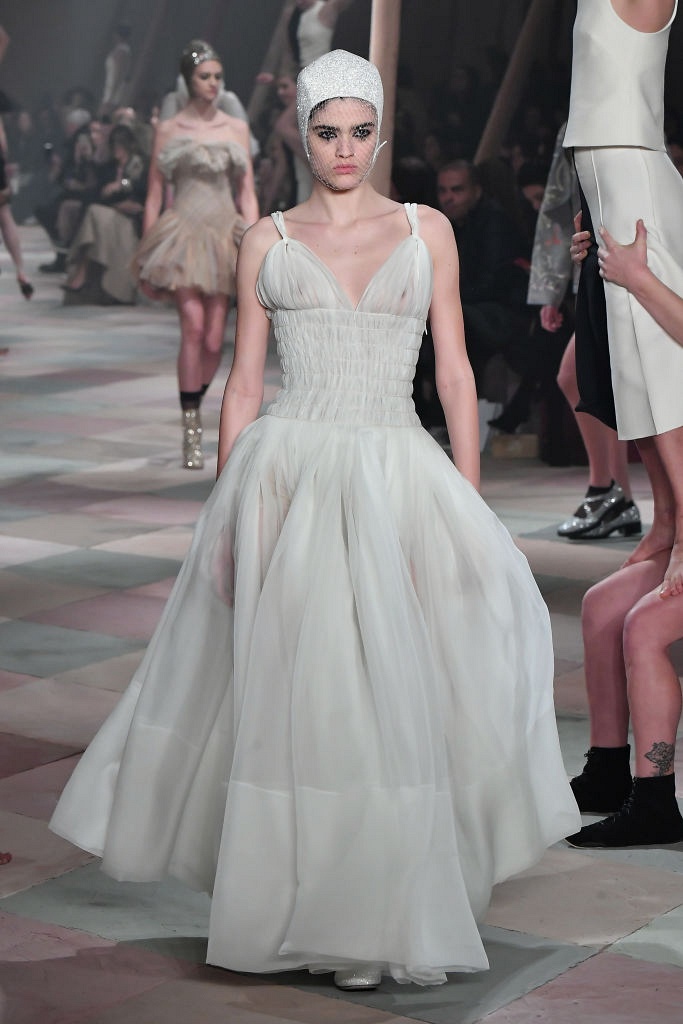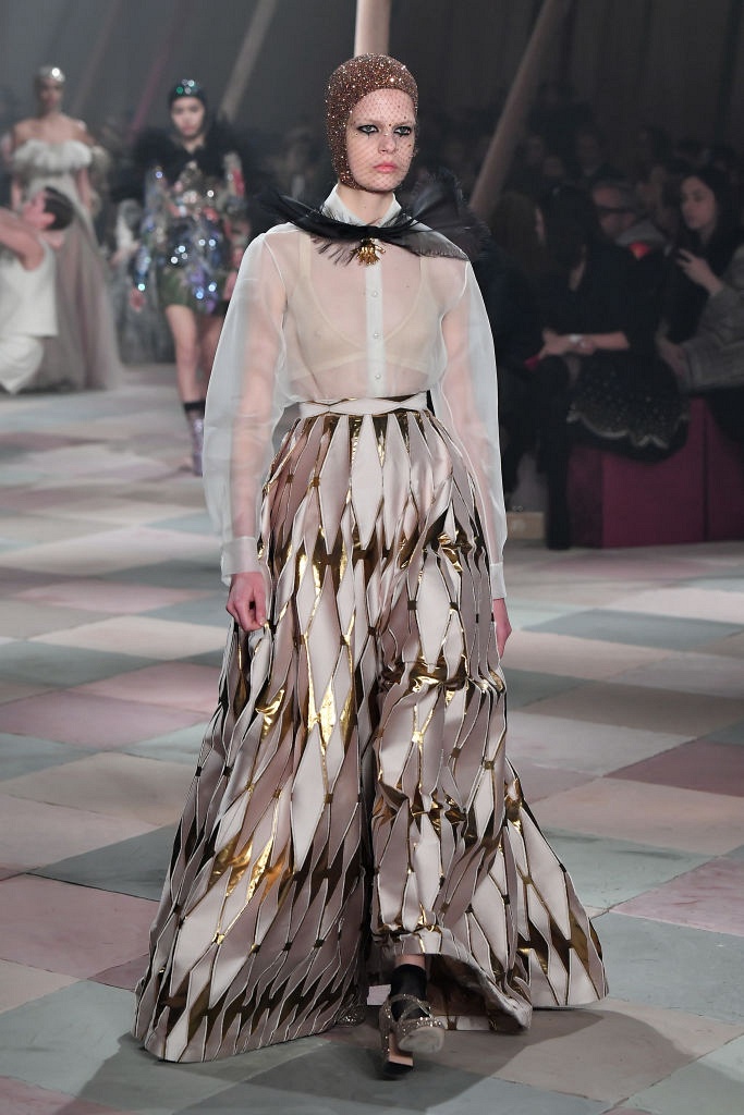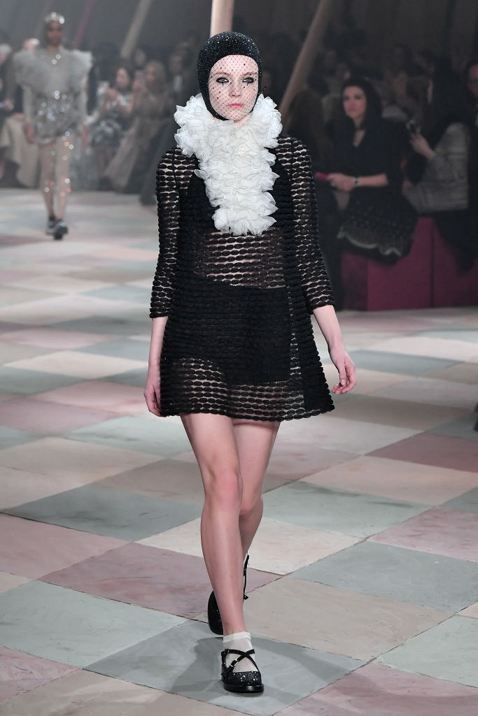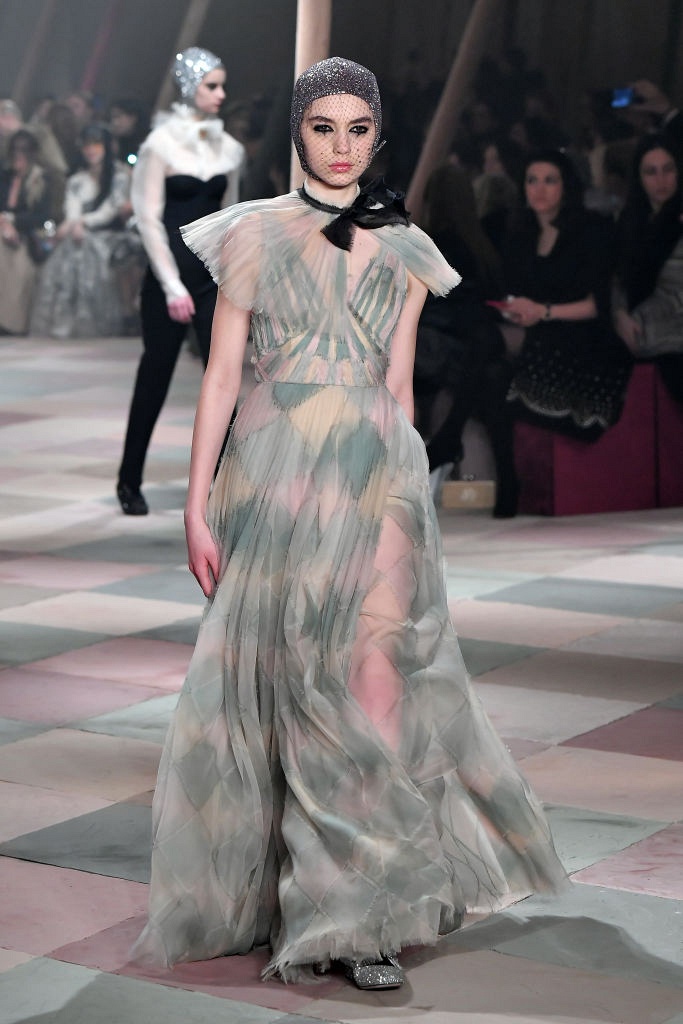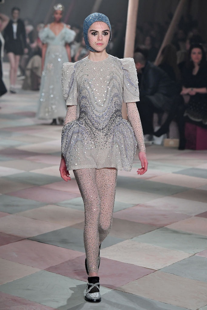 Несмотря на выбранную тему, коллекция Christian Dior Haute Couture получилась сдержанной и изысканной: струящиеся силуэты, воздушные блузы, полупрозрачные материалы и обильная драпировка. На контрасте с черными костюмами из плотной ткани, платья с легким сиянием смотрелись еще более воздушно. Особое внимание заслуживают головные уборы с вуалью, напоминающие кутюрную версию балаклав.