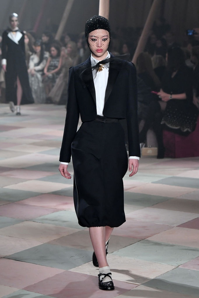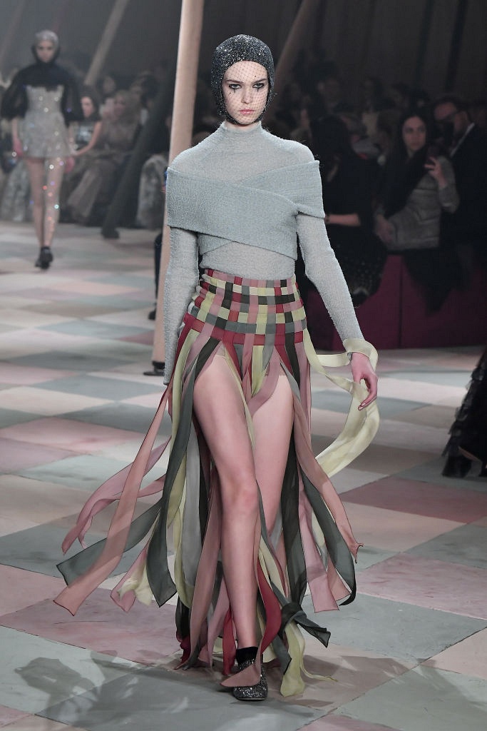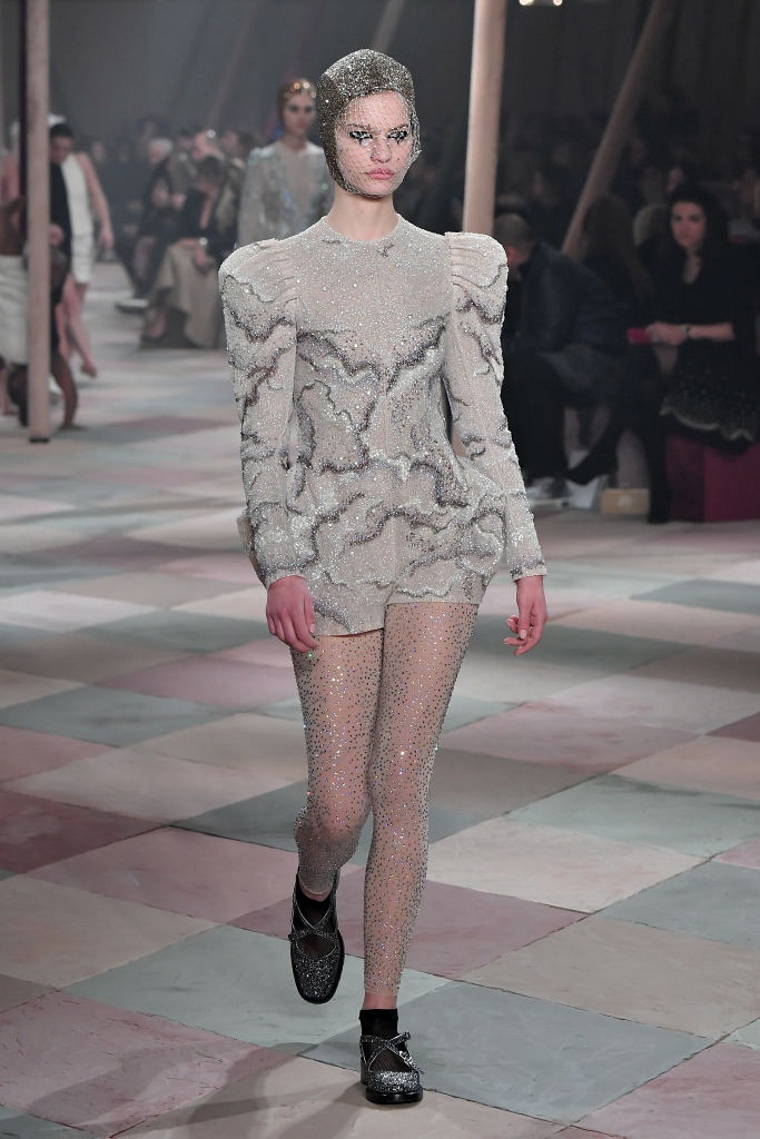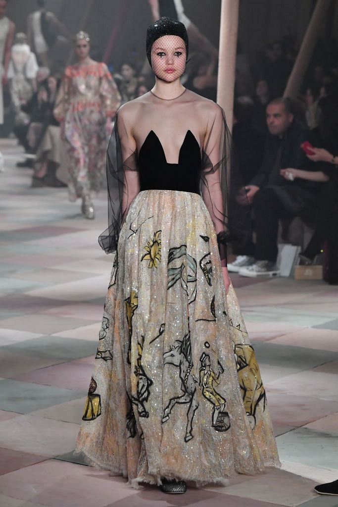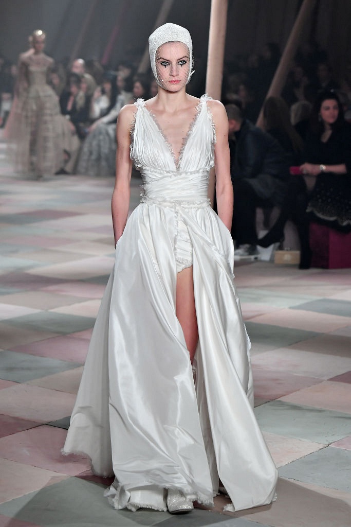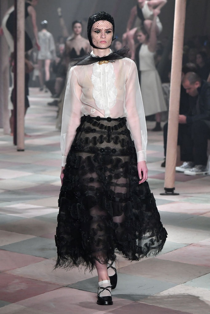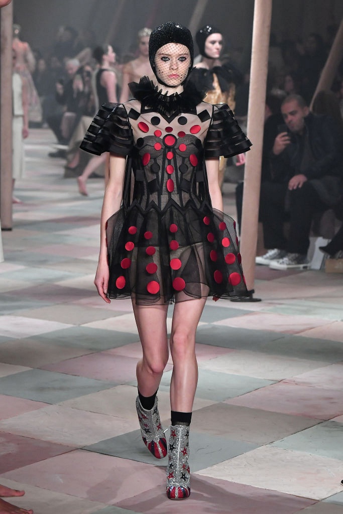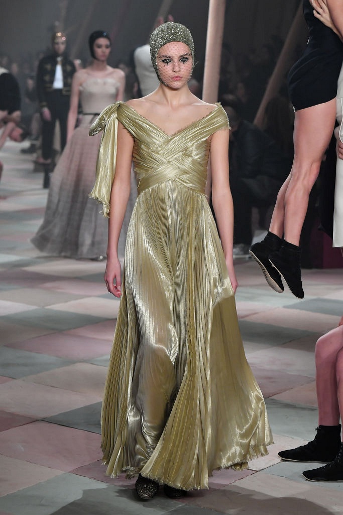 Несмотря на выбранную тему, коллекция Christian Dior Haute Couture получилась сдержанной и изысканной: струящиеся силуэты, воздушные блузы, полупрозрачные материалы и обильная драпировка. На контрасте с черными костюмами из плотной ткани, платья с легким сиянием смотрелись еще более воздушно. Особое внимание заслуживают головные уборы с вуалью, напоминающие кутюрную версию балаклав.