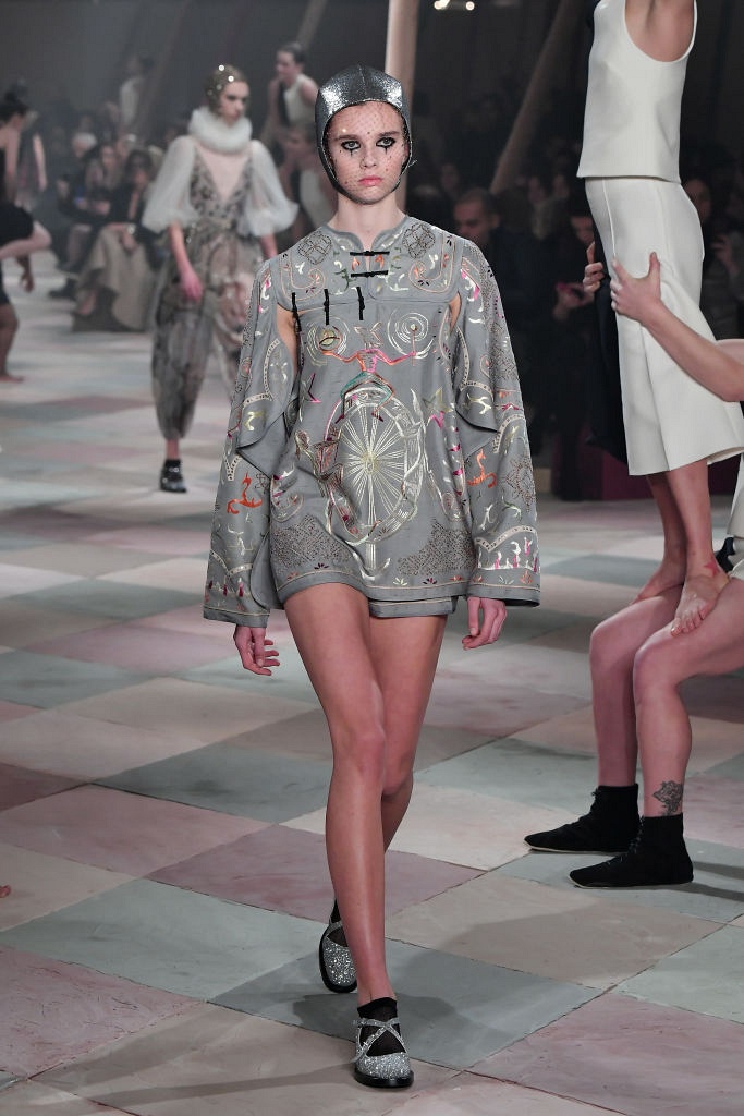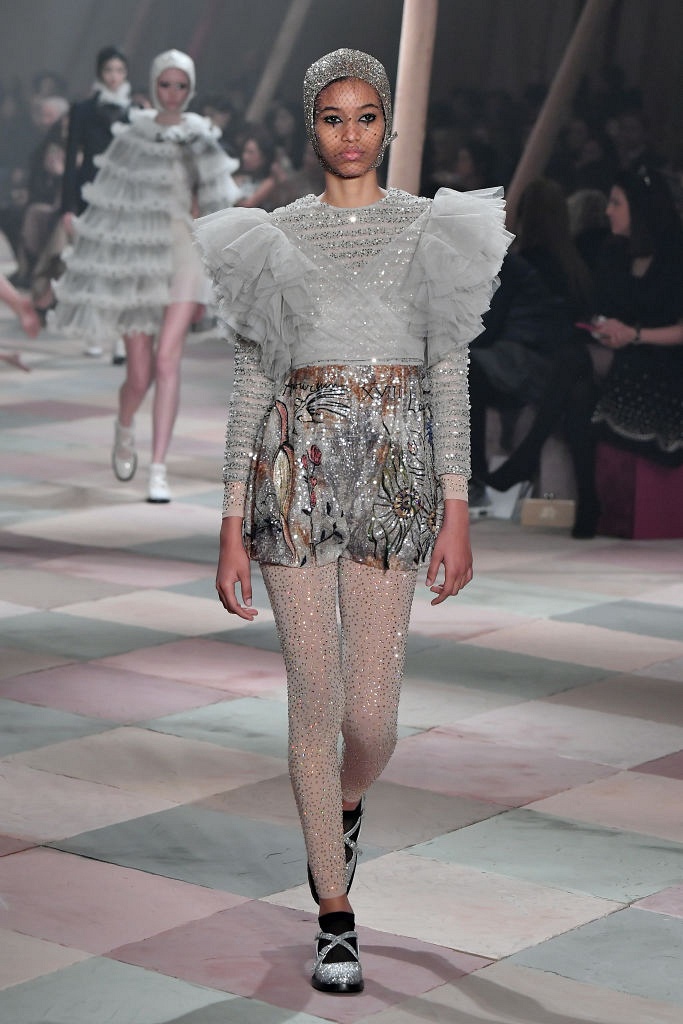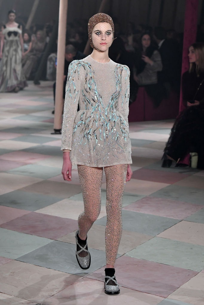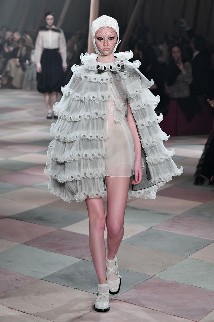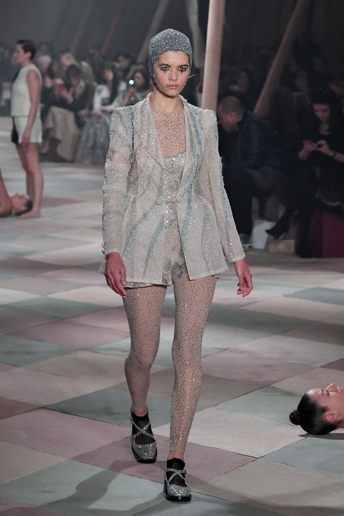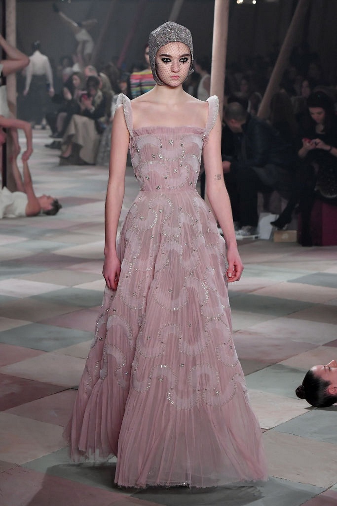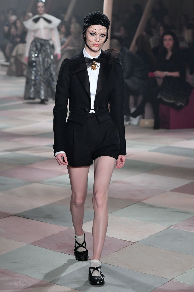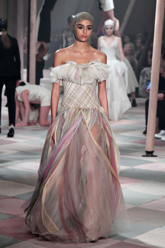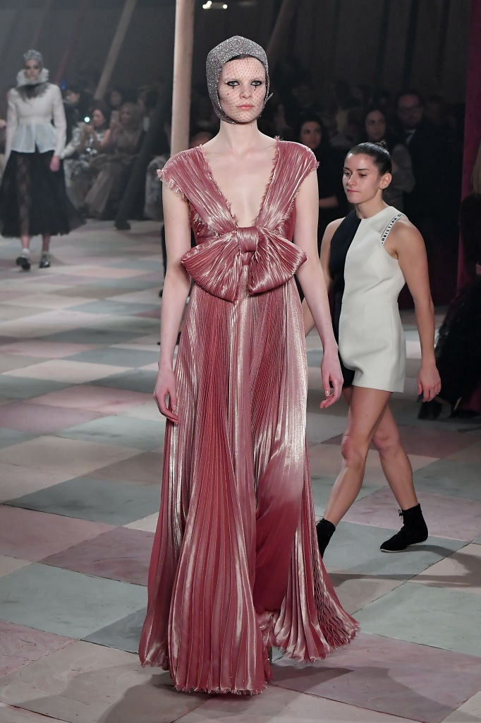 Несмотря на выбранную тему, коллекция Christian Dior Haute Couture получилась сдержанной и изысканной: струящиеся силуэты, воздушные блузы, полупрозрачные материалы и обильная драпировка. На контрасте с черными костюмами из плотной ткани, платья с легким сиянием смотрелись еще более воздушно. Особое внимание заслуживают головные уборы с вуалью, напоминающие кутюрную версию балаклав.