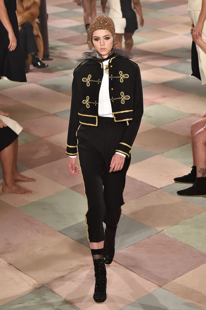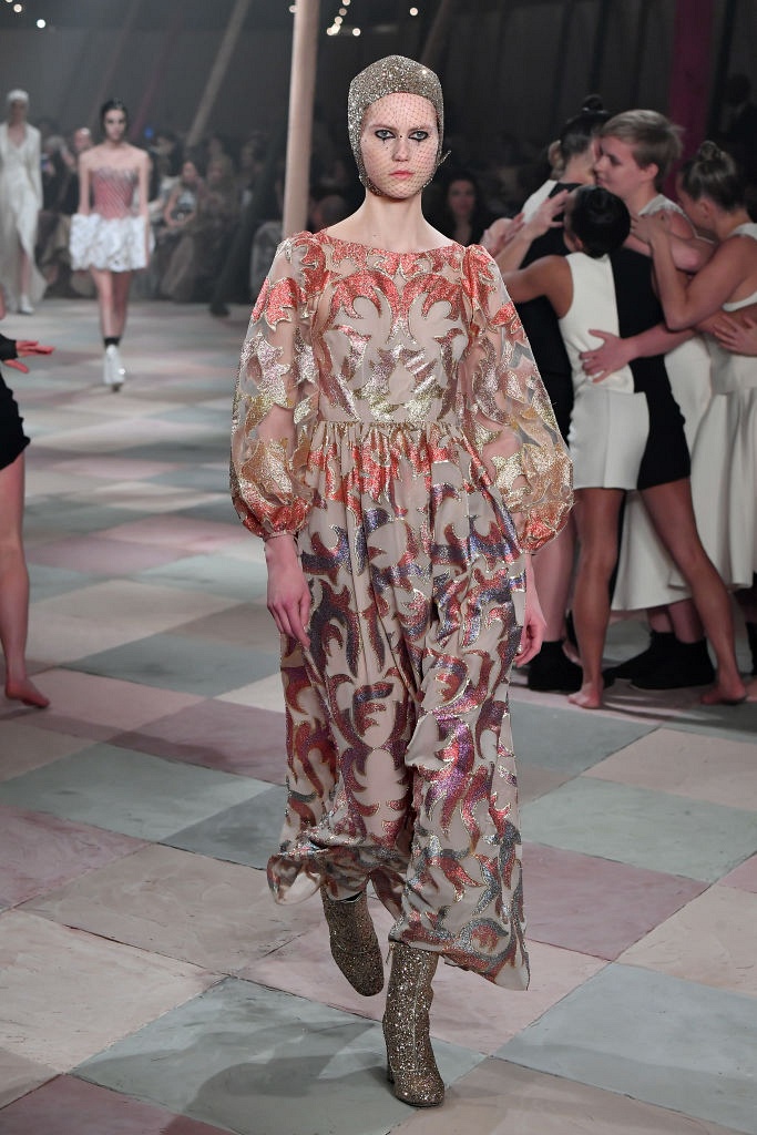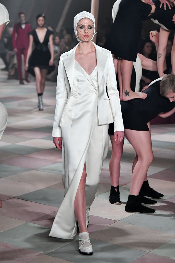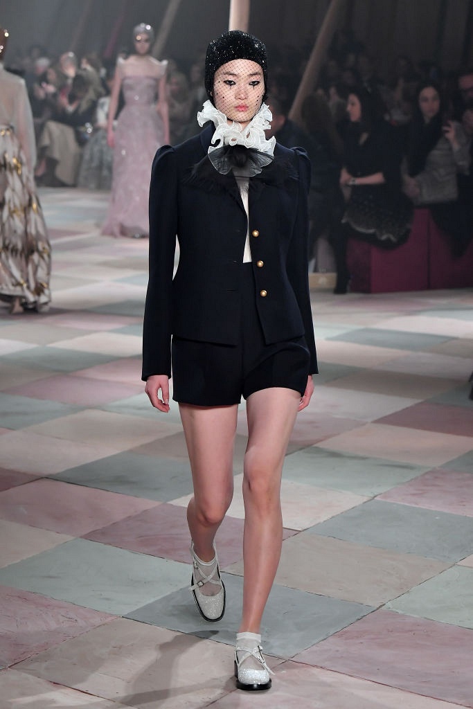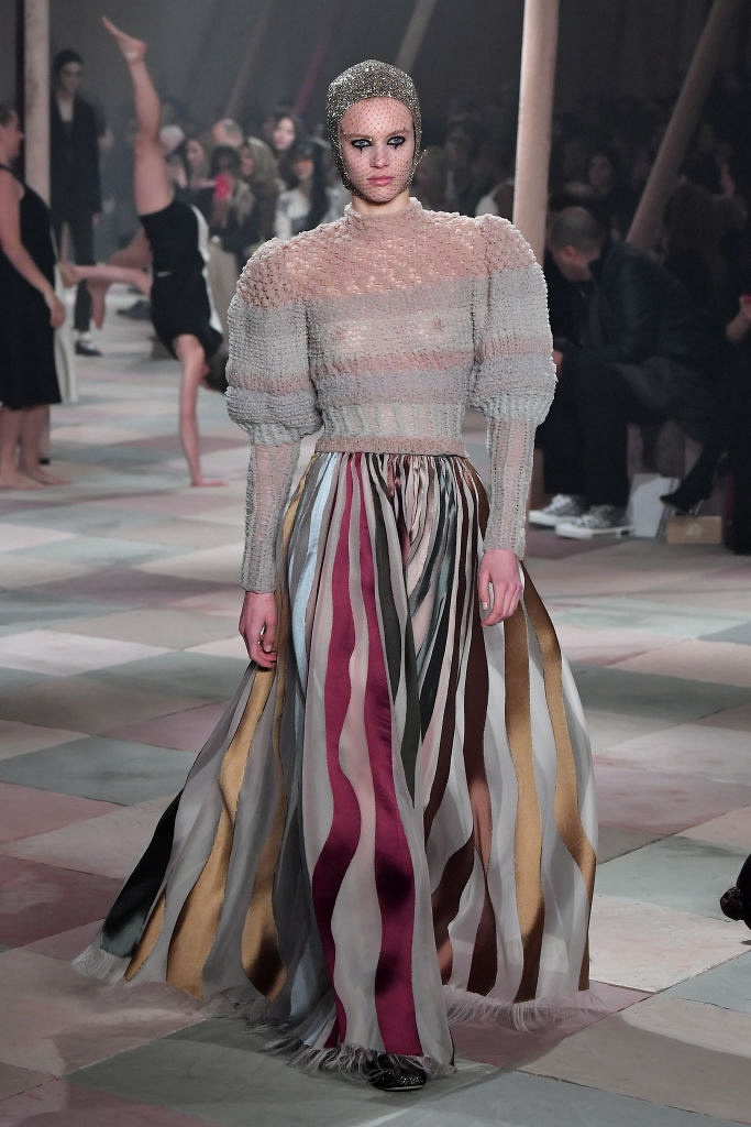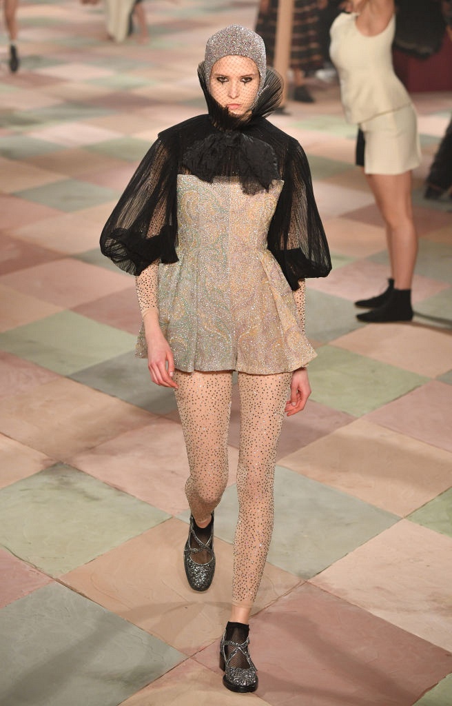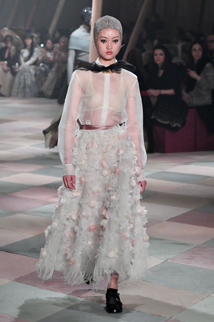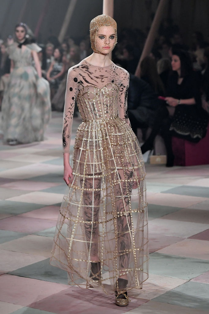 Несмотря на выбранную тему, коллекция Christian Dior Haute Couture получилась сдержанной и изысканной: струящиеся силуэты, воздушные блузы, полупрозрачные материалы и обильная драпировка. На контрасте с черными костюмами из плотной ткани, платья с легким сиянием смотрелись еще более воздушно. Особое внимание заслуживают головные уборы с вуалью, напоминающие кутюрную версию балаклав.