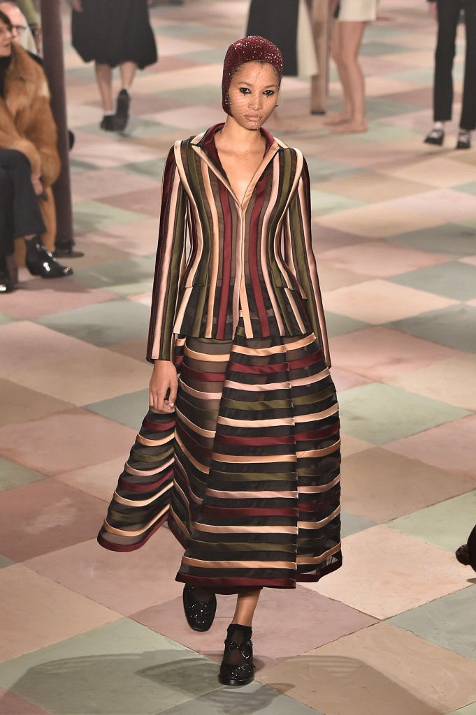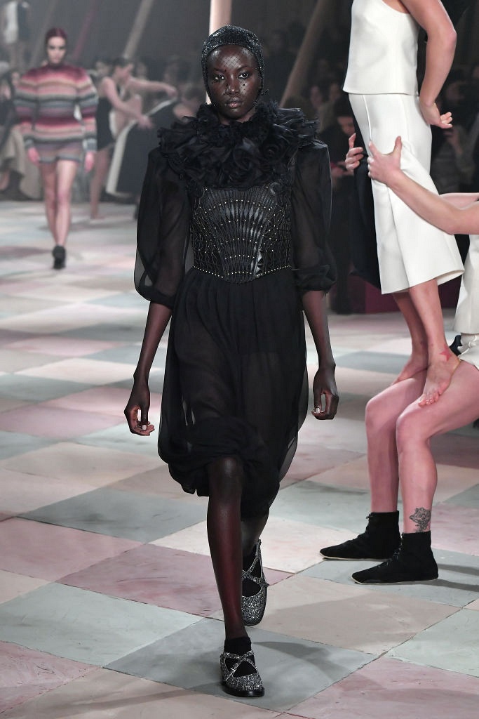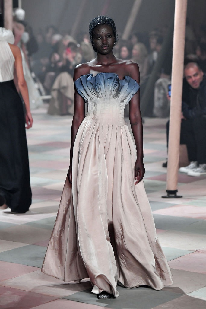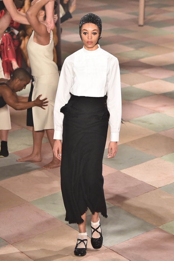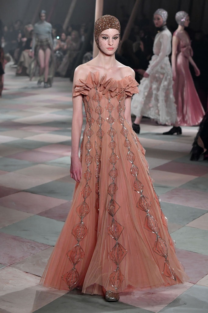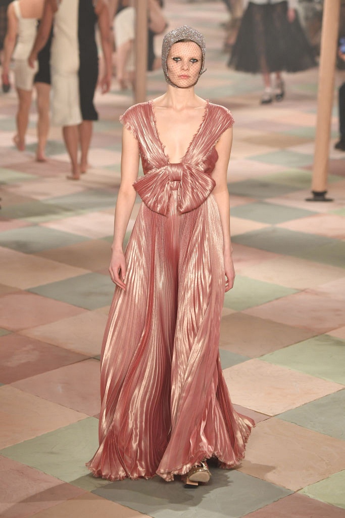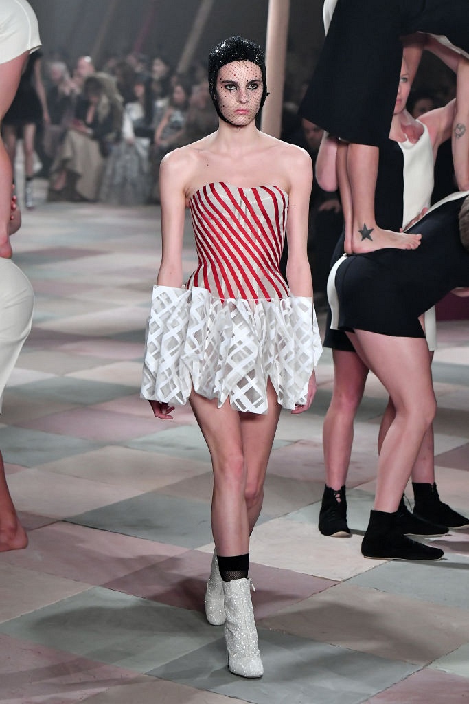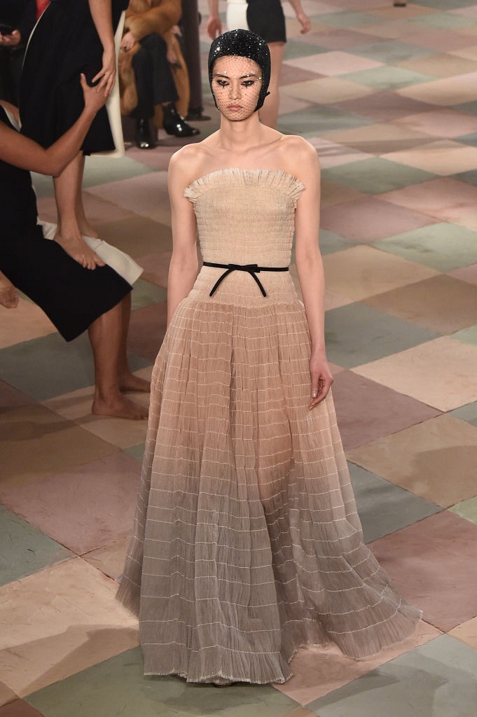 Несмотря на выбранную тему, коллекция Christian Dior Haute Couture получилась сдержанной и изысканной: струящиеся силуэты, воздушные блузы, полупрозрачные материалы и обильная драпировка. На контрасте с черными костюмами из плотной ткани, платья с легким сиянием смотрелись еще более воздушно. Особое внимание заслуживают головные уборы с вуалью, напоминающие кутюрную версию балаклав.