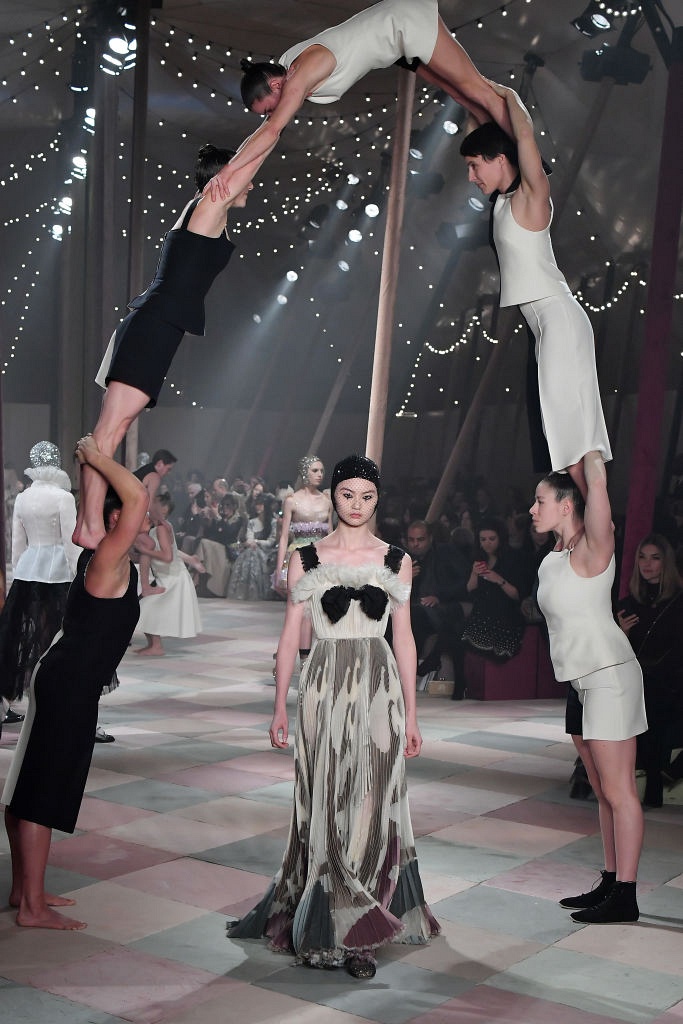 Вчера стартовала Парижская неделя моды, которую открыл бренд Schiaparelli. Знаковым стал и показ Christian Dior который начался с перформанса акробатов, сооружающих различные фигуры из своих тел. Они органично стали частью шоу и этюды не прекращались до самого конца. Метафора цирка давно нашла отражение в моде: костюмы, глиттер, широкие штаны и объемные вороты. Мария Грация Кьюри черпала вдохновение в искусстве Жана Кокто, Пабло Пикассо, Синди Шерман и Ричарда Аведона — все они, так или иначе, затрагивали тему цирка в своих работах. Дизайнер, создавшая футболки со слоганом «We should all be feminists», снова обратилась к феминизму: на вчерашнем показе акробатки держали на плечах женщин, как бы намекая, что это вовсе не трудно и все они сестры.