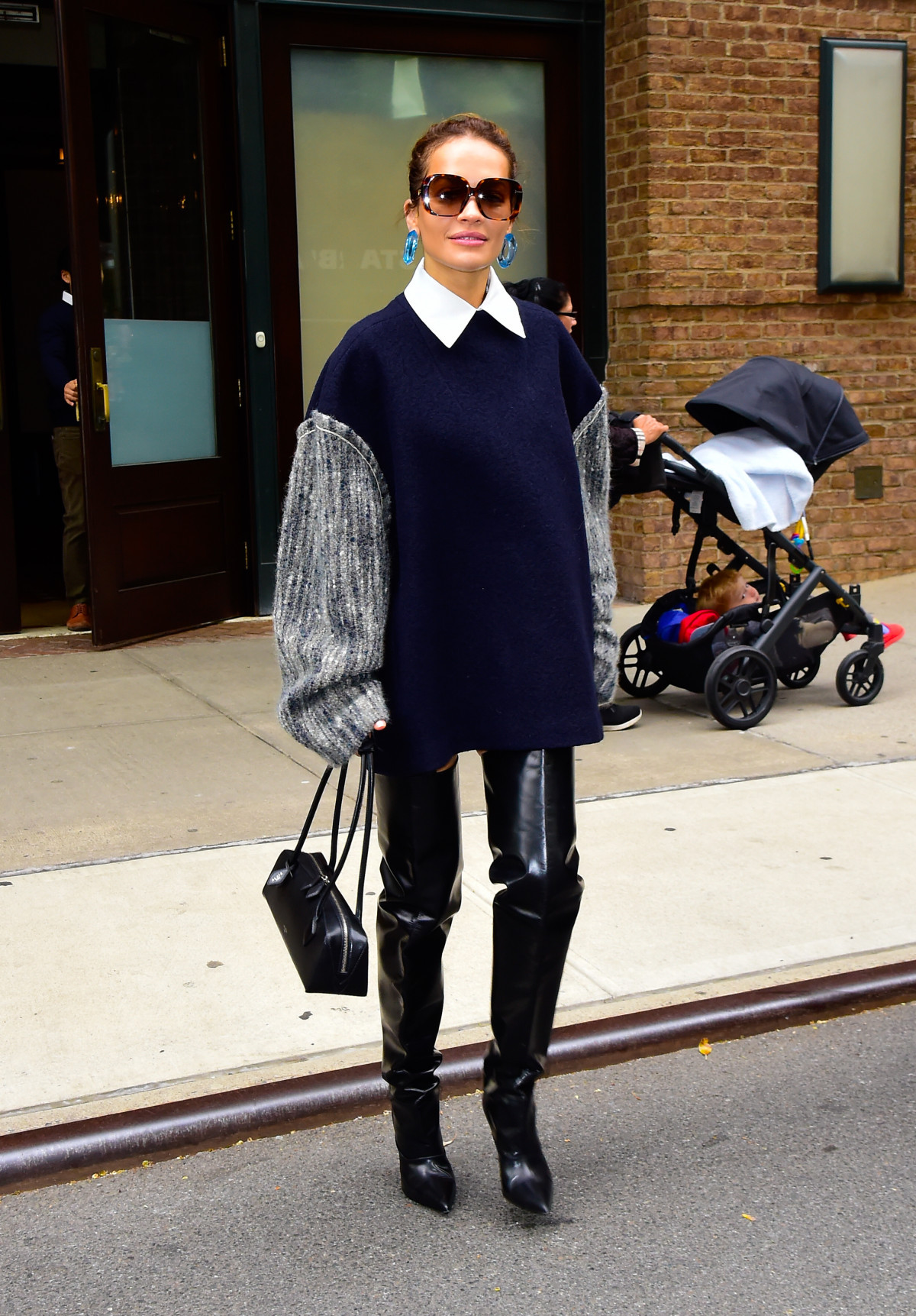 Перед Met Gala Ріта Ора гуляла вулицями Нью-Йорку в темно-синьому светрі Nebula від LITKOVSKA з колекції Pre-Fall — 2024.