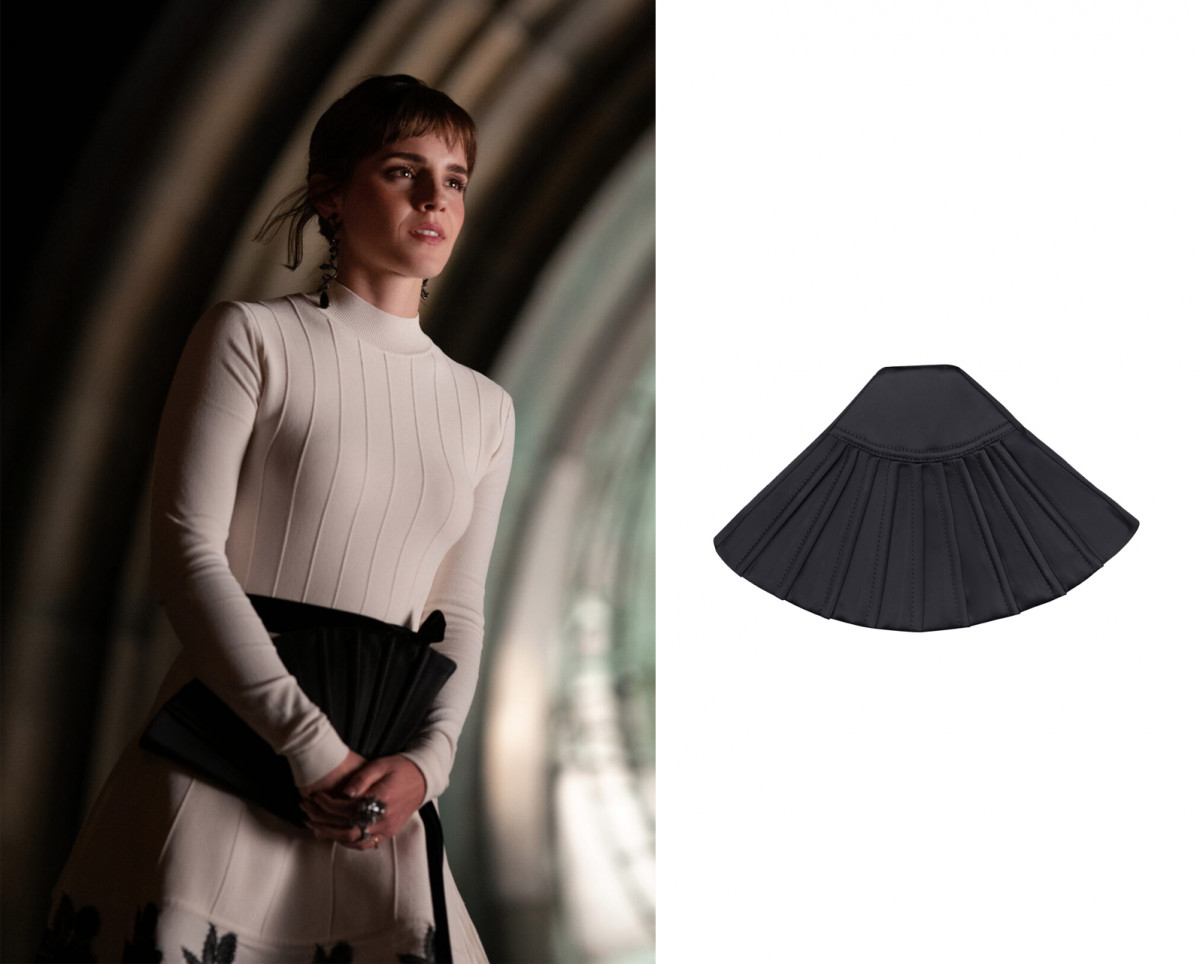 1 января на экраны выходит спецэпизод серии фильмов о Гарри Поттере. В нем Эмма Уотсон появляется в белом платье в рубчик с черной гипюровой вышивкой. Наряд актриса дополнила клатчем украинского бренда BEVZA Mini Fan Clutch, выполненным в виде веера. Аксессуар идеально вписывается в образ Эммы, повторяя форму юбки А-силуэта.