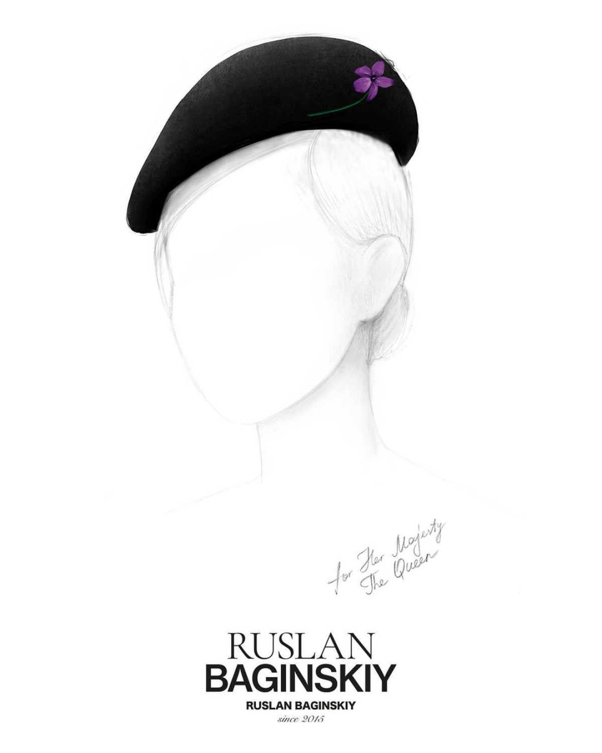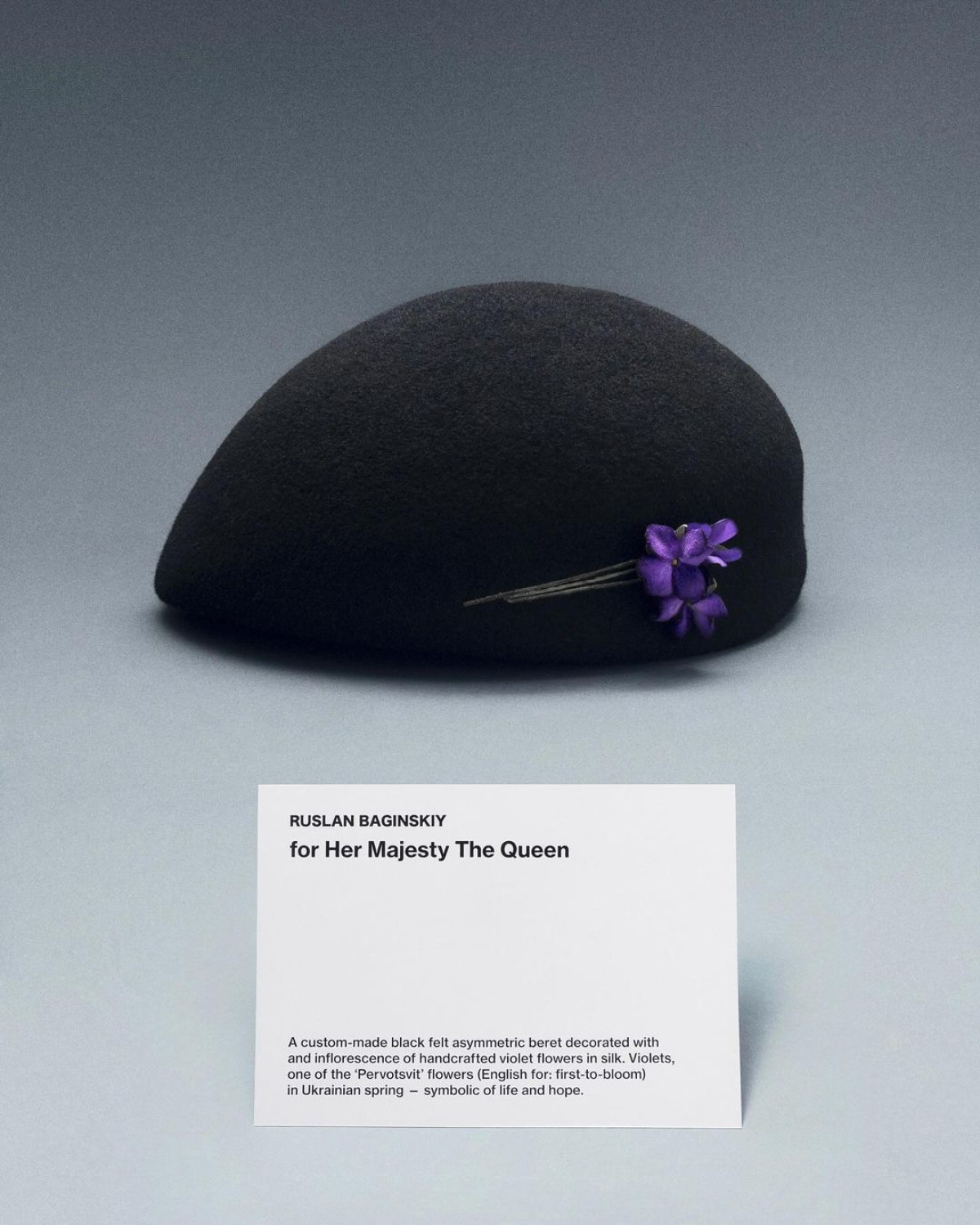 Для королеви та принцеси дизайнер створив абсолютно різні капелюшки. Її Величність отримає чорний вовняний берет асиметричної форми, прикрашений суцвіттям шовкових фіалок ручної роботи. «Фіалки — квітки “Первоцвіту” — символи життя та надії», — написав Руслан Багінський.