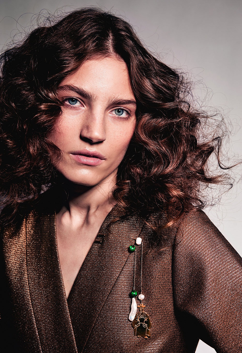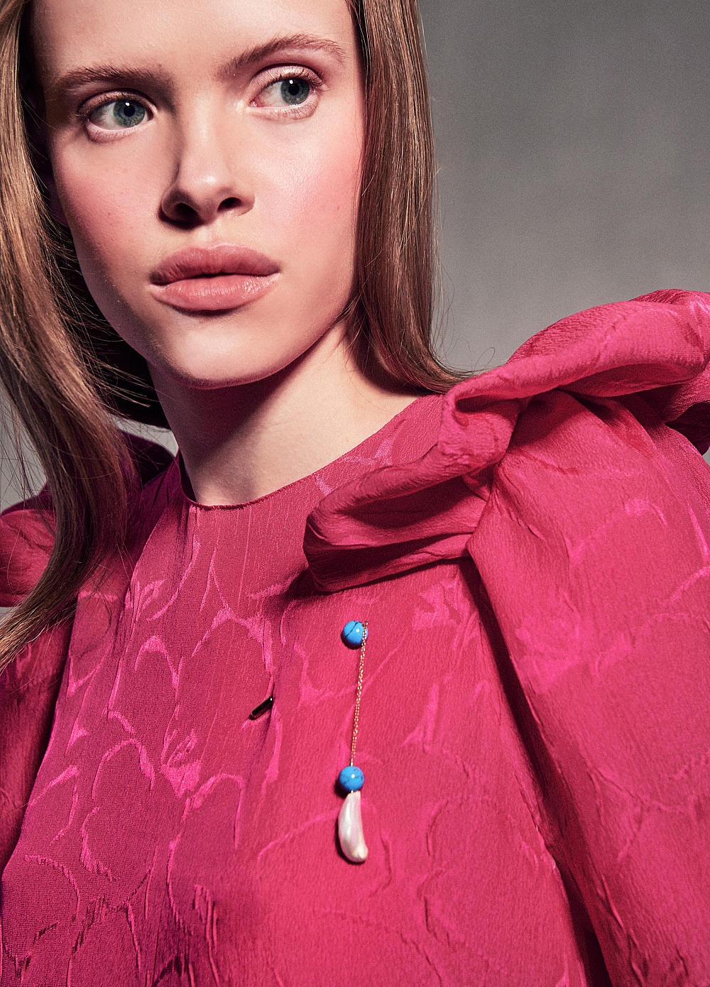 В коллекции также использована бирюза — это символ любви и нежности, которую у народов Азии преподносили как знак чувственного влечения, и малахит, который, по поверью, лечит от меланхолии. Сочетание всех элементов, соединенных тонкими цепочками, подчеркивает глубину женского начала и является талисманом, защищающим от сложностей внешнего мира.