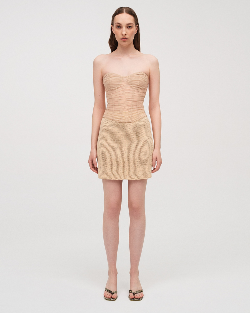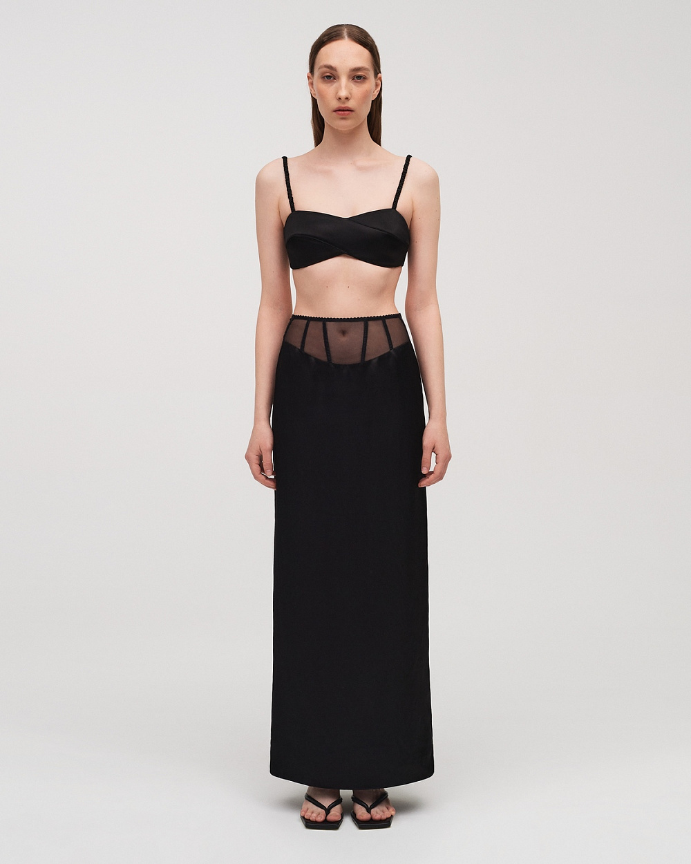 В лінії топів представлений новий бра у формі перевернутої вісімки — впізнаваний дизайн, що вперше з’явився у Main Collection бренду. Базові майки в трьох кольорах виконані з модалу, що створюється з целюлози евкаліптового дерева. Топ-корсет оздоблений драпуванням, а одна зі спідниць — корсетними елементами, що посилюють інтелігенту відвертість.