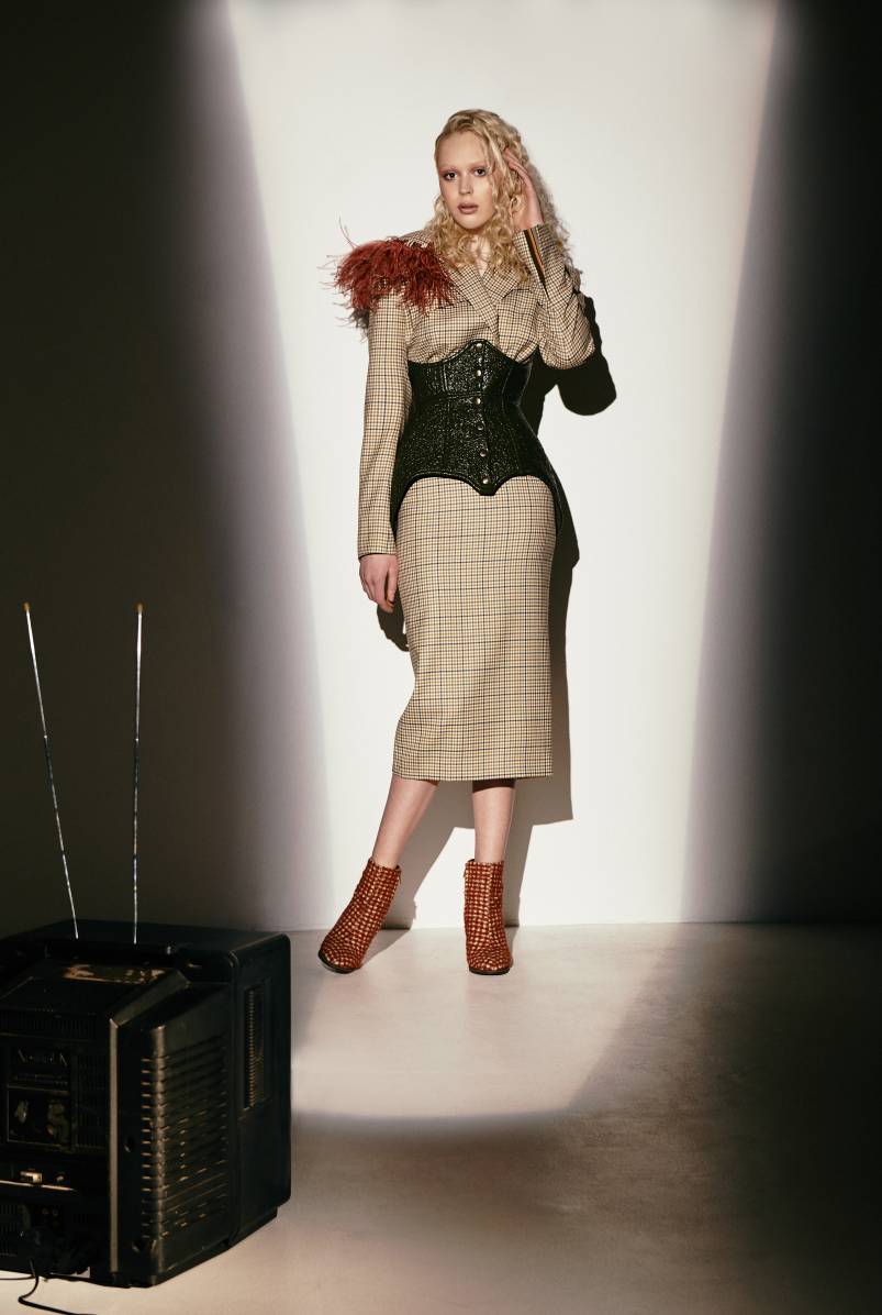Свободу и женственность в образах подчеркивают бюстье, высокие талии и тугие пояса. Раскованную же сторону коллекции уравновешивают брючные костюмы, дополненные уютными свитерами с высоким горлом, пальто и длинные дубленки. Ностальгию в образах вызывают аксессуары - варежки на веревочках, поясные сумки и, конечно же – корсеты.