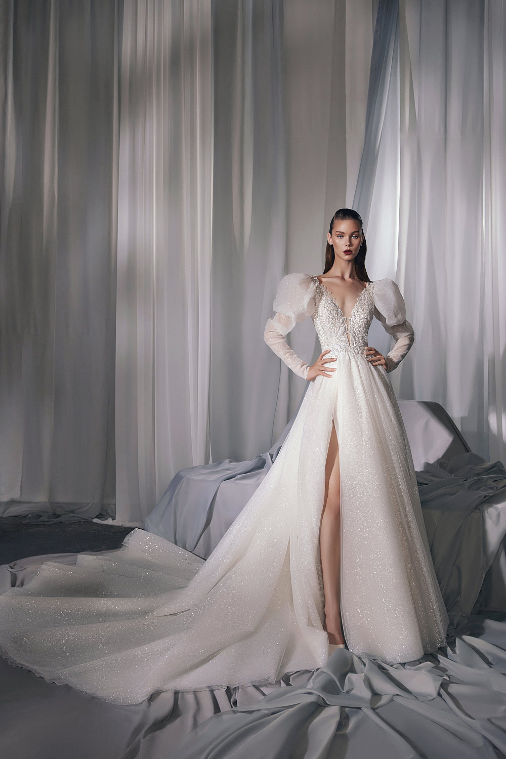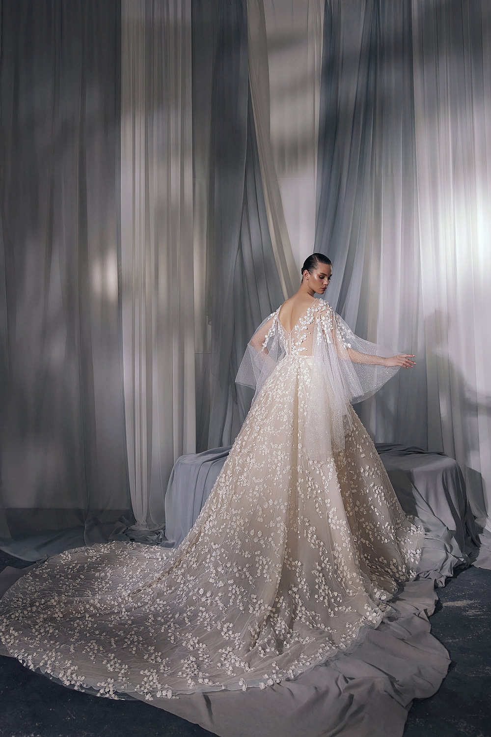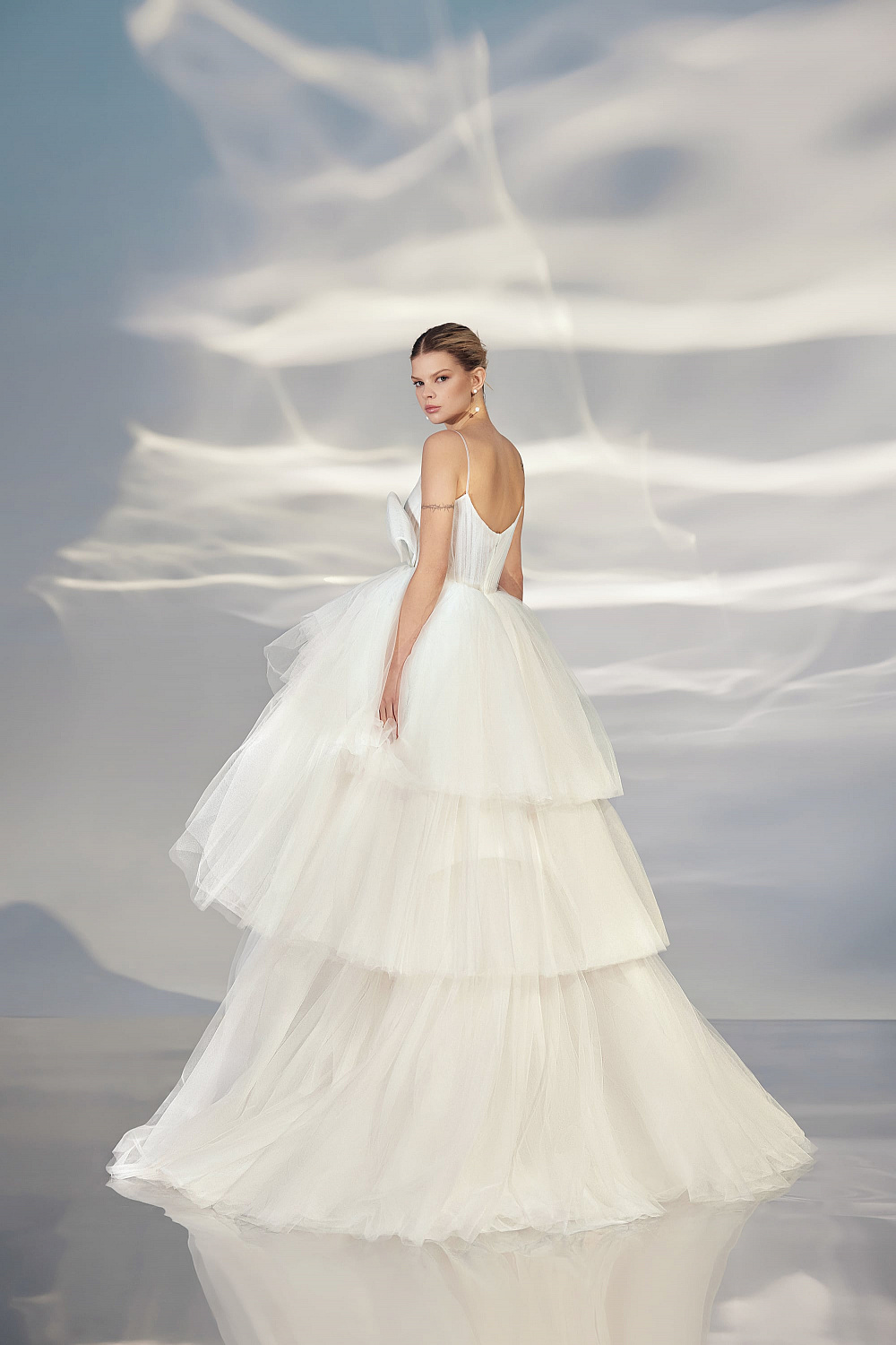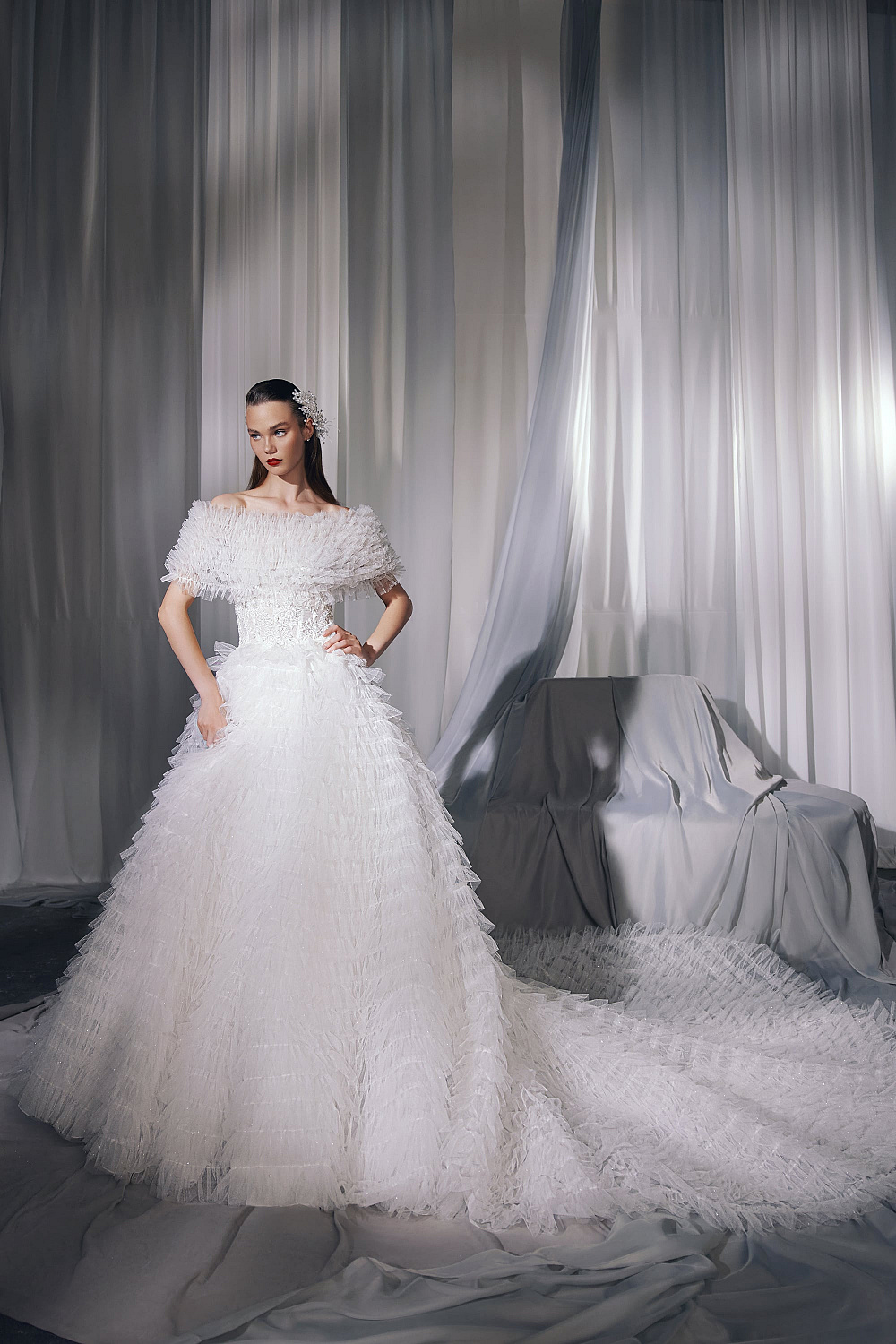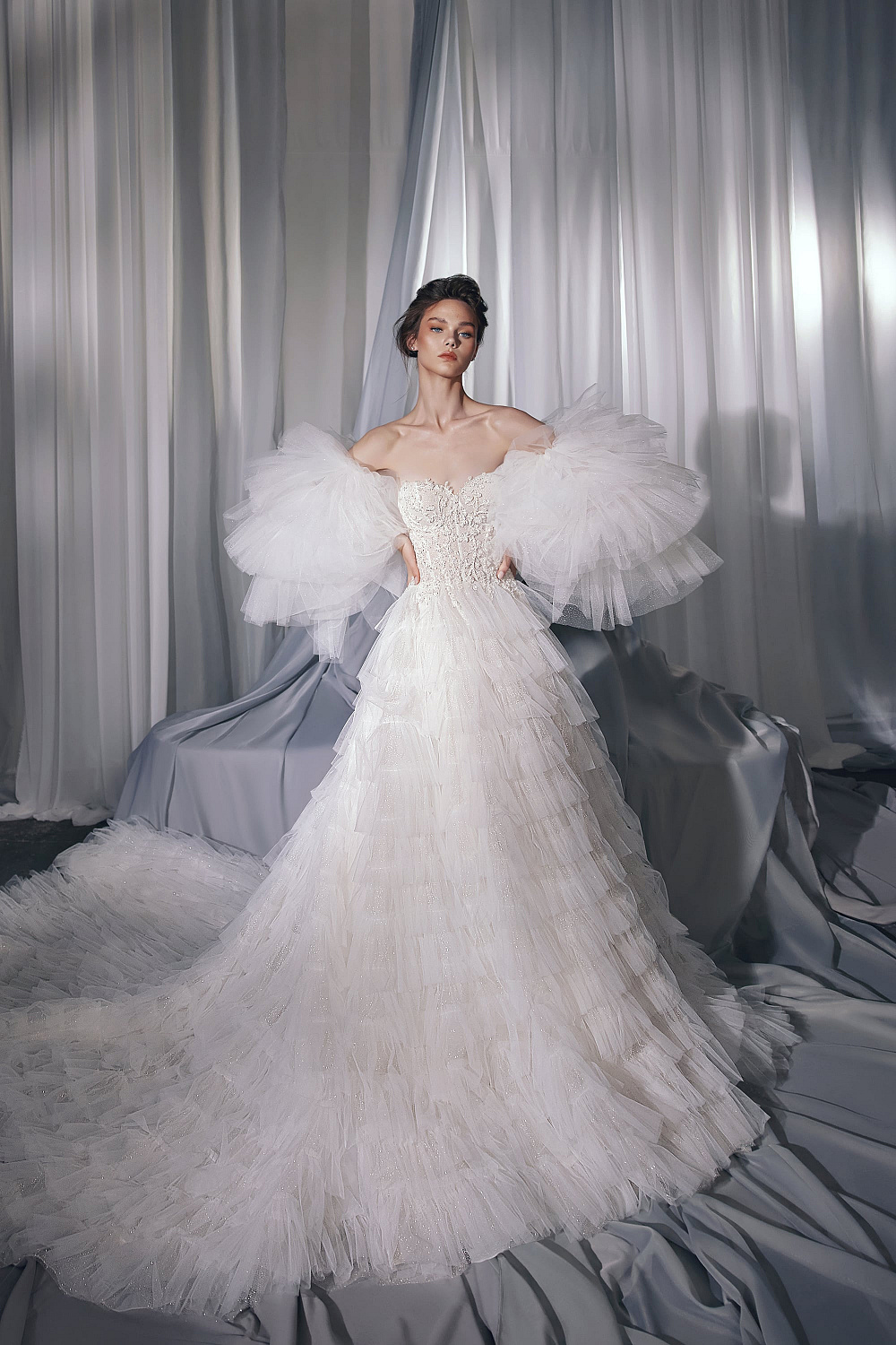 До Carfelli входить лінійка Goddess — оздоблені вишивкою, блискітками та бісером пишні сукні з довгим шлейфом.