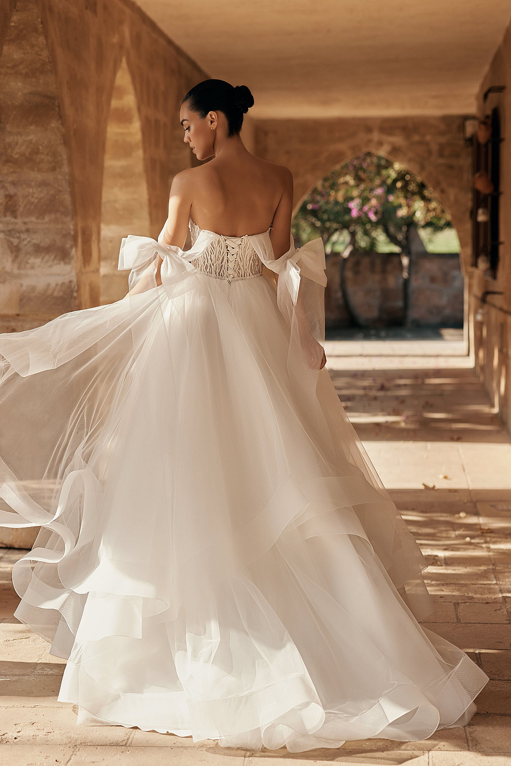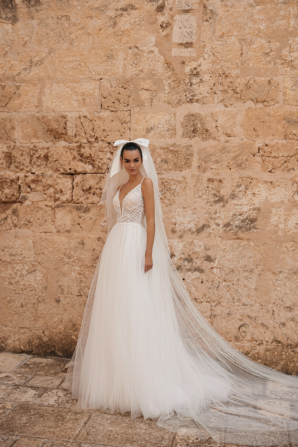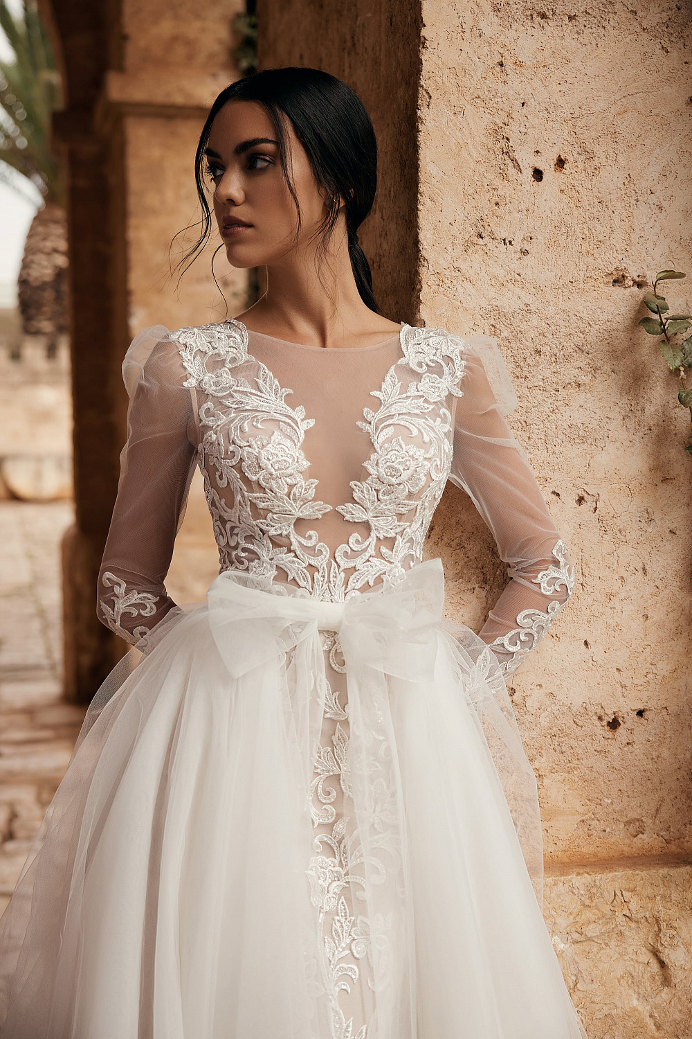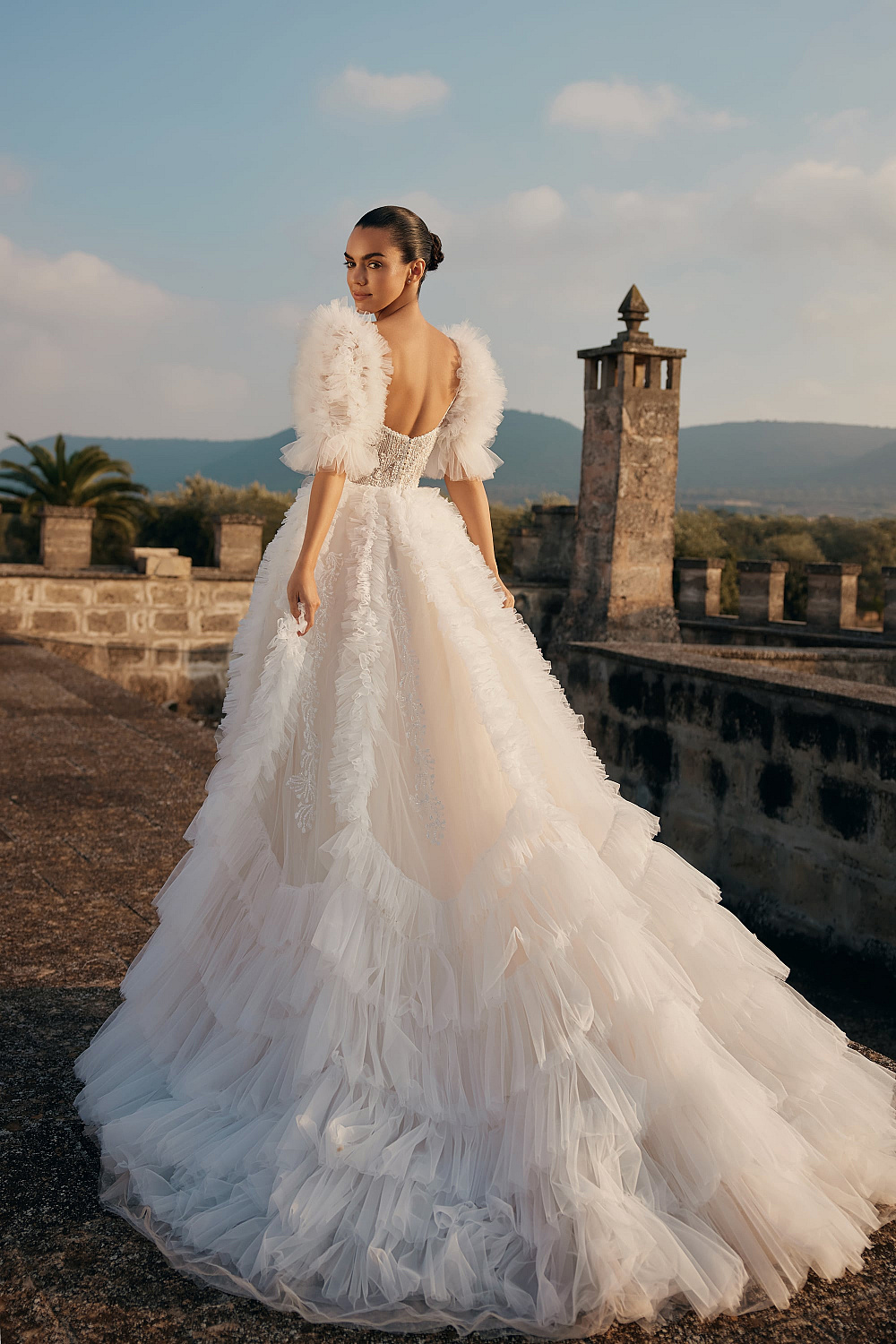Обравши сукню Madioni, наречена отримає витончений ніжний образ у традиційному весільному стилі.