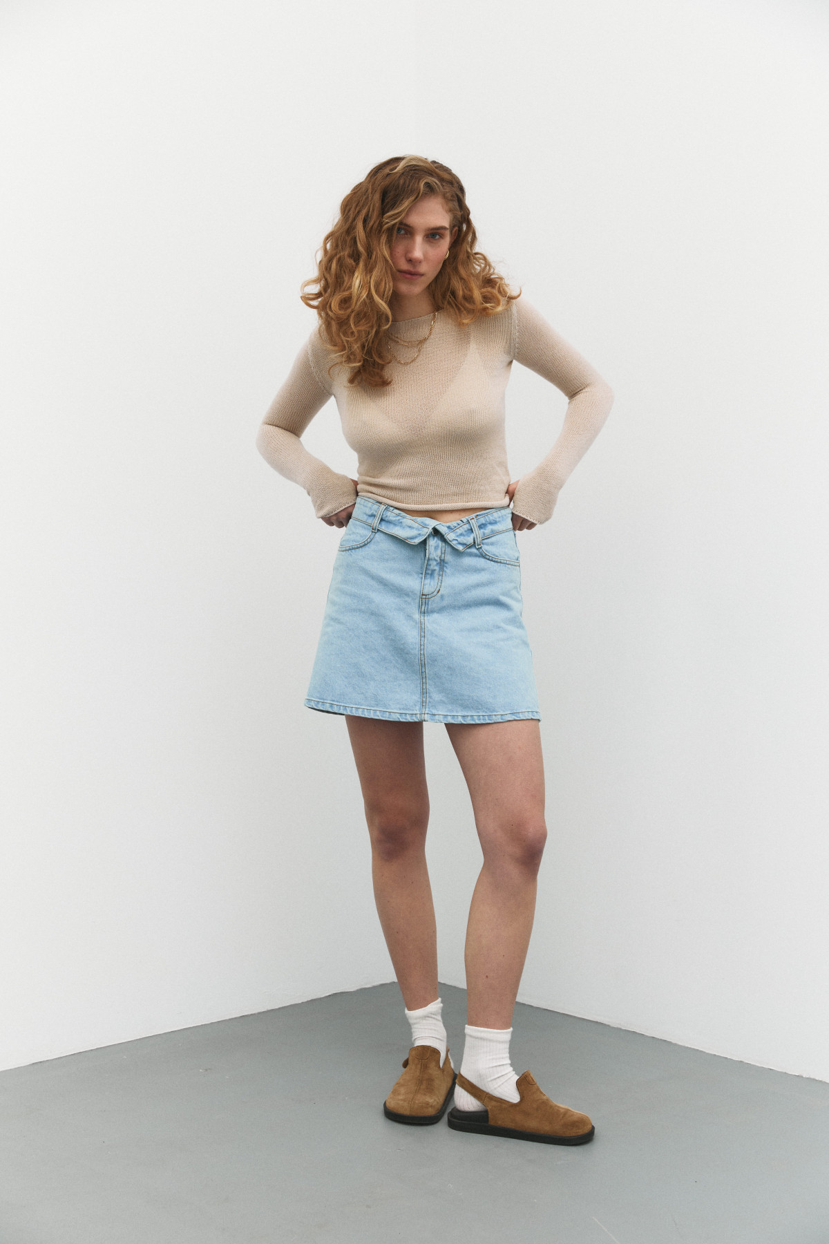 Також нова лінійка доповнена асиметричною спідницею на ґудзиках та спідницею-шортами, що виконані у ніжно-блакитному кольорі, який зараз є дуже актуальним.