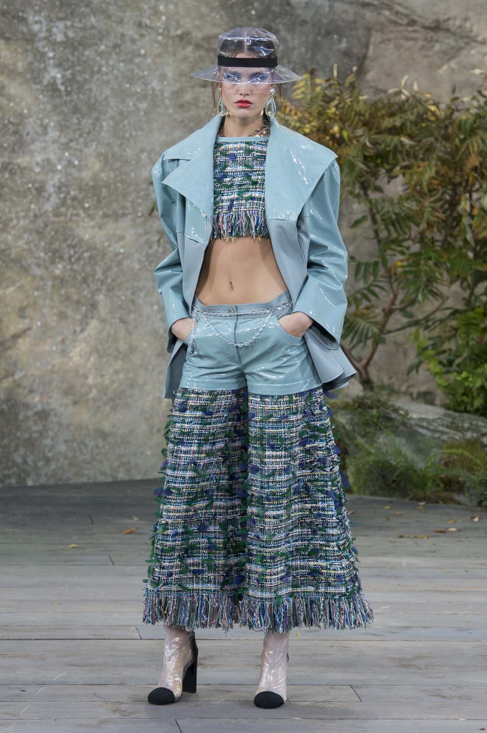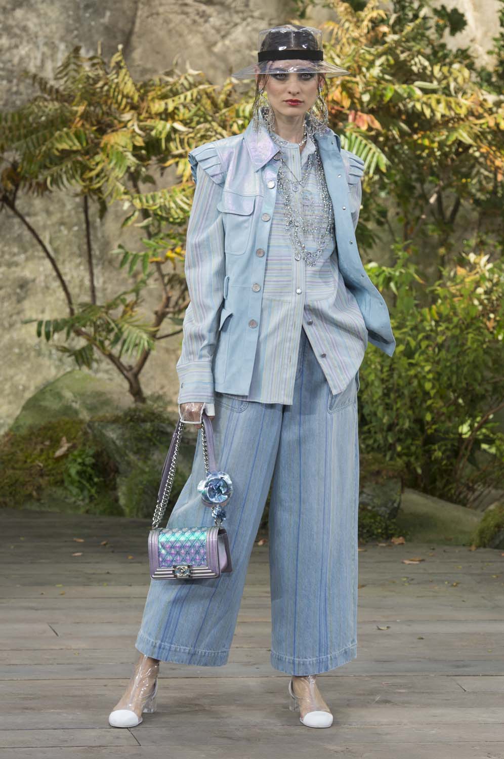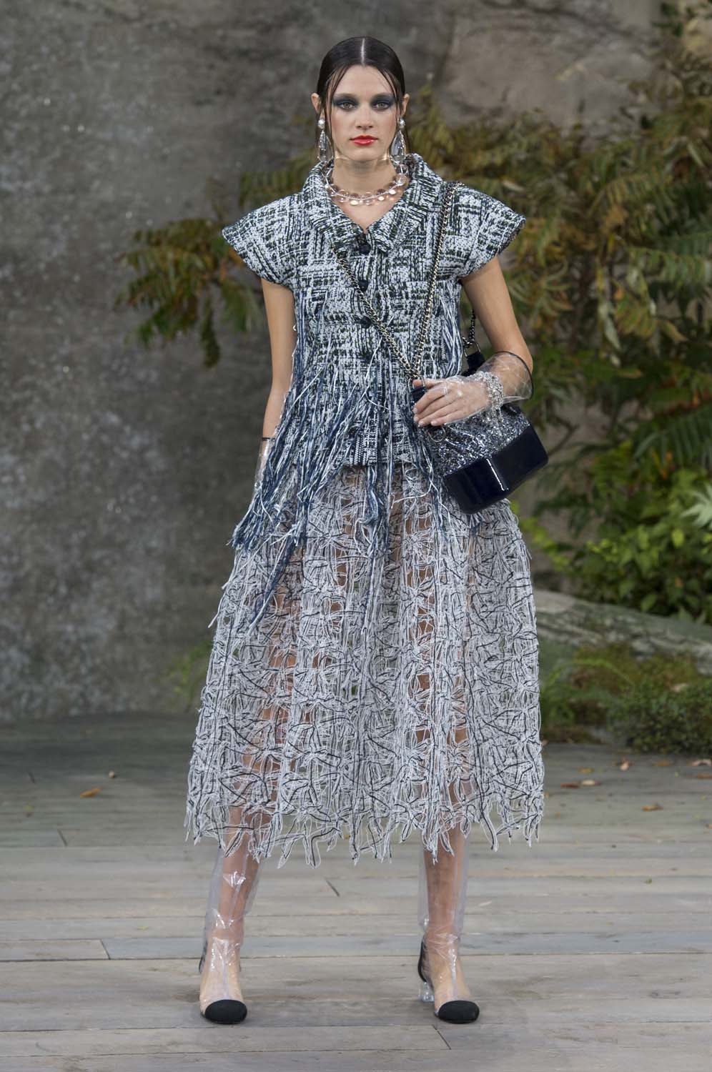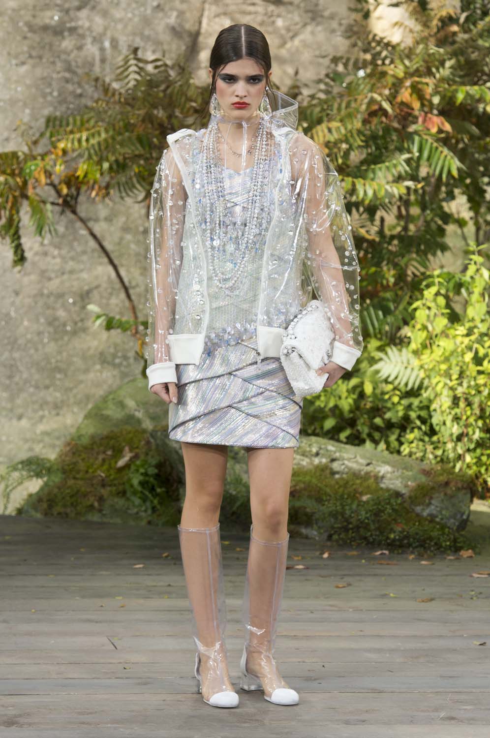 Главной вещью коллекции Chanel стали прозрачные ботфорты, которые имитируют высокие резиновые сапоги (как раз для визитов на водопады). Не обошлось без традиционных твидовых платьев и костюмов, жемчужных бус и монограмм. Также в коллекции можно увидеть вещи денима: последний раз джинсовые модели Chanel демонстрировали в коллекции 2008 года.