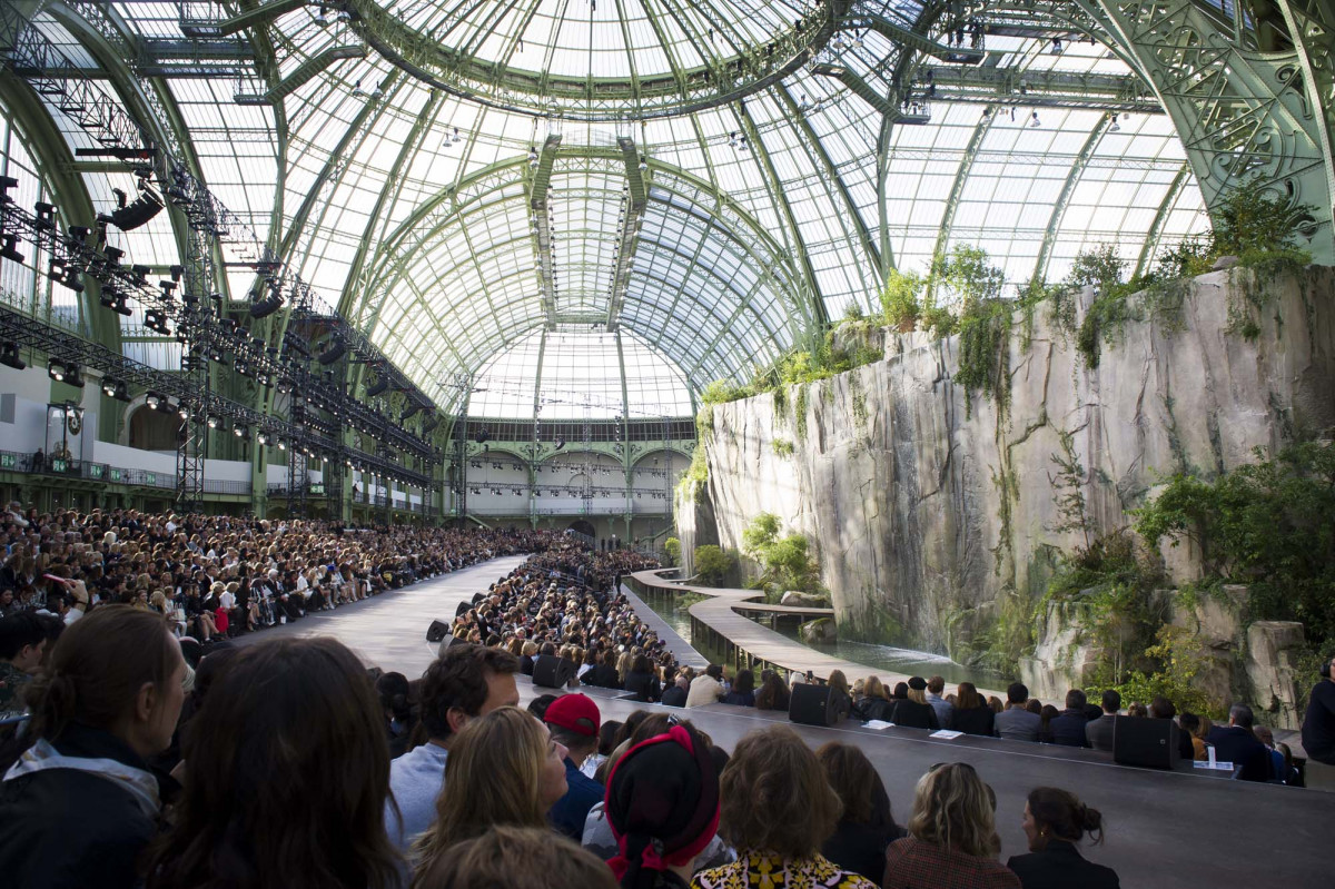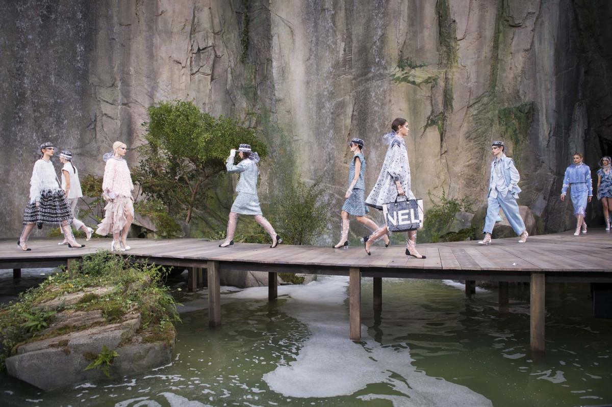 Для презентации кутюрной коллеции Chanel Карл Лагерфельд соорудили в Гран-Пале Эйфелеву башню, а на показе осенне-зимней коллекции запустили ракету с логотипом модного дома. Что дальше? Пространство для шоу весна-лето 2018 превратили в край водопадов с искусственно созданными скалами и тропическими лесами. Открыть показ доверили 16-летней Кайи Гербер, дочери Синди Кроуфорд, для которой этот сезон стал дебютным.
