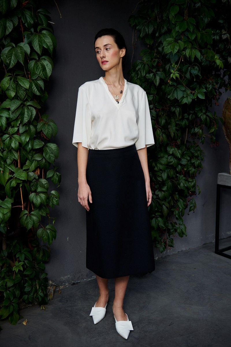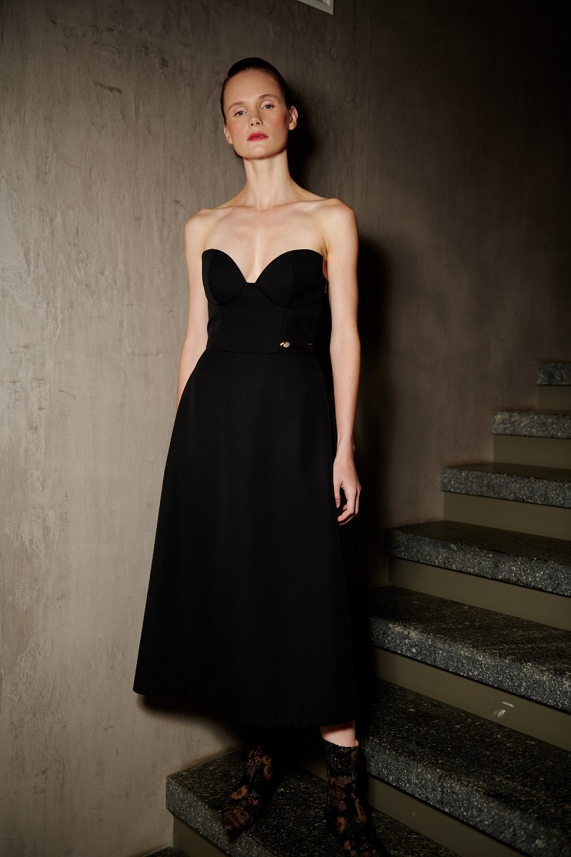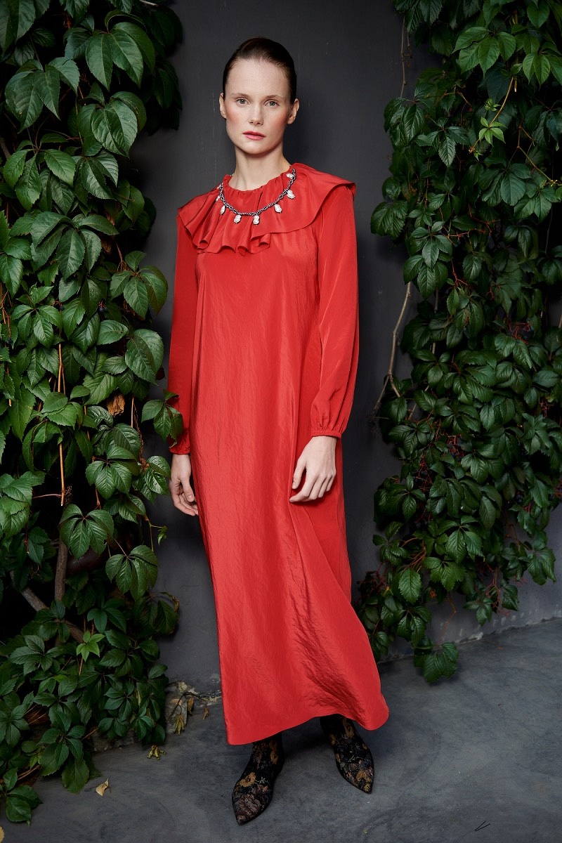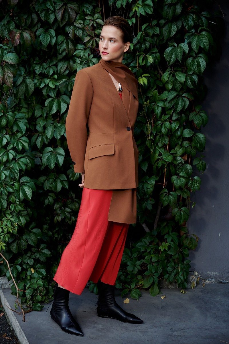 Силуэты — четкие, архитектурные и геометричные, подчеркнутые декором и тканями: например, вышивкой ришелье, которая украшает и шелковую, и шерстяную одежду. В качестве реверанса традиционному украинскому костюму в коллекции присутствуют корсетка, вышивка — например, цветов мака, шерстяные костюмы с юбками, сделанными по принципу плахты, и вариации на тему нижней длинной сорочки, которую надевали под основное платье.