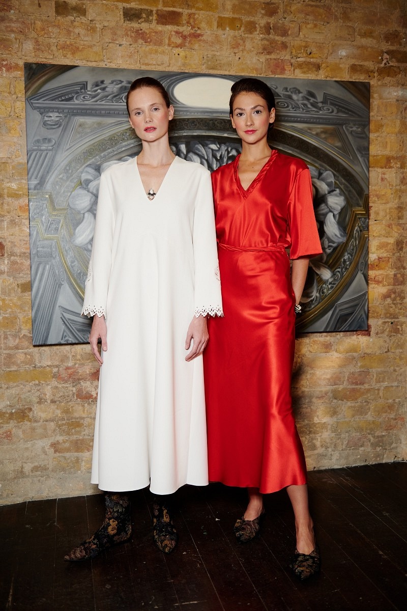 Дизайнеры работали с шелками разных фактур: так, появляется классический для Lake Studio сатин в нескольких оттенках, плотный крепдешин и японский шелк, новое поколение полиэстера. Эта ткань очень адаптирована к реалиям современного мира: она не мнется и красиво драпируется, подчеркивая естественные изгибы фигуры. Представлены и образы из тонкой и плотной шерсти, а также из смеси кашемира и ангоры.