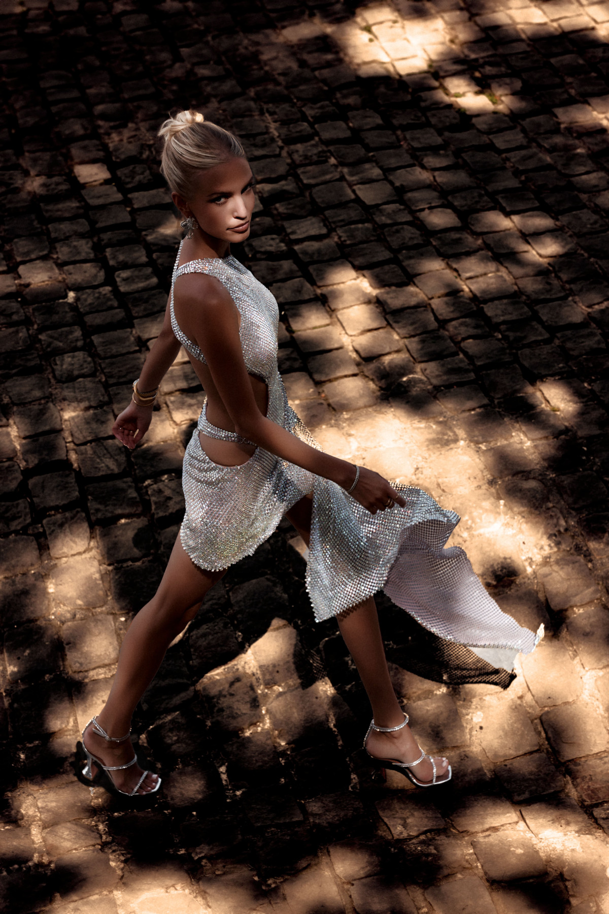 Лінійка включає дванадцять ретельно розроблених образів: міні- та максісукні підходять для урочистих виходів, спідниці зі сміливими вирізами додають нотки гостроти, а універсальні купальники виконують роль топів — максималізм у найменших деталях для незабутніх моментів. Окрім цього, з’явилися й жакети з пір’ям і, вперше в історії бренду, сумки. Кожен виріб виготовлено з фірмових тканин SANTA, створених, щоб зачаровувати напівпрозорою текстурою та гіпнотичними високоякісними кристалами.