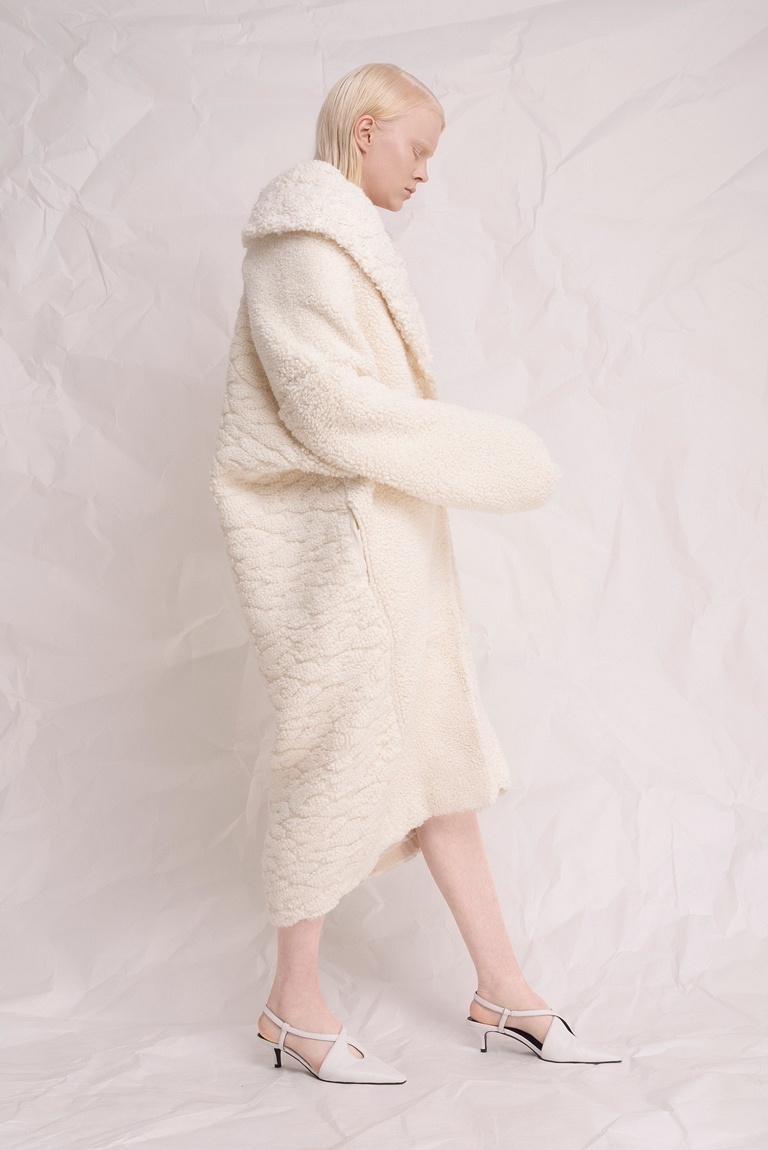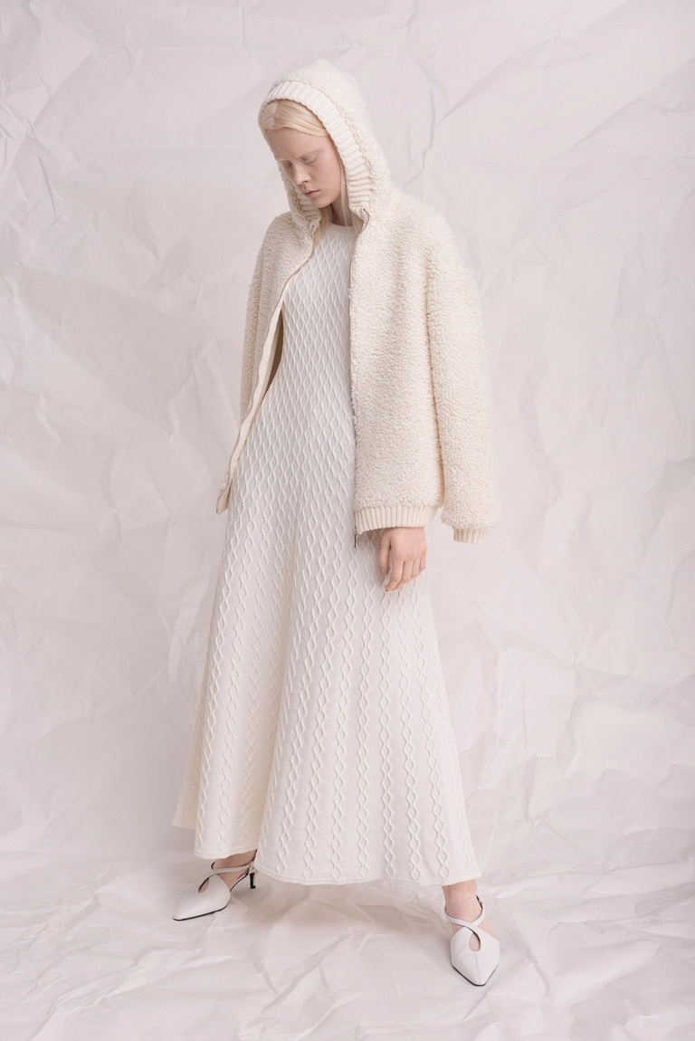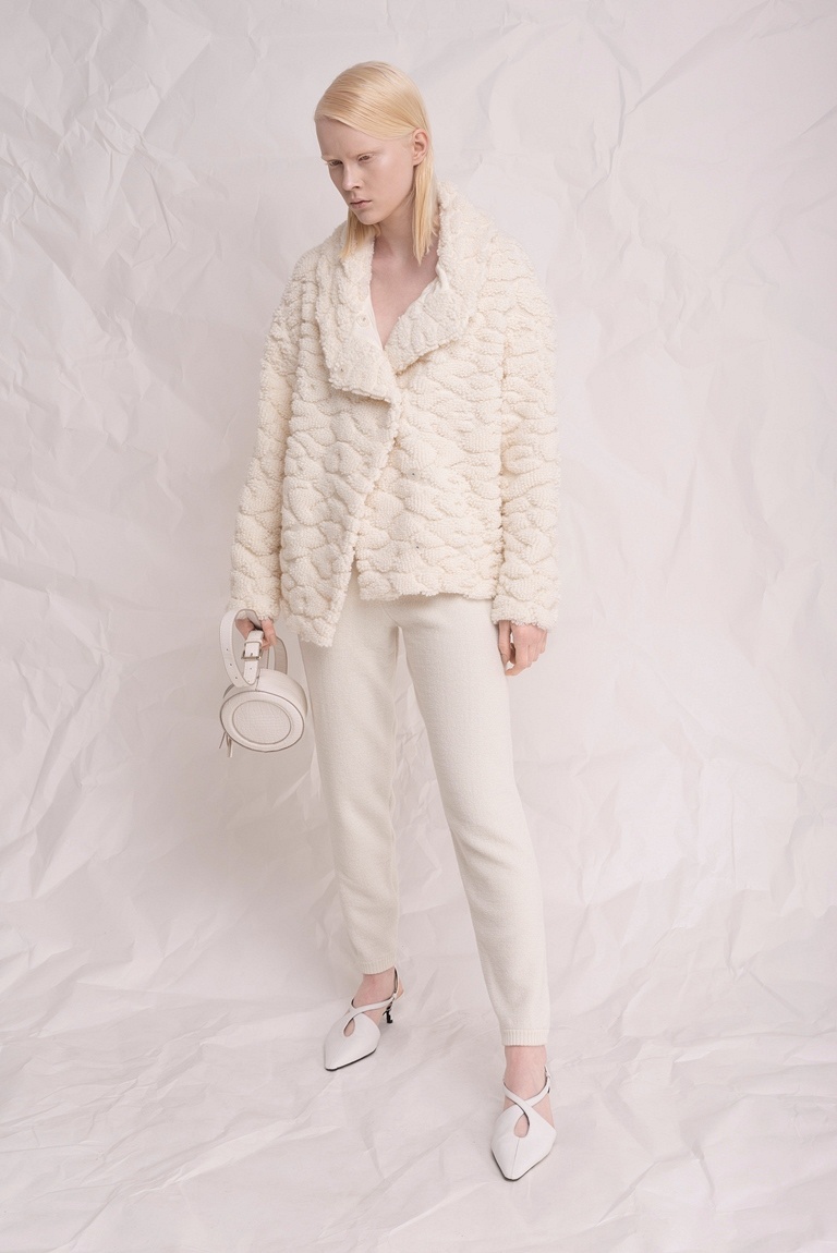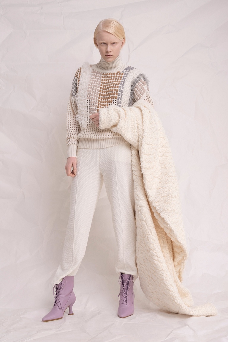 Невероятные, теплые облака мохера и шерсти, имитирующие в пальто, куртках и джемперах шкуру белого леопарда, овчину и белый мех, сочетаются с геометрическими плетениями и шнуровкой. Эти элементы своей математической точностью повторений напоминают следы исчезнувших цивилизаций на поверхности остывших пустынных планет. Будто на смену мертвому урбанистическому миру снова зарождается жизнь, будто стирая следы хищных культур, создается мир, без боли, без войн, без смерти, новый, чистый, белый.
