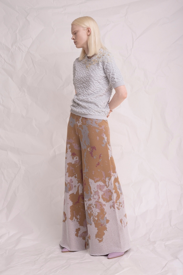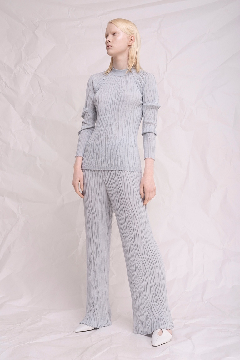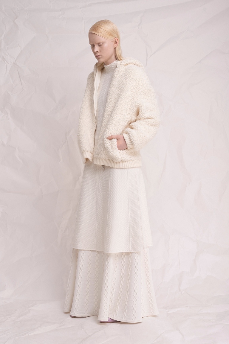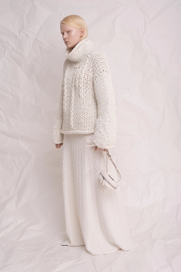 Невероятные, теплые облака мохера и шерсти, имитирующие в пальто, куртках и джемперах шкуру белого леопарда, овчину и белый мех, сочетаются с геометрическими плетениями и шнуровкой. Эти элементы своей математической точностью повторений напоминают следы исчезнувших цивилизаций на поверхности остывших пустынных планет. Будто на смену мертвому урбанистическому миру снова зарождается жизнь, будто стирая следы хищных культур, создается мир, без боли, без войн, без смерти, новый, чистый, белый.