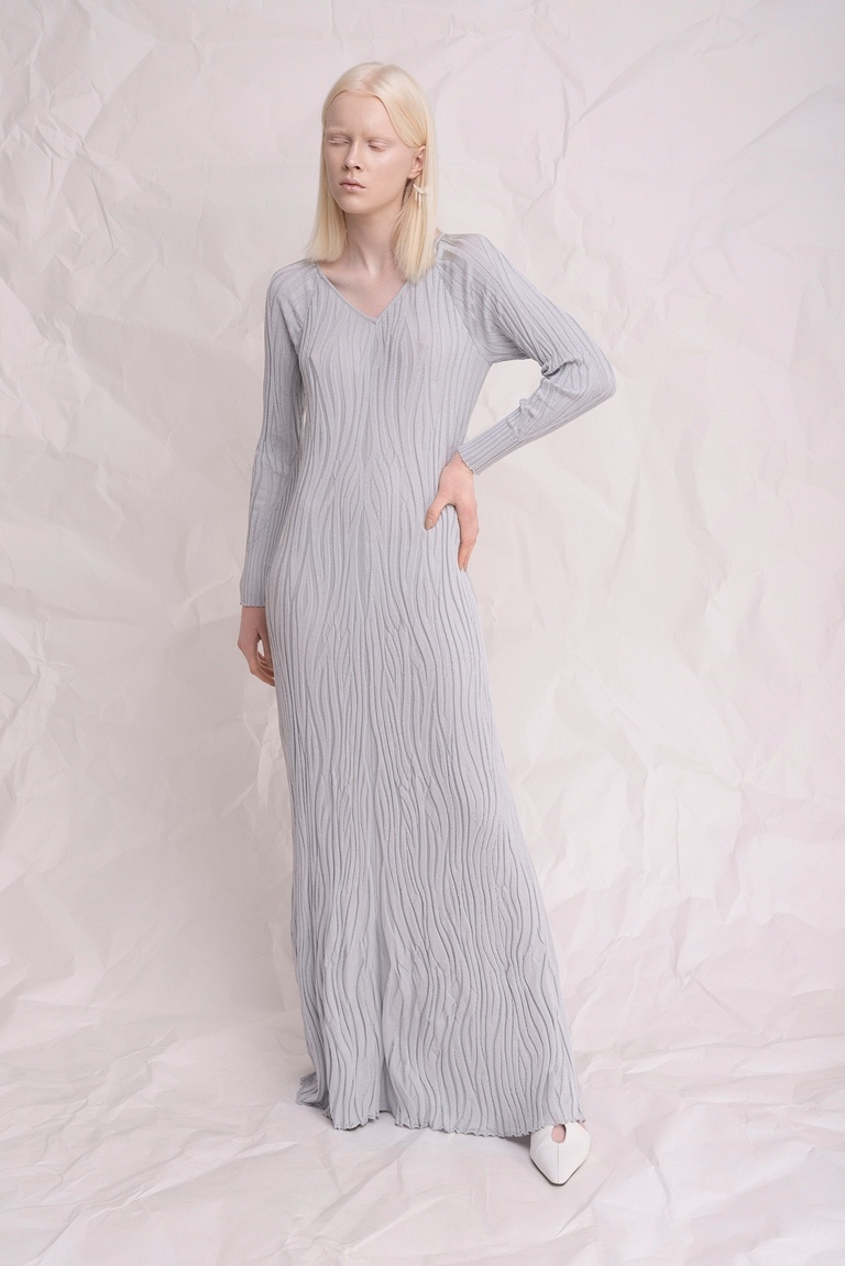 Холодные, маслянистые структуры плетений из вискозы оставляют физическое ощущение струящейся хрустальной, ледяной воды на пальцах. Живая, обволакивающая фактура играет холодными оттенками ледника, под пластом которого уже поднимается массив извержения вулканической породы. И на поверхность, набирая цвет, мощным взрывом вырывается плазма недр новой планеты, высвобождается новая сила, новая, горячая энергия.