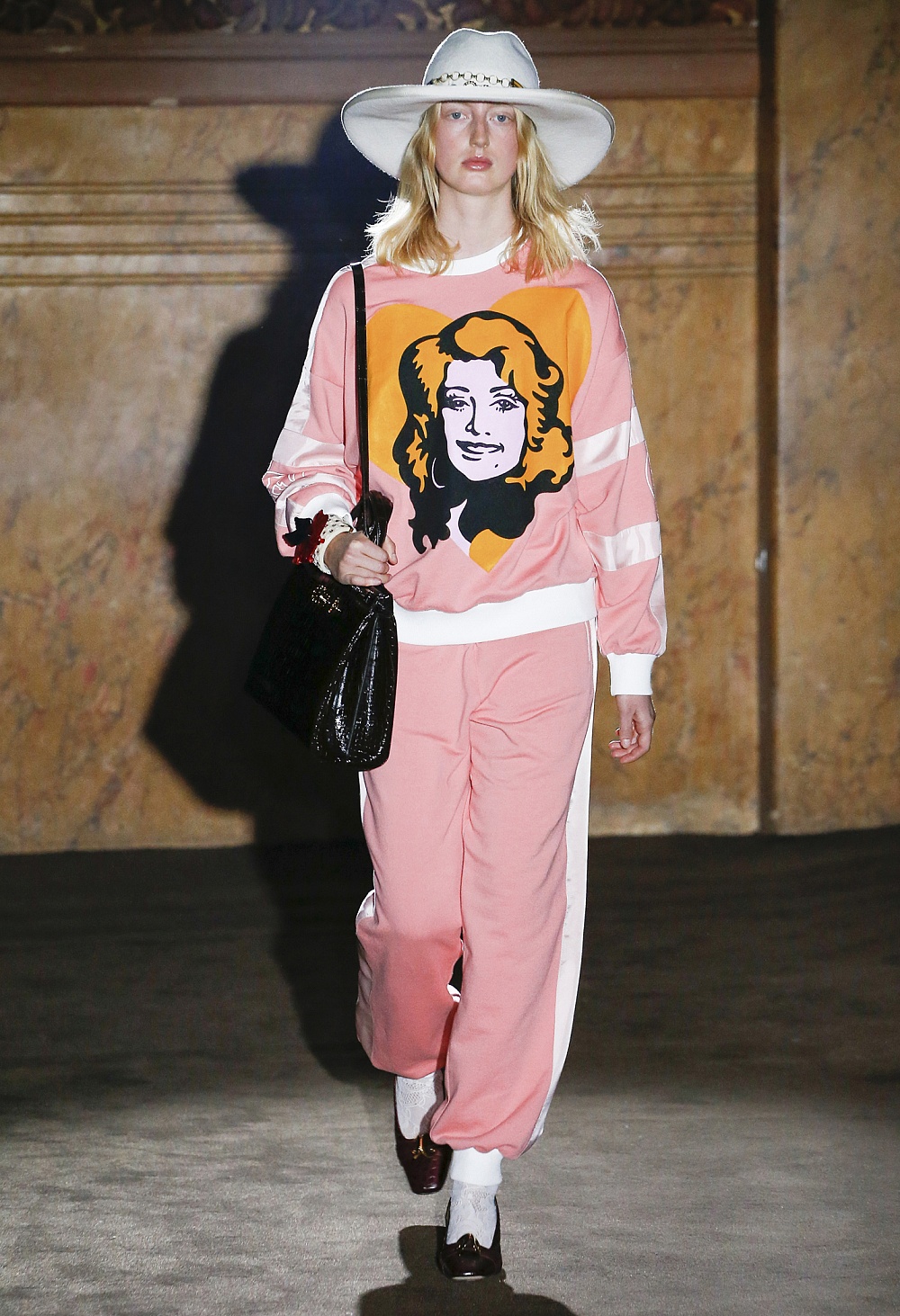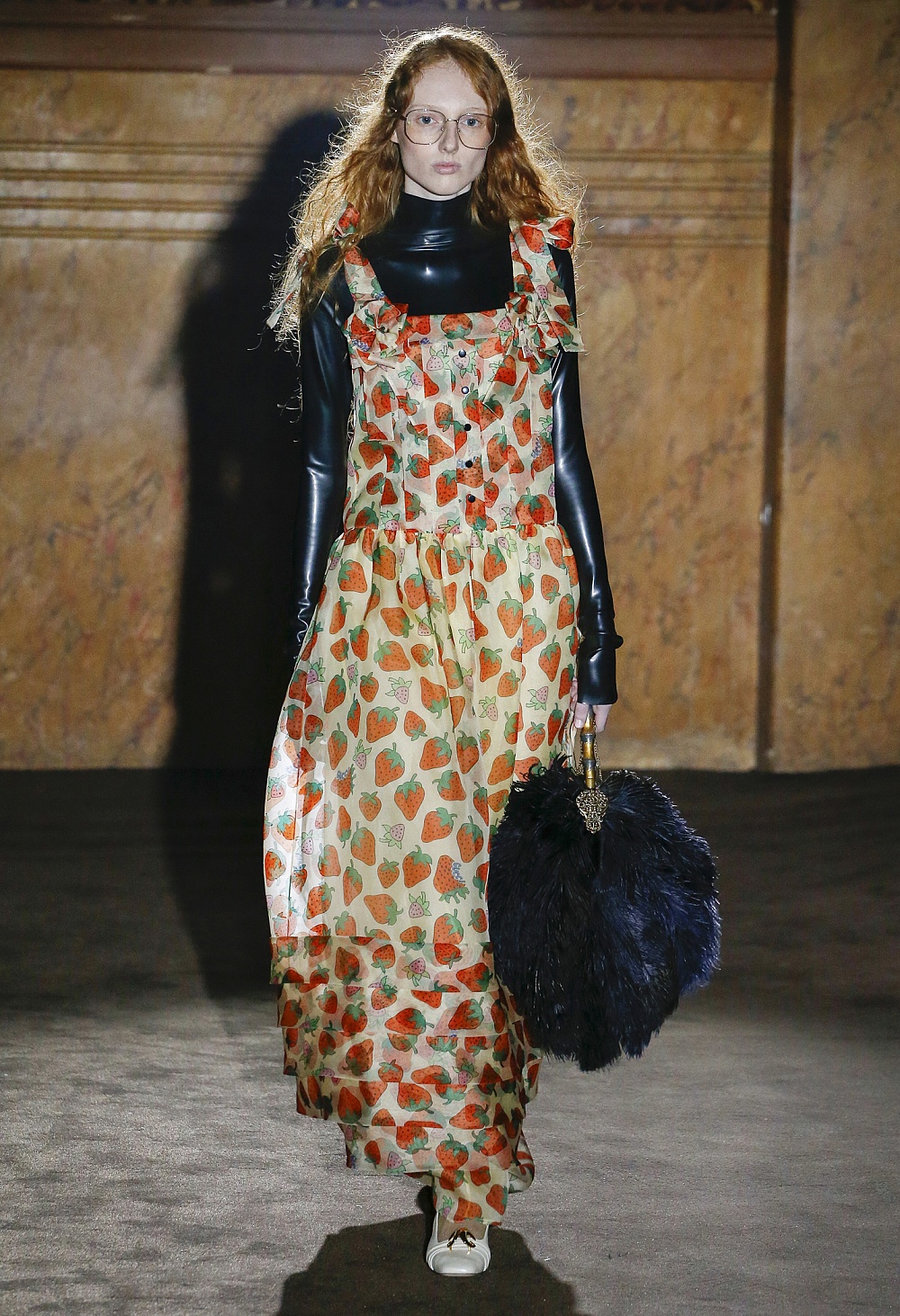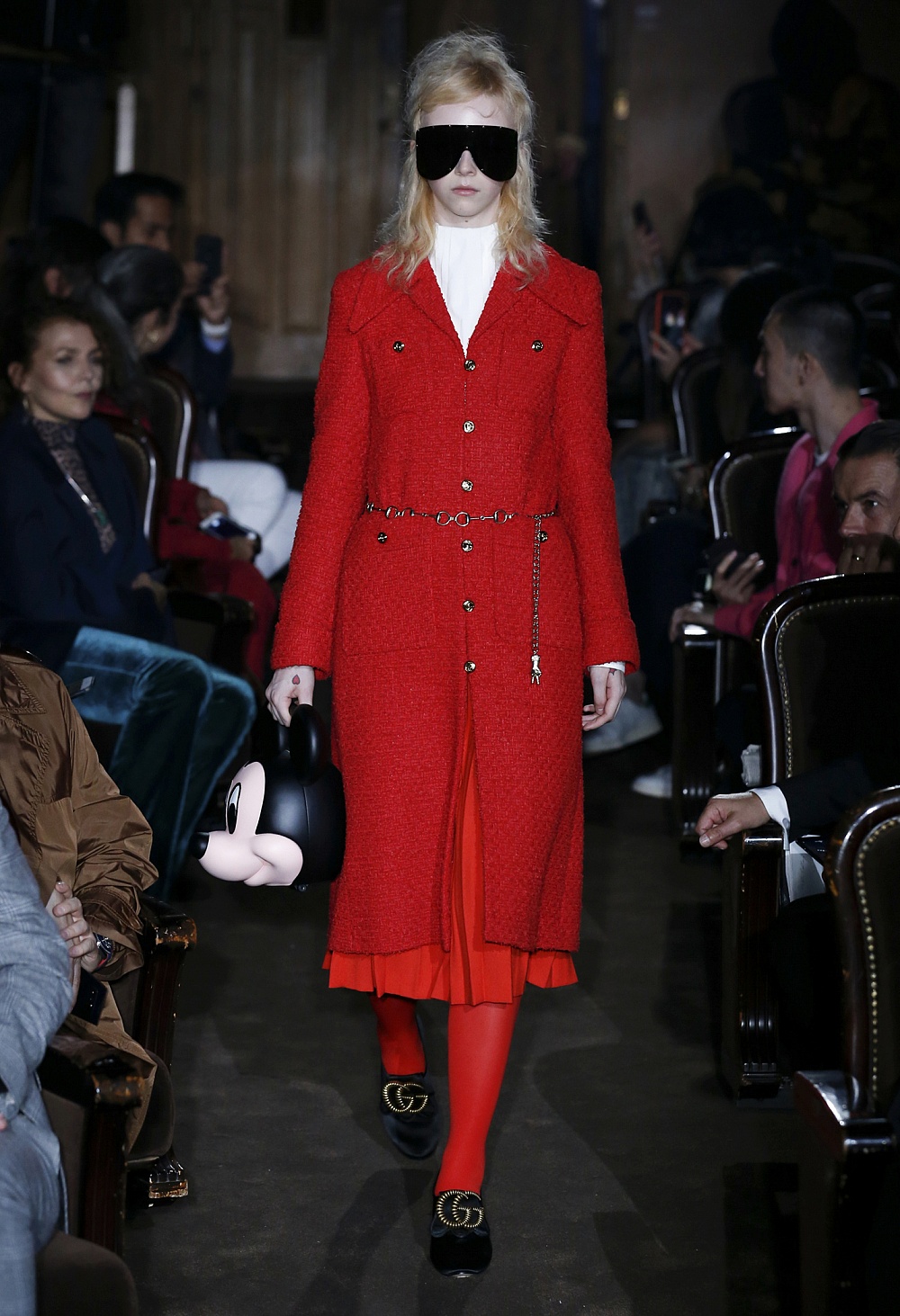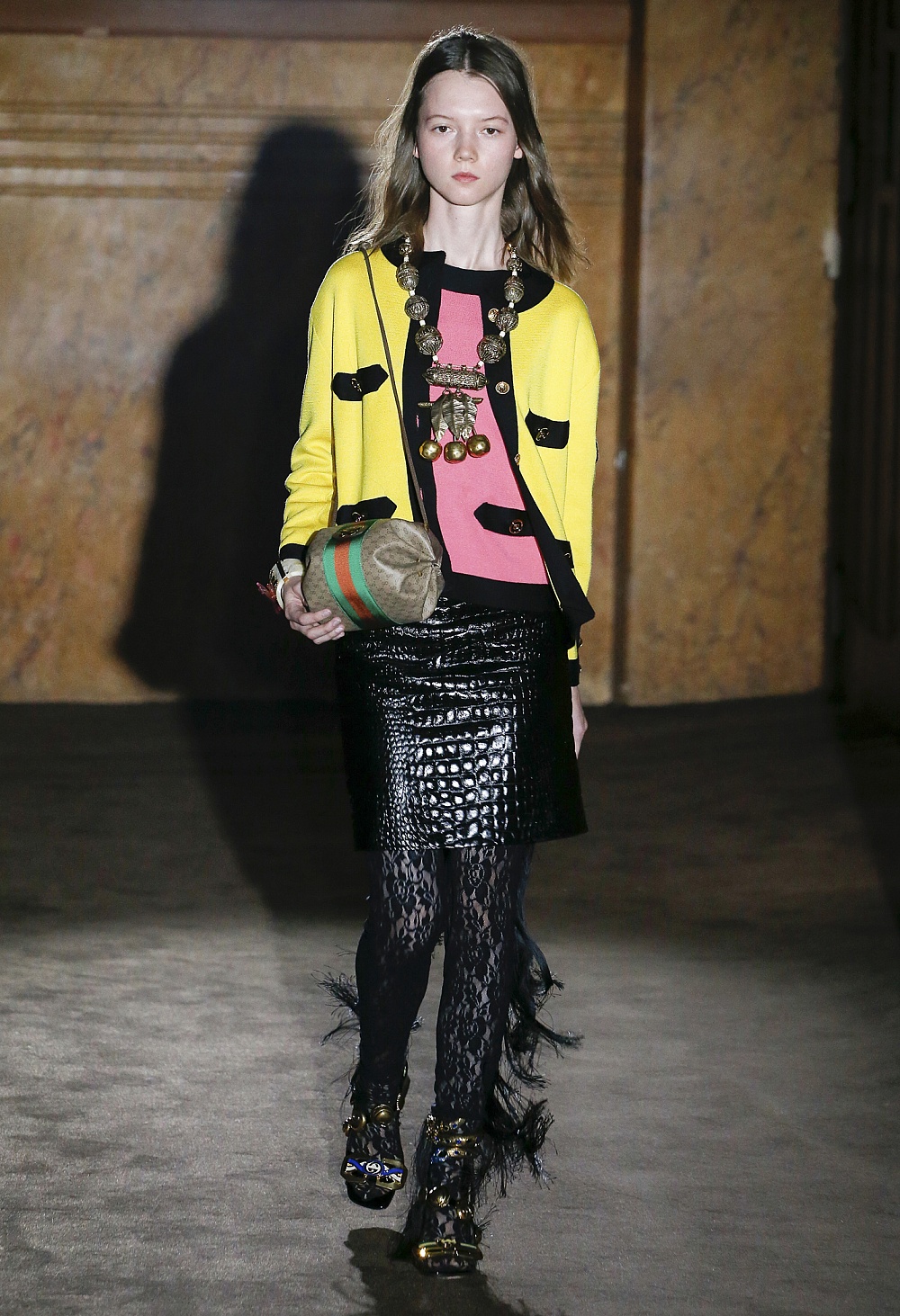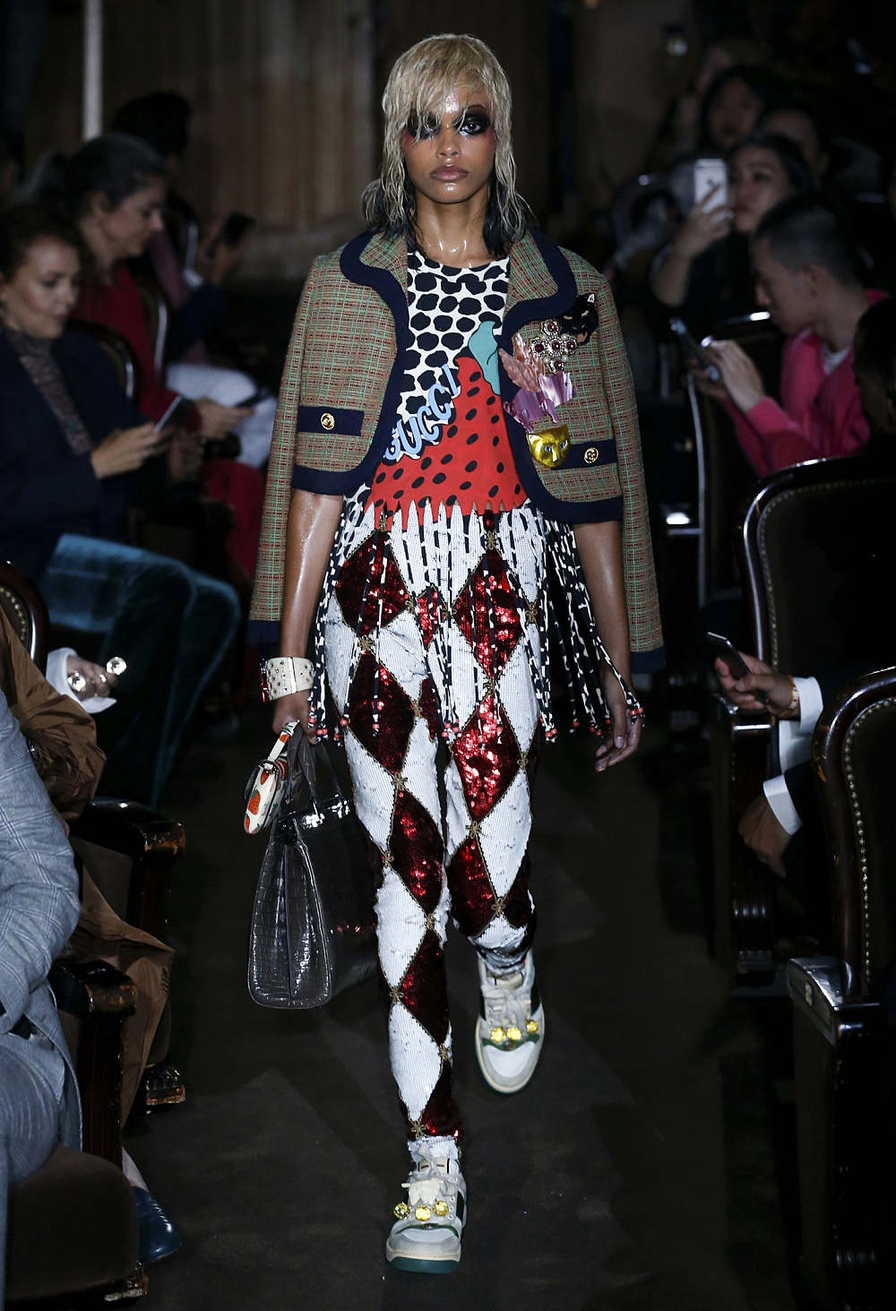 Но кажется, что не меньше французской – Микеле вдохновляет американская культура: модели выходили на подиум с сумками-микки-маусами, в куртках с изображением кантри-иконы Долли Партон и в фетровых шляпах, вдохновленных образом Дженис Джоплин. Как и всегда под руководством Алессандро Микеле, показ Gucci был экстра-эклектичным: здесь и гламурные платья в пол с перьями и камнями, и шубы из икусственного меха, как у рок-звезд, и водолазки из латекса, и узнаваемый лук Gucci nerd – стильных заучек, которые, сами не зная как, оказались в ночном клубе. Этим вечером в клубе выступала Джейн Биркин – легенда французского кинематографа и шансона, Джейн исполнила песню «Baby Alone in Babylone» в антракте. И это был прекрасный способ признаться в любви Франции и ее культурному наследию.