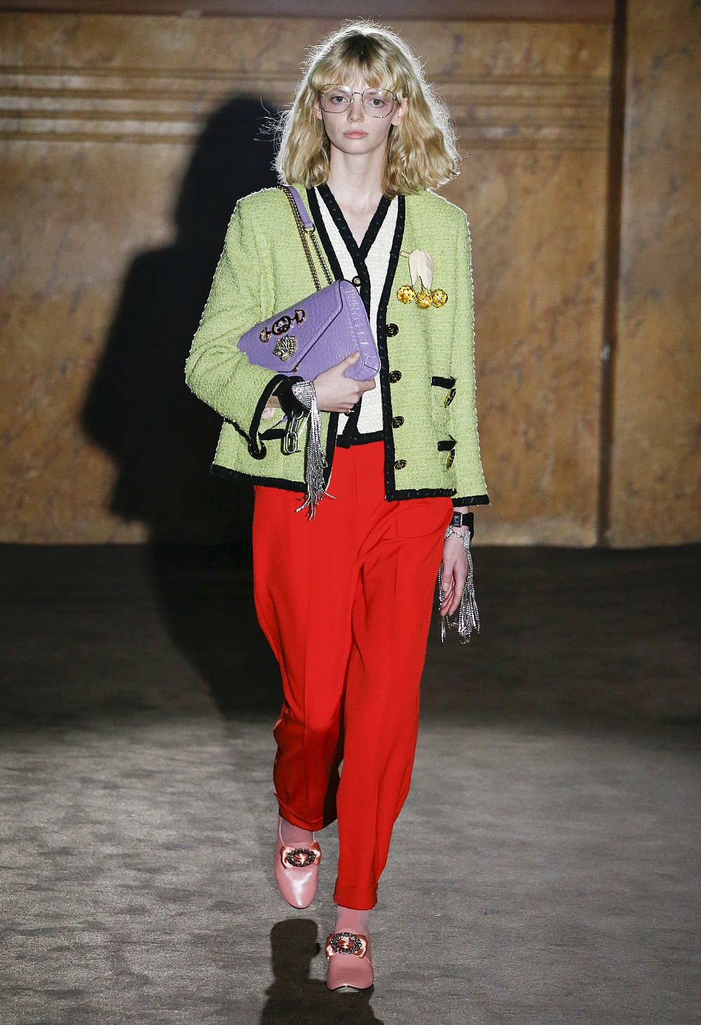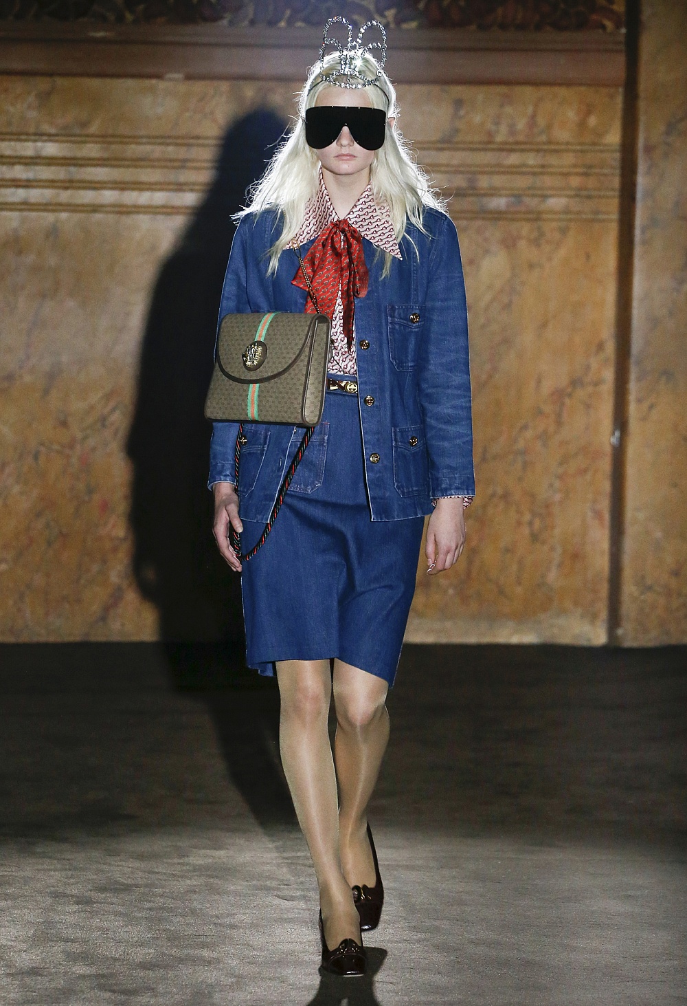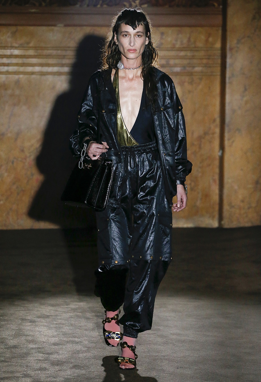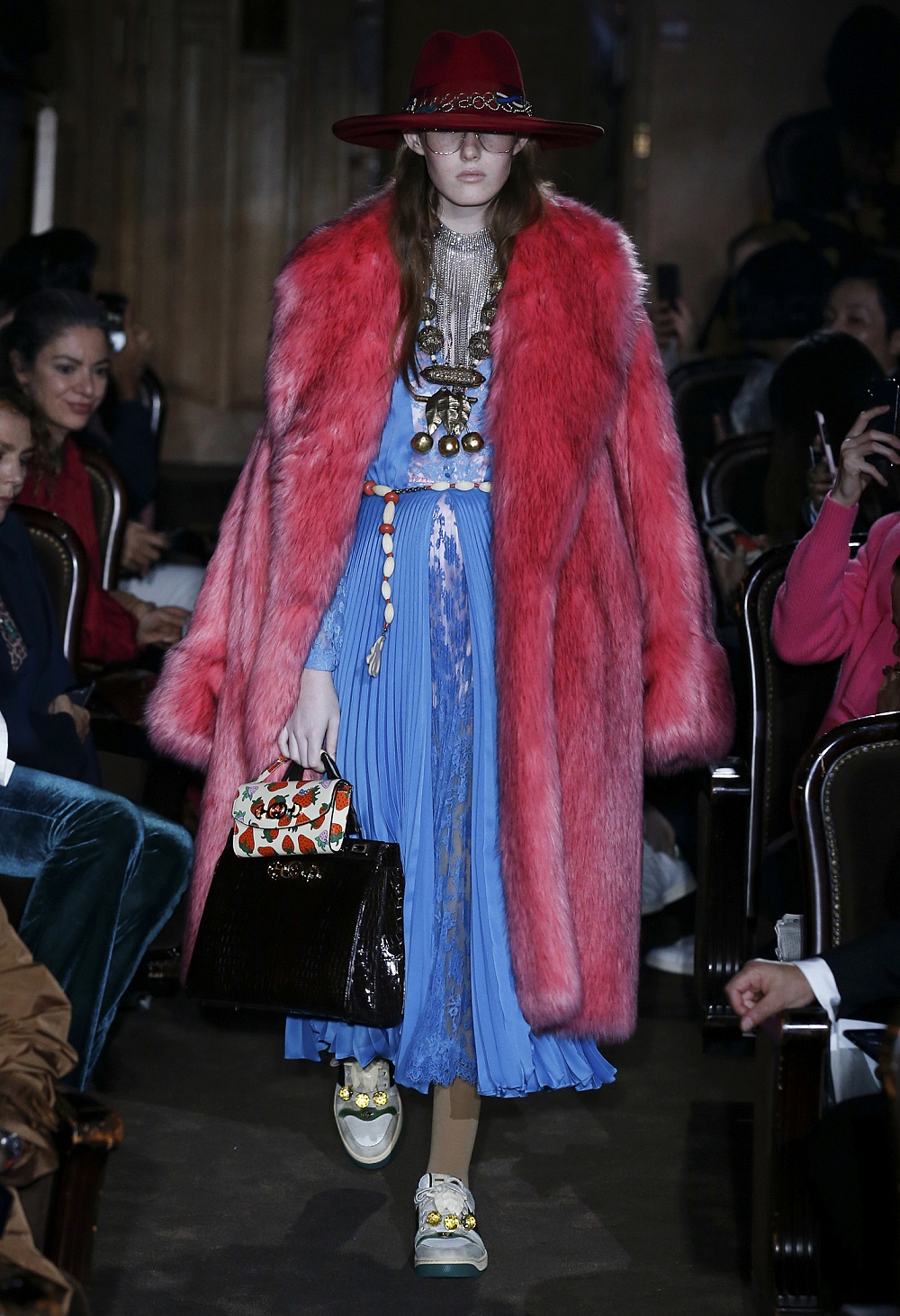 Но кажется, что не меньше французской – Микеле вдохновляет американская культура: модели выходили на подиум с сумками-микки-маусами, в куртках с изображением кантри-иконы Долли Партон и в фетровых шляпах, вдохновленных образом Дженис Джоплин. Как и всегда под руководством Алессандро Микеле, показ Gucci был экстра-эклектичным: здесь и гламурные платья в пол с перьями и камнями, и шубы из икусственного меха, как у рок-звезд, и водолазки из латекса, и узнаваемый лук Gucci nerd – стильных заучек, которые, сами не зная как, оказались в ночном клубе. Этим вечером в клубе выступала Джейн Биркин – легенда французского кинематографа и шансона, Джейн исполнила песню «Baby Alone in Babylone» в антракте. И это был прекрасный способ признаться в любви Франции и ее культурному наследию.