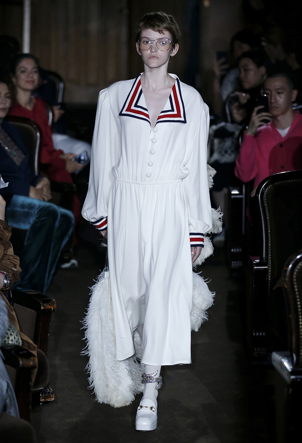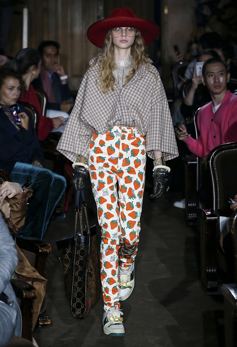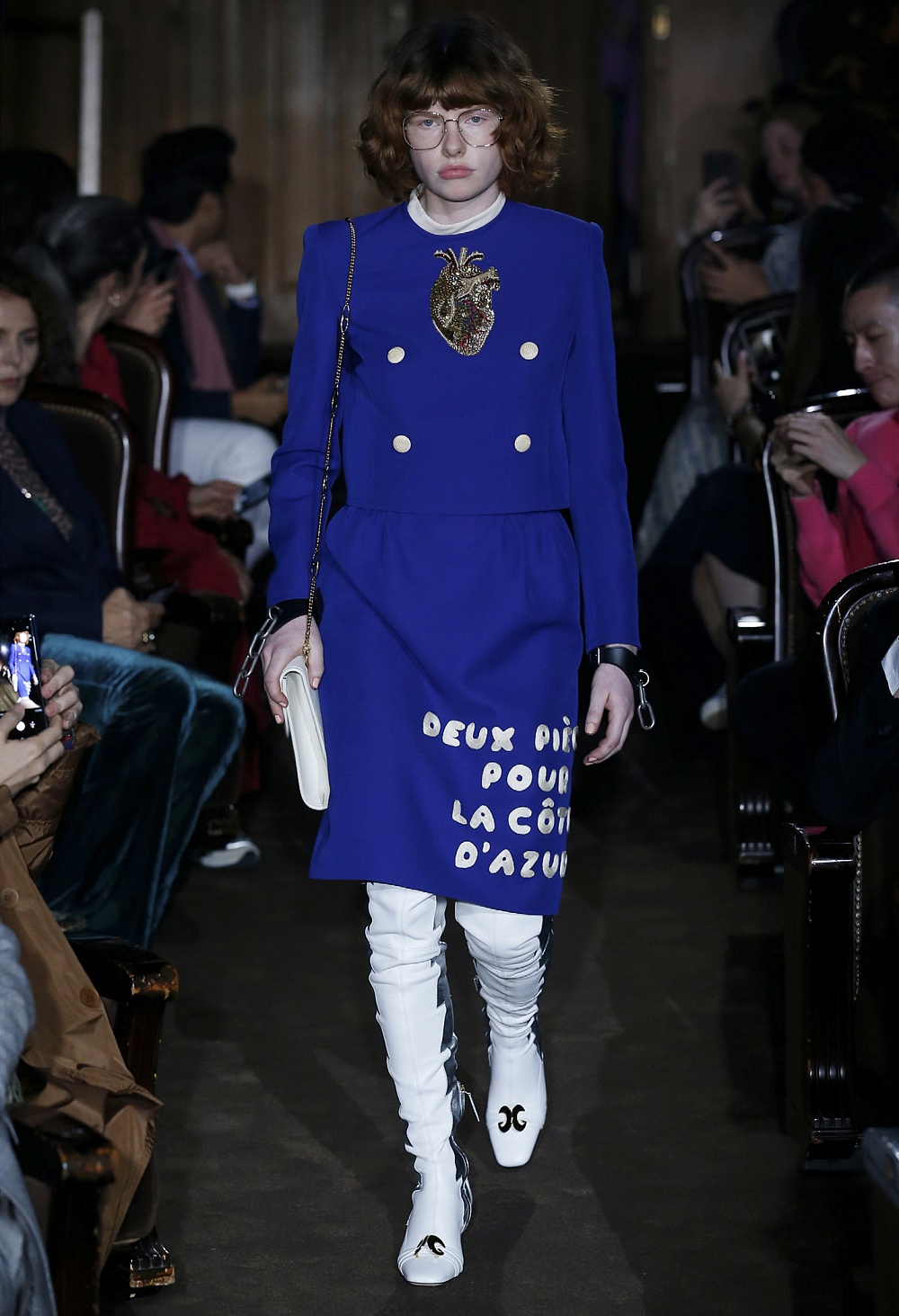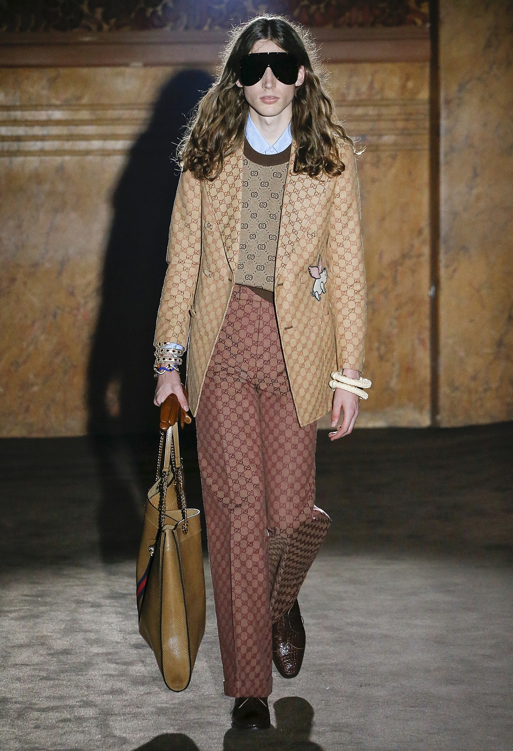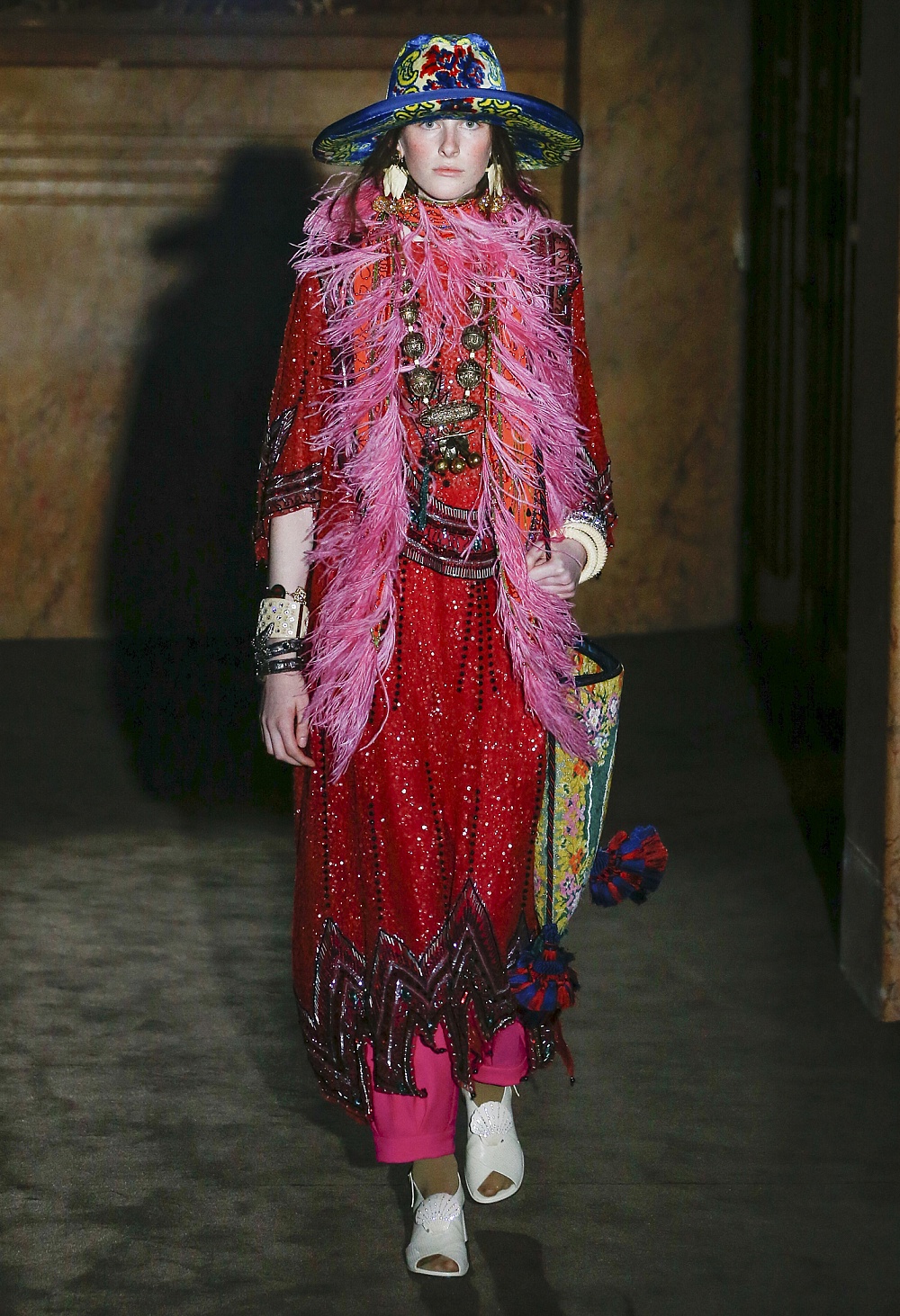 Но кажется, что не меньше французской – Микеле вдохновляет американская культура: модели выходили на подиум с сумками-микки-маусами, в куртках с изображением кантри-иконы Долли Партон и в фетровых шляпах, вдохновленных образом Дженис Джоплин. Как и всегда под руководством Алессандро Микеле, показ Gucci был экстра-эклектичным: здесь и гламурные платья в пол с перьями и камнями, и шубы из икусственного меха, как у рок-звезд, и водолазки из латекса, и узнаваемый лук Gucci nerd – стильных заучек, которые, сами не зная как, оказались в ночном клубе. Этим вечером в клубе выступала Джейн Биркин – легенда французского кинематографа и шансона, Джейн исполнила песню «Baby Alone in Babylone» в антракте. И это был прекрасный способ признаться в любви Франции и ее культурному наследию.
