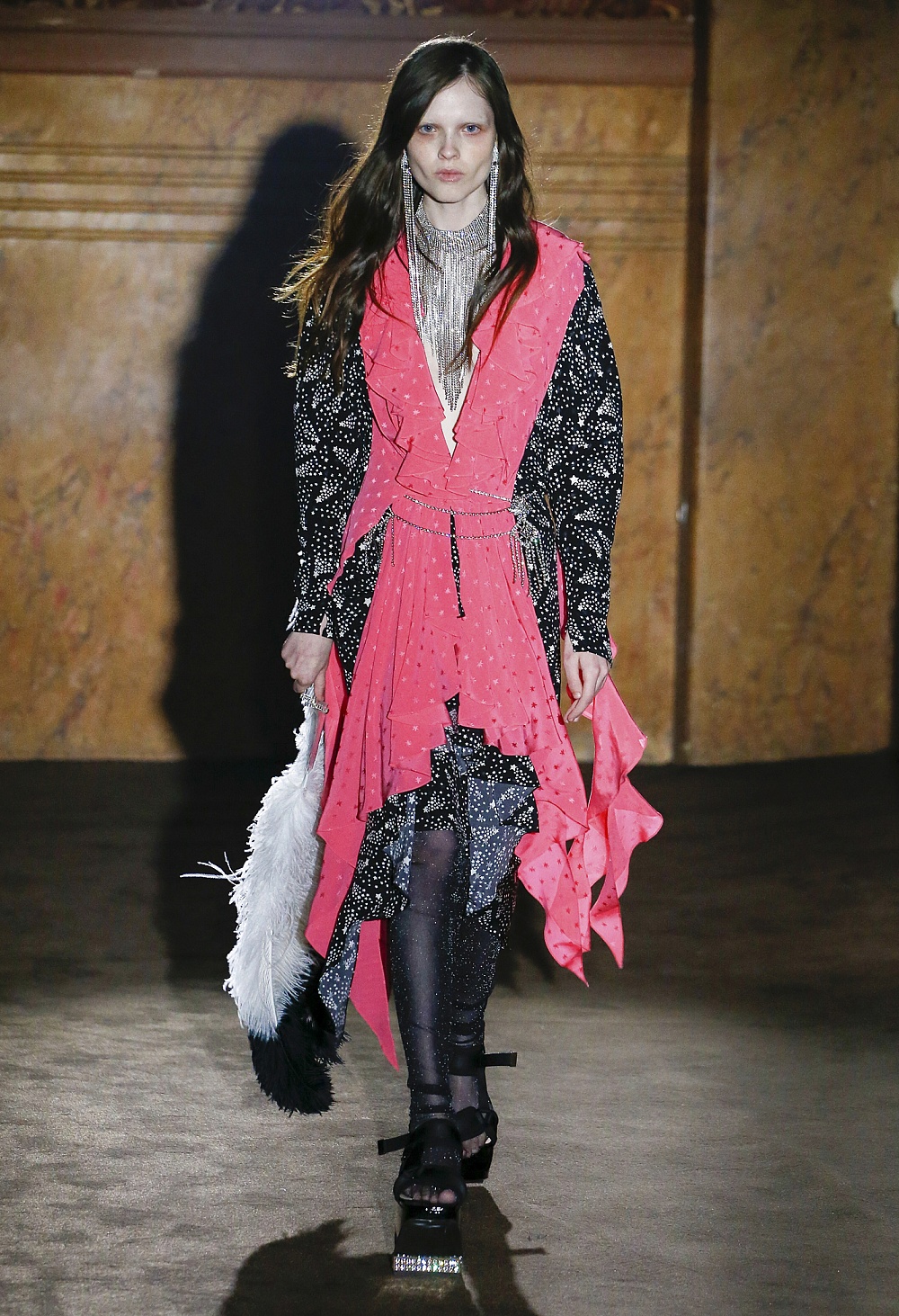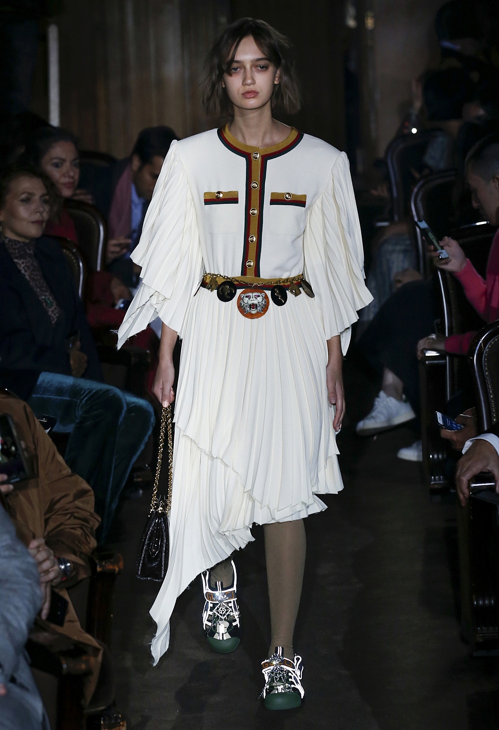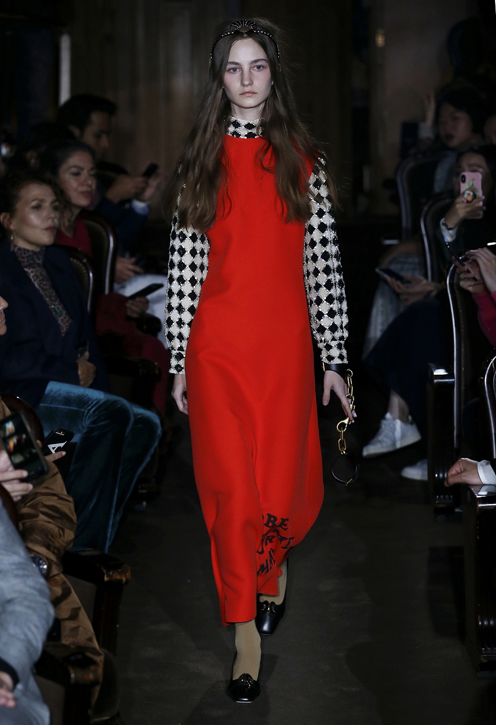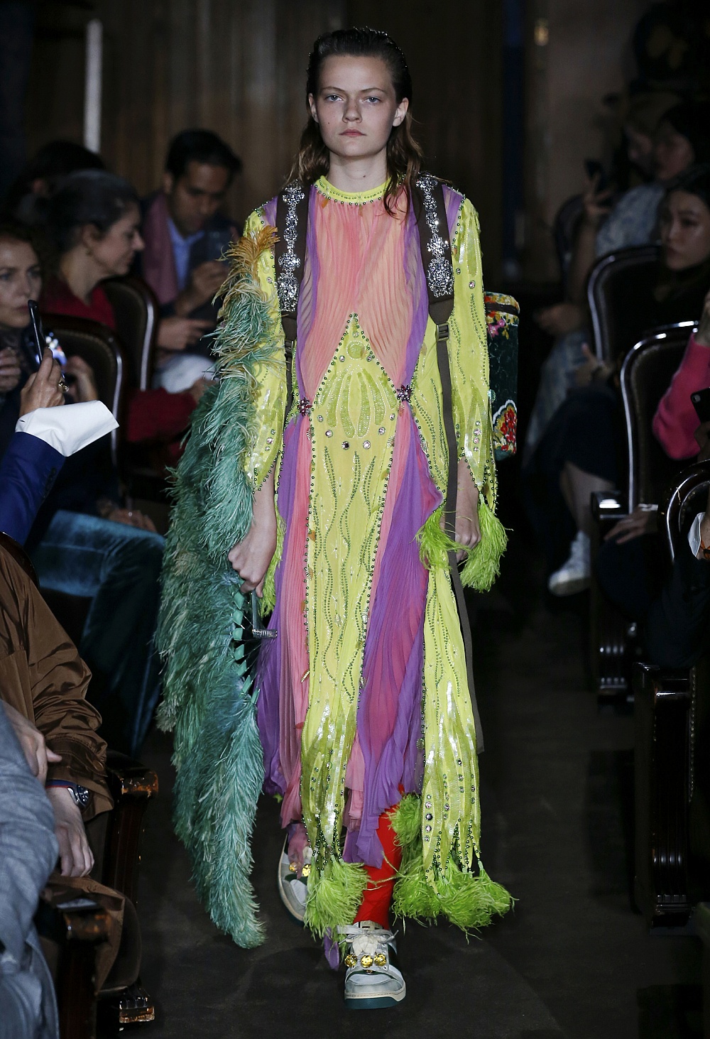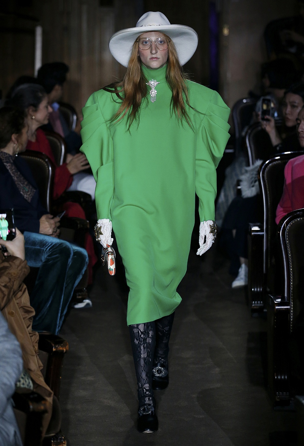 Но кажется, что не меньше французской – Микеле вдохновляет американская культура: модели выходили на подиум с сумками-микки-маусами, в куртках с изображением кантри-иконы Долли Партон и в фетровых шляпах, вдохновленных образом Дженис Джоплин. Как и всегда под руководством Алессандро Микеле, показ Gucci был экстра-эклектичным: здесь и гламурные платья в пол с перьями и камнями, и шубы из икусственного меха, как у рок-звезд, и водолазки из латекса, и узнаваемый лук Gucci nerd – стильных заучек, которые, сами не зная как, оказались в ночном клубе. Этим вечером в клубе выступала Джейн Биркин – легенда французского кинематографа и шансона, Джейн исполнила песню «Baby Alone in Babylone» в антракте. И это был прекрасный способ признаться в любви Франции и ее культурному наследию.