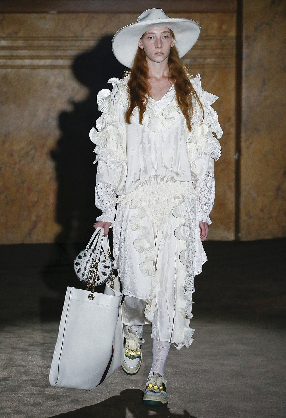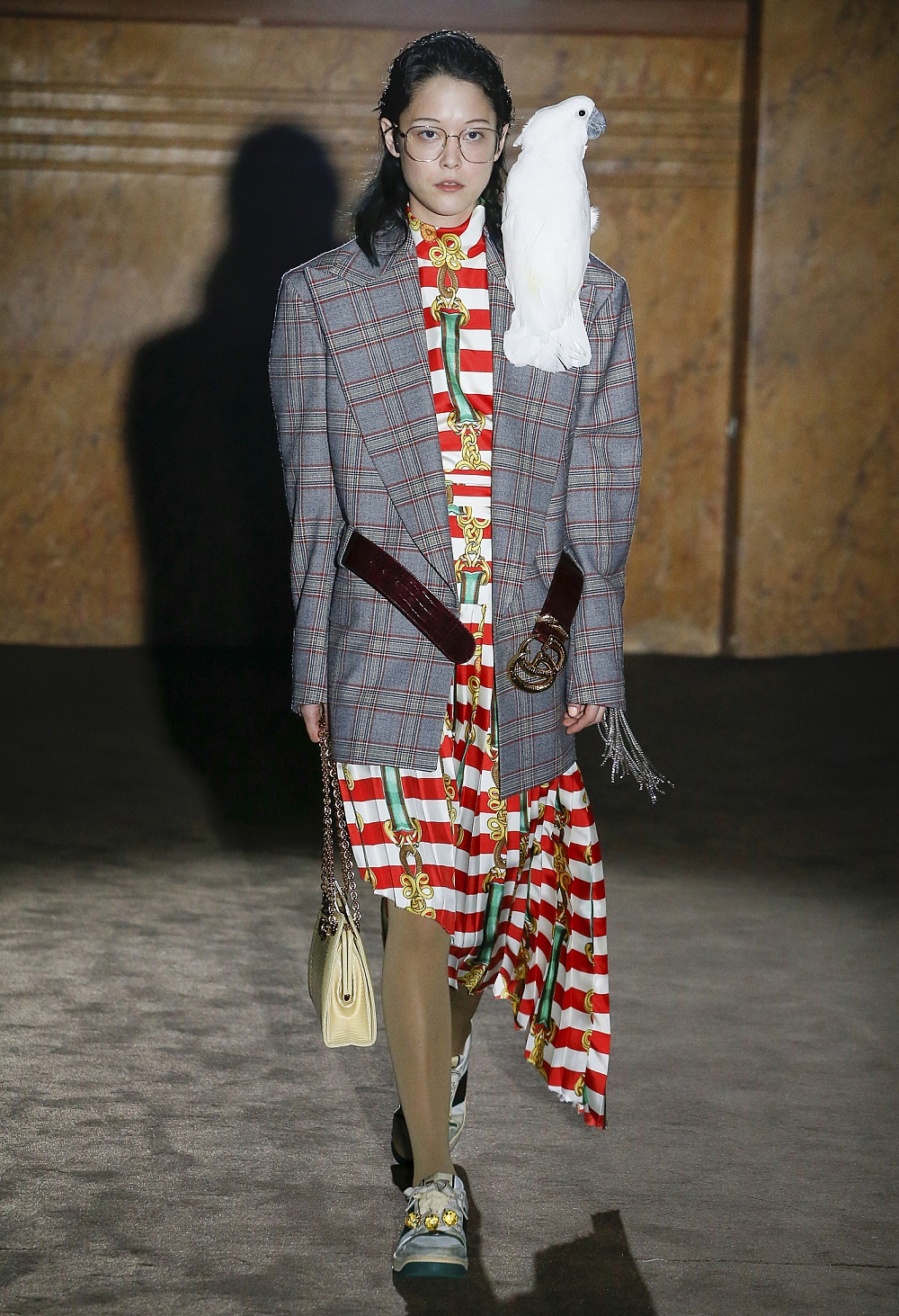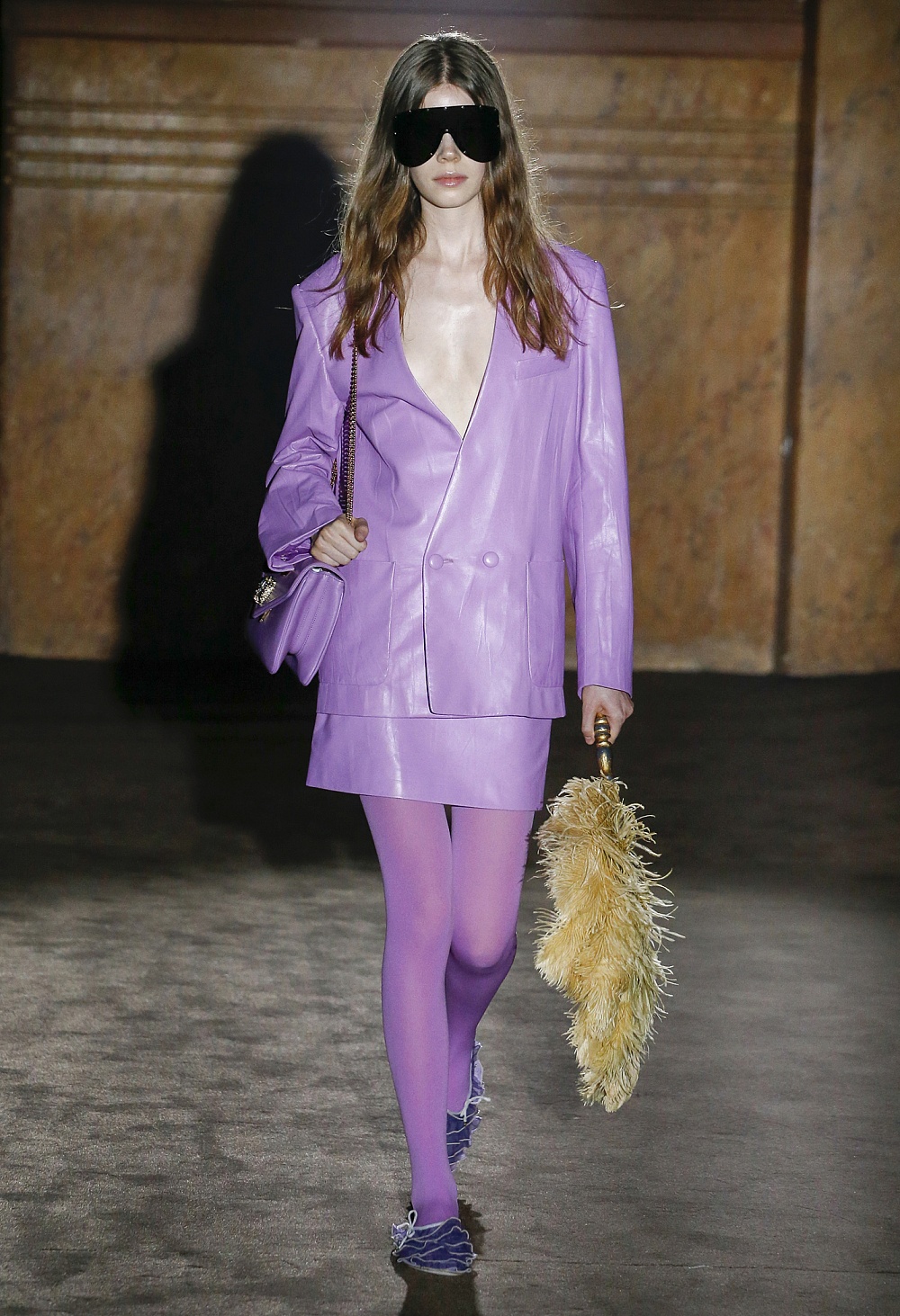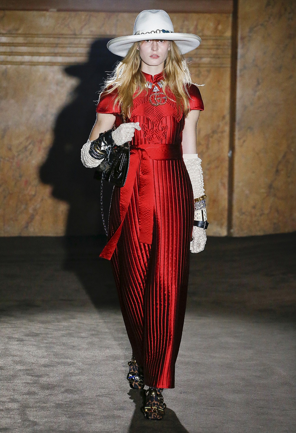Но кажется, что не меньше французской – Микеле вдохновляет американская культура: модели выходили на подиум с сумками-микки-маусами, в куртках с изображением кантри-иконы Долли Партон и в фетровых шляпах, вдохновленных образом Дженис Джоплин. Как и всегда под руководством Алессандро Микеле, показ Gucci был экстра-эклектичным: здесь и гламурные платья в пол с перьями и камнями, и шубы из икусственного меха, как у рок-звезд, и водолазки из латекса, и узнаваемый лук Gucci nerd – стильных заучек, которые, сами не зная как, оказались в ночном клубе. Этим вечером в клубе выступала Джейн Биркин – легенда французского кинематографа и шансона, Джейн исполнила песню «Baby Alone in Babylone» в антракте. И это был прекрасный способ признаться в любви Франции и ее культурному наследию.
