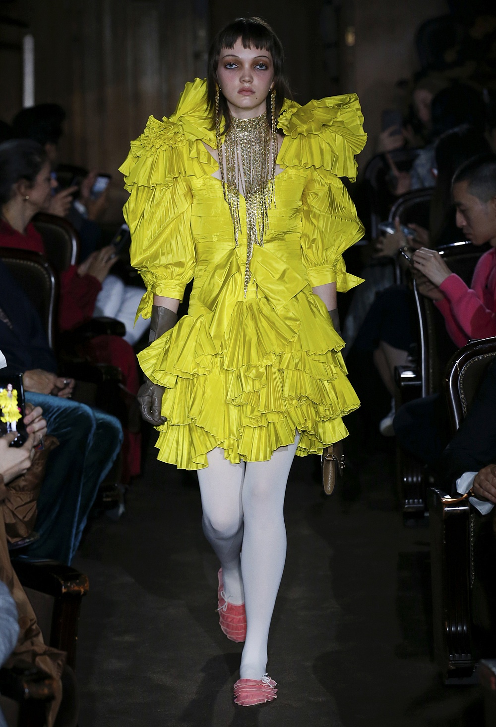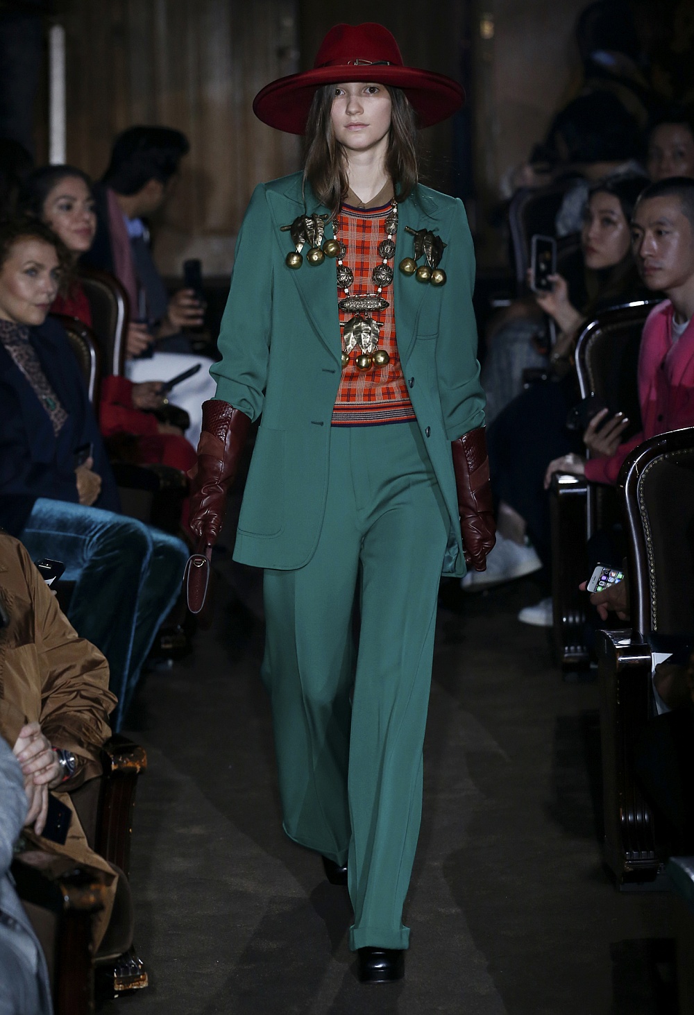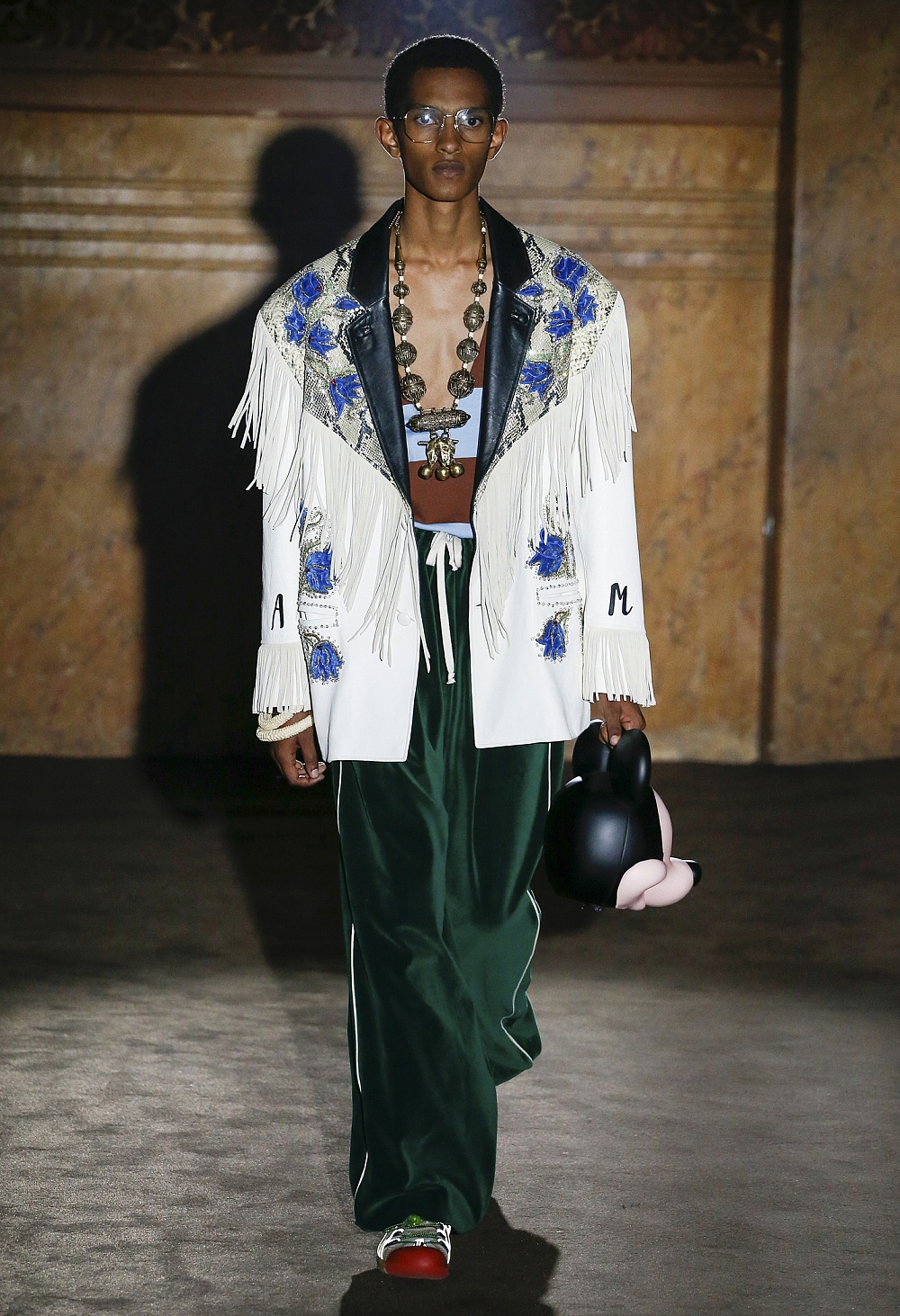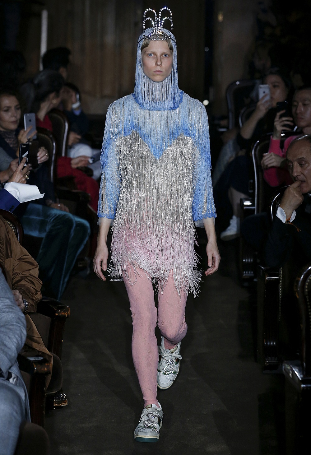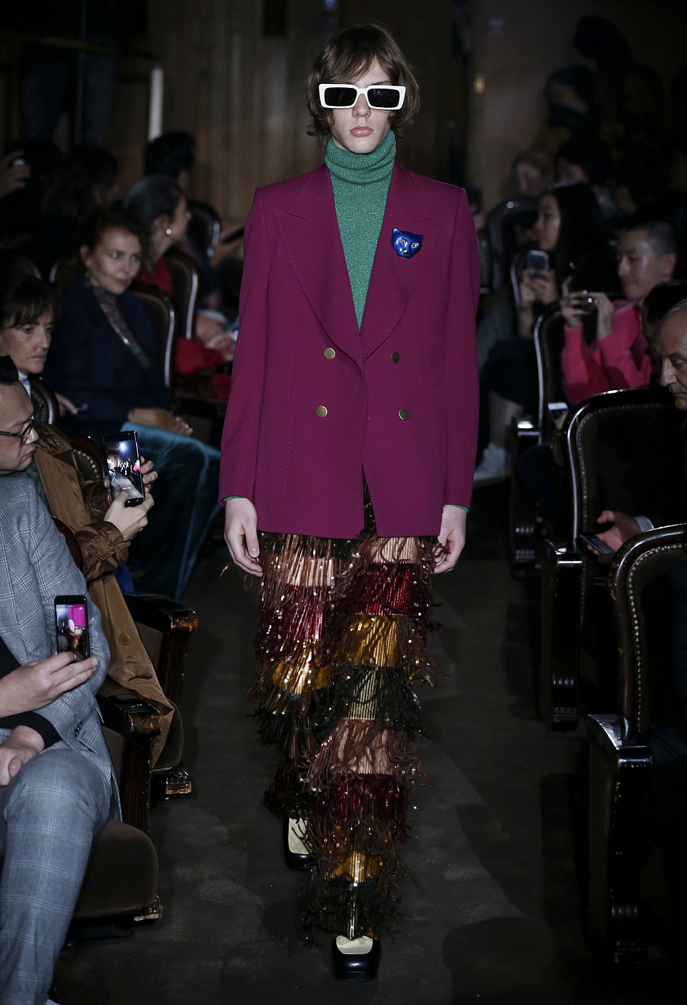 Но кажется, что не меньше французской – Микеле вдохновляет американская культура: модели выходили на подиум с сумками-микки-маусами, в куртках с изображением кантри-иконы Долли Партон и в фетровых шляпах, вдохновленных образом Дженис Джоплин. Как и всегда под руководством Алессандро Микеле, показ Gucci был экстра-эклектичным: здесь и гламурные платья в пол с перьями и камнями, и шубы из икусственного меха, как у рок-звезд, и водолазки из латекса, и узнаваемый лук Gucci nerd – стильных заучек, которые, сами не зная как, оказались в ночном клубе. Этим вечером в клубе выступала Джейн Биркин – легенда французского кинематографа и шансона, Джейн исполнила песню «Baby Alone in Babylone» в антракте. И это был прекрасный способ признаться в любви Франции и ее культурному наследию.