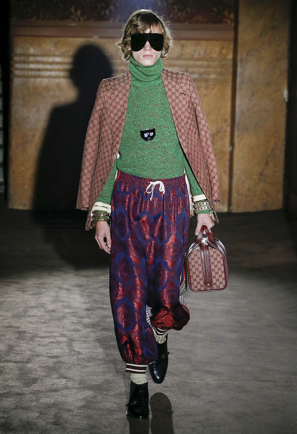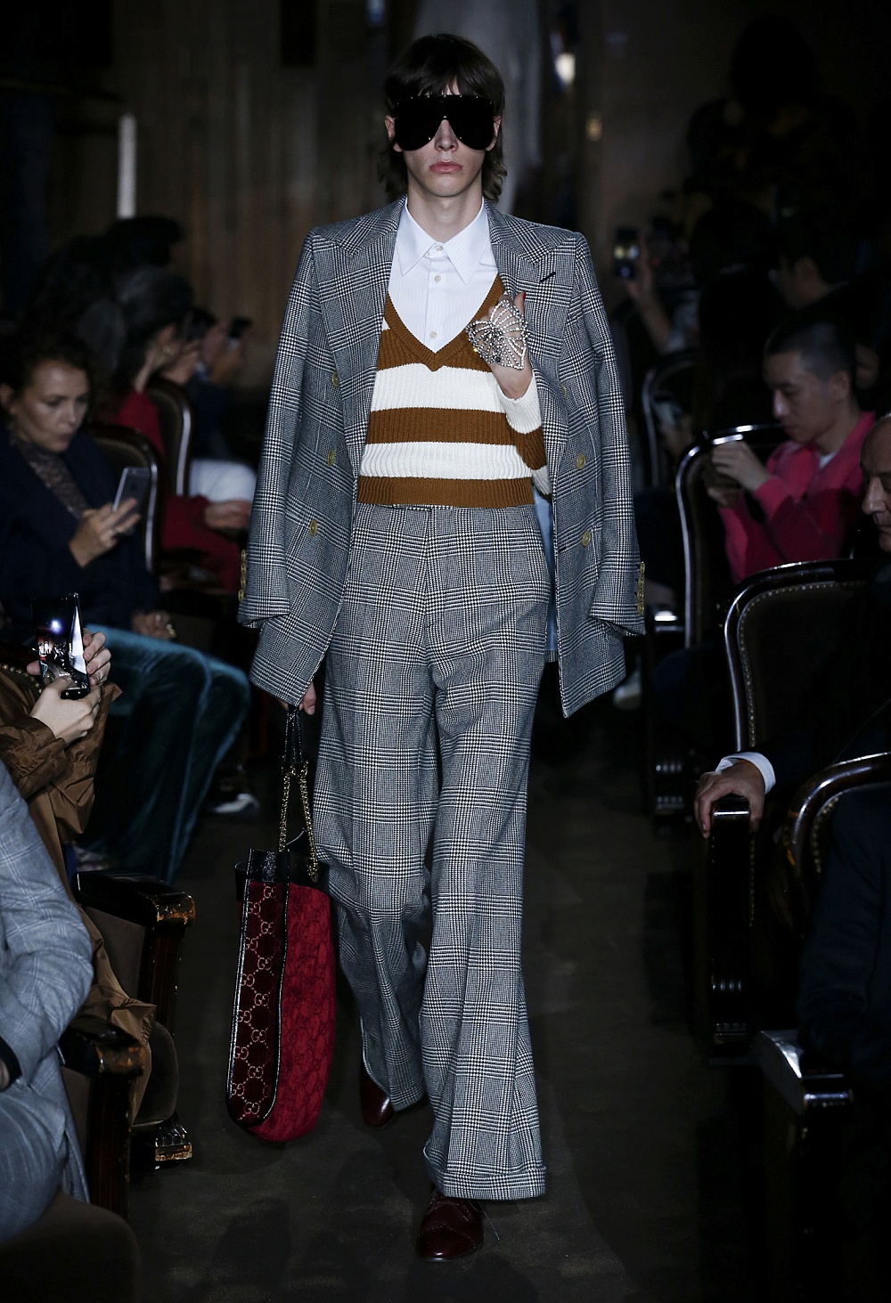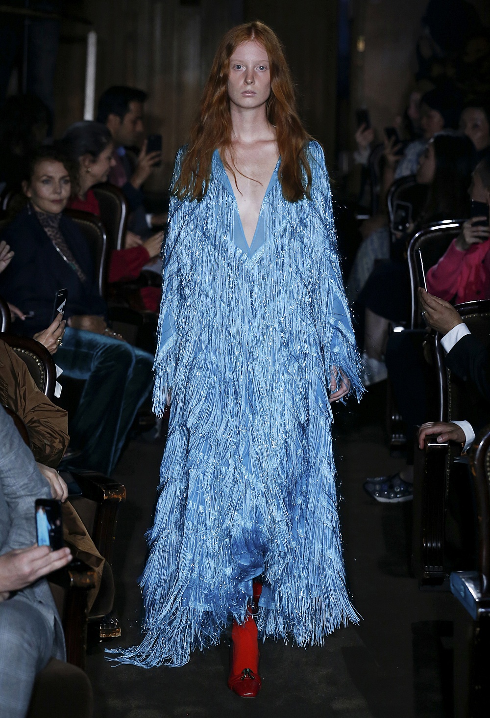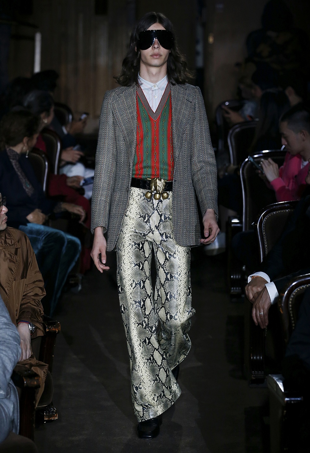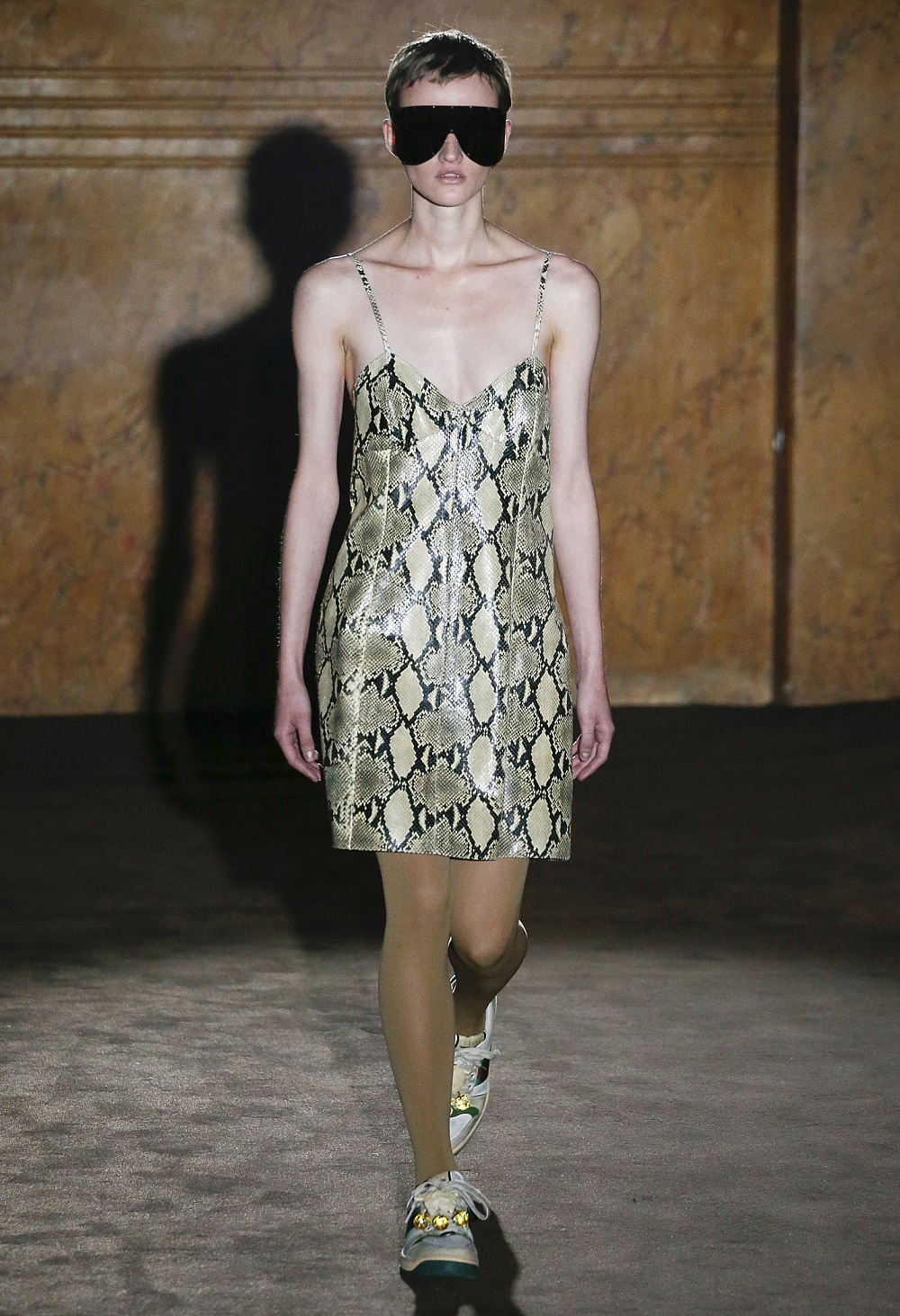 Но кажется, что не меньше французской – Микеле вдохновляет американская культура: модели выходили на подиум с сумками-микки-маусами, в куртках с изображением кантри-иконы Долли Партон и в фетровых шляпах, вдохновленных образом Дженис Джоплин. Как и всегда под руководством Алессандро Микеле, показ Gucci был экстра-эклектичным: здесь и гламурные платья в пол с перьями и камнями, и шубы из икусственного меха, как у рок-звезд, и водолазки из латекса, и узнаваемый лук Gucci nerd – стильных заучек, которые, сами не зная как, оказались в ночном клубе. Этим вечером в клубе выступала Джейн Биркин – легенда французского кинематографа и шансона, Джейн исполнила песню «Baby Alone in Babylone» в антракте. И это был прекрасный способ признаться в любви Франции и ее культурному наследию.