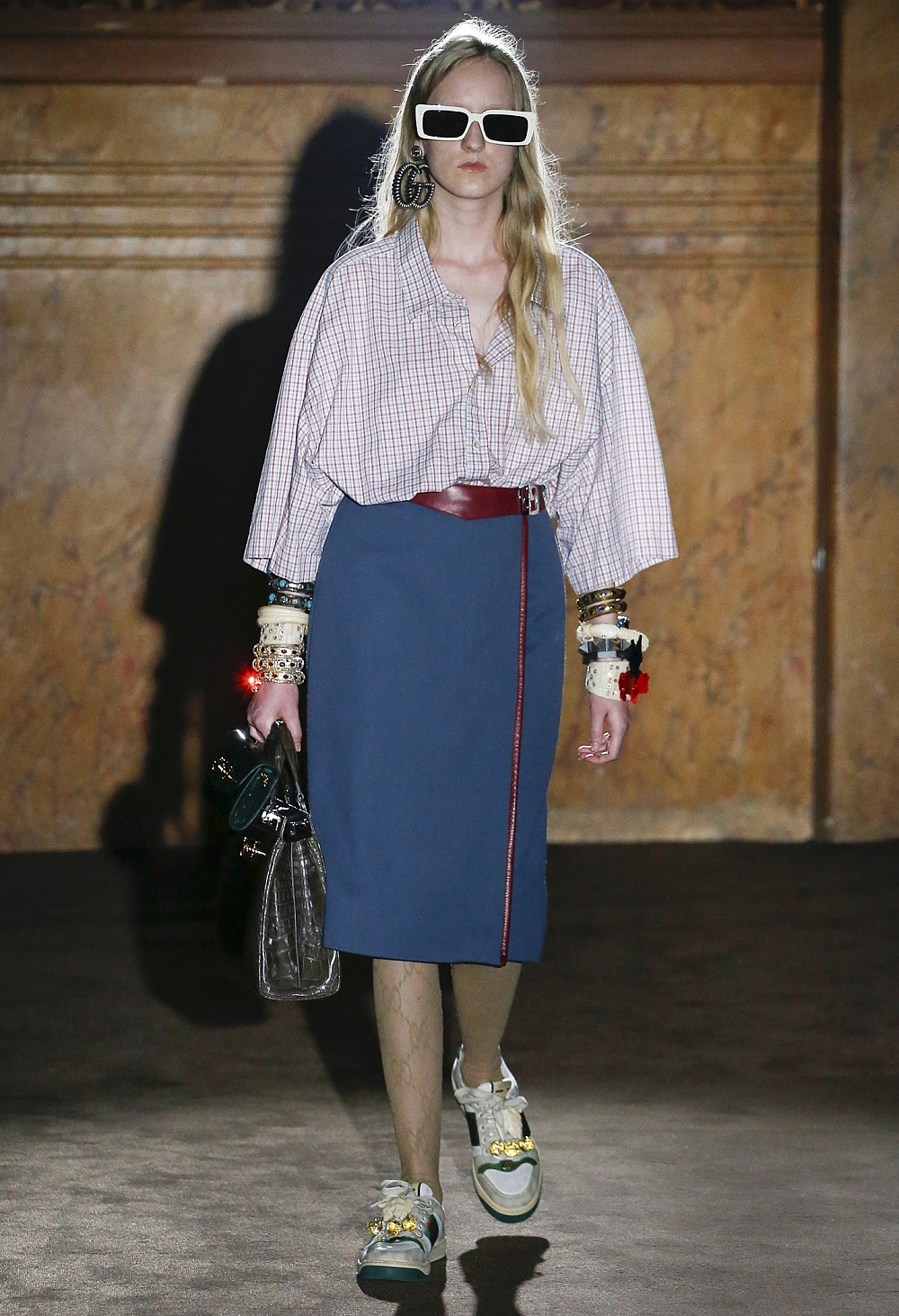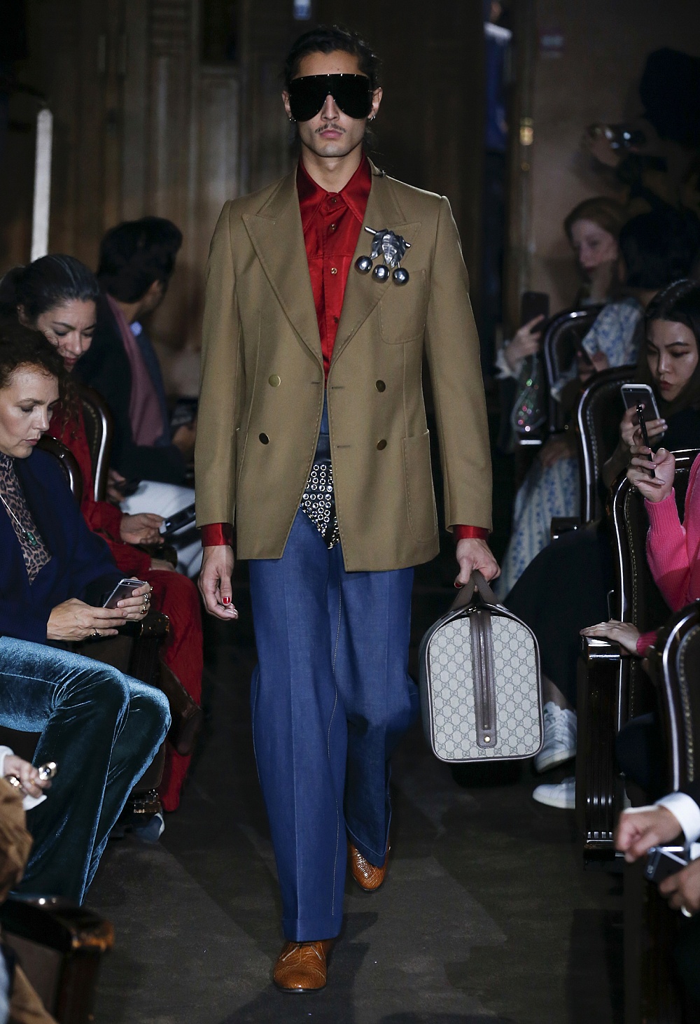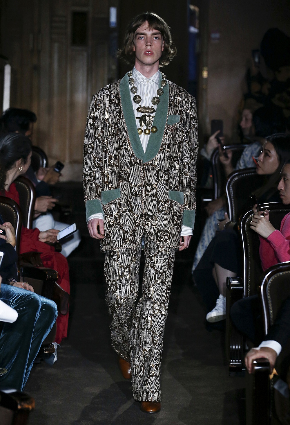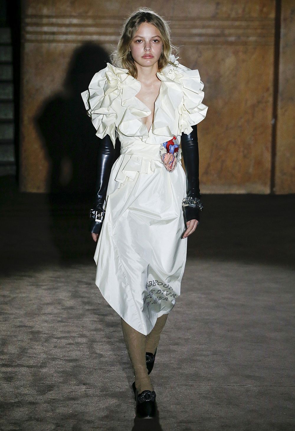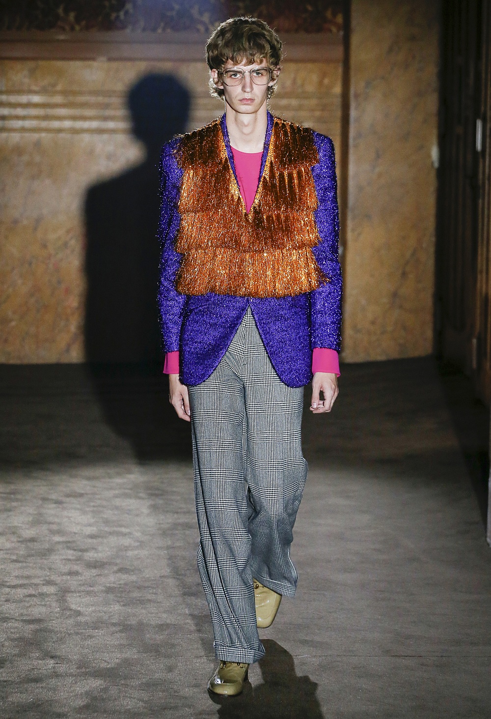 Но кажется, что не меньше французской – Микеле вдохновляет американская культура: модели выходили на подиум с сумками-микки-маусами, в куртках с изображением кантри-иконы Долли Партон и в фетровых шляпах, вдохновленных образом Дженис Джоплин. Как и всегда под руководством Алессандро Микеле, показ Gucci был экстра-эклектичным: здесь и гламурные платья в пол с перьями и камнями, и шубы из икусственного меха, как у рок-звезд, и водолазки из латекса, и узнаваемый лук Gucci nerd – стильных заучек, которые, сами не зная как, оказались в ночном клубе. Этим вечером в клубе выступала Джейн Биркин – легенда французского кинематографа и шансона, Джейн исполнила песню «Baby Alone in Babylone» в антракте. И это был прекрасный способ признаться в любви Франции и ее культурному наследию.