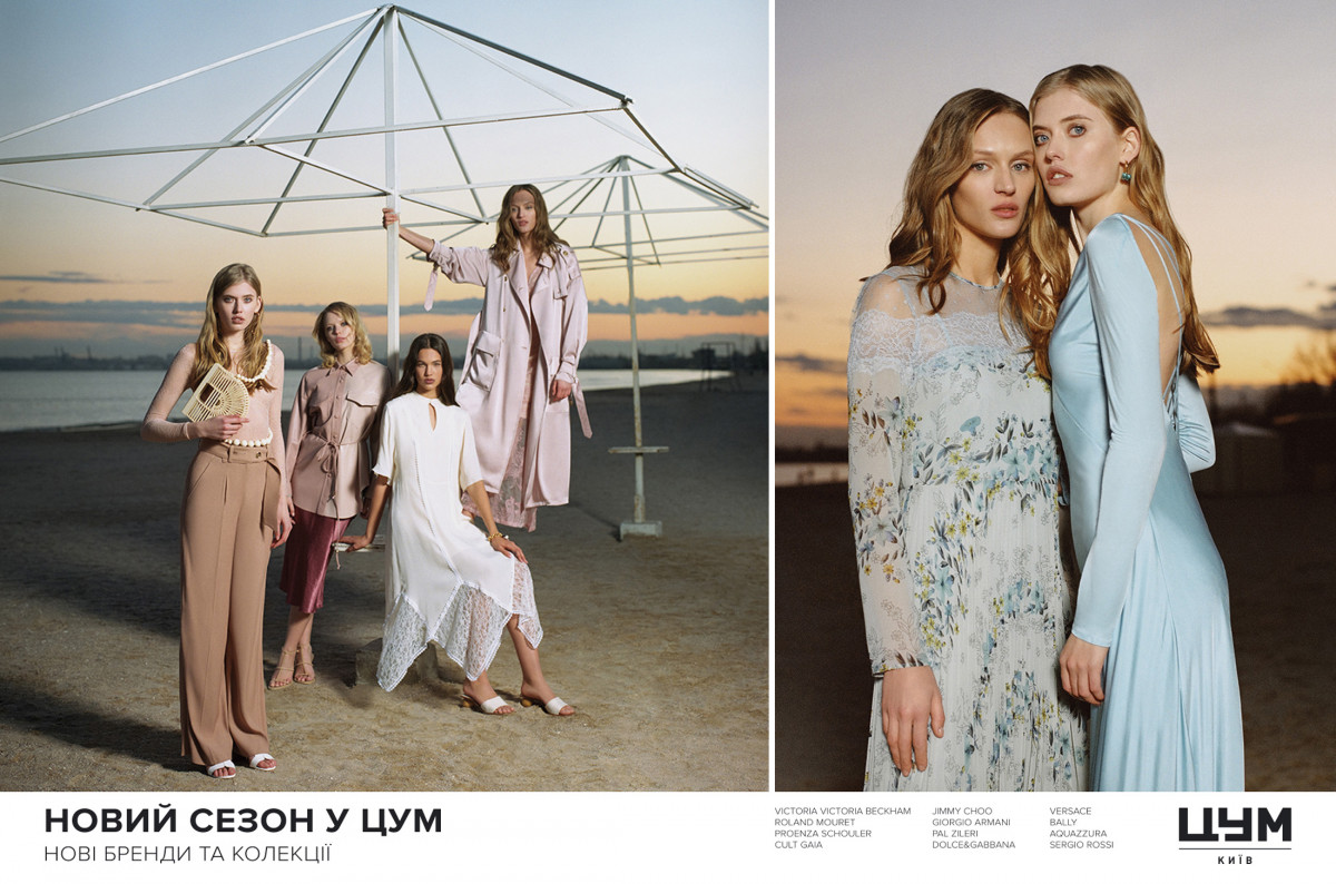 Свою новую рекламную кампанию команда киевского ЦУМ решила посвятить единению человека с природой: на снимках украинского фотографа Виталика Мельникова модели позируют на пустынном пляже, который готовится к открытию курортного сезона. Романтичные платья с кружевами вставками, брюки палаццо, тренчи цвета пыльной розы, жемчужные серьги, обувь и сумки с необычным декором — в образах, созданных стилистом Соней Солтес, собраны все главные тренды сезона.
