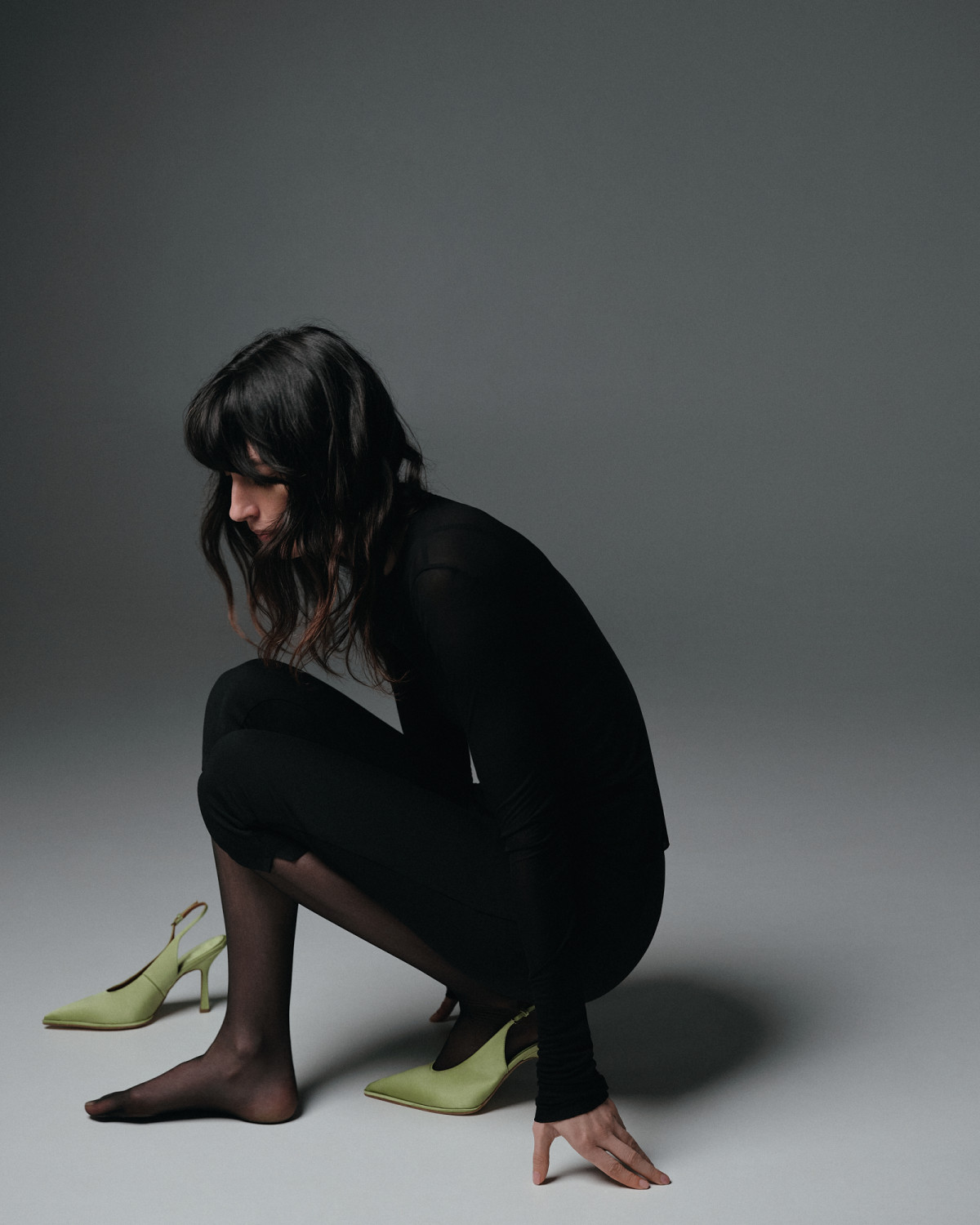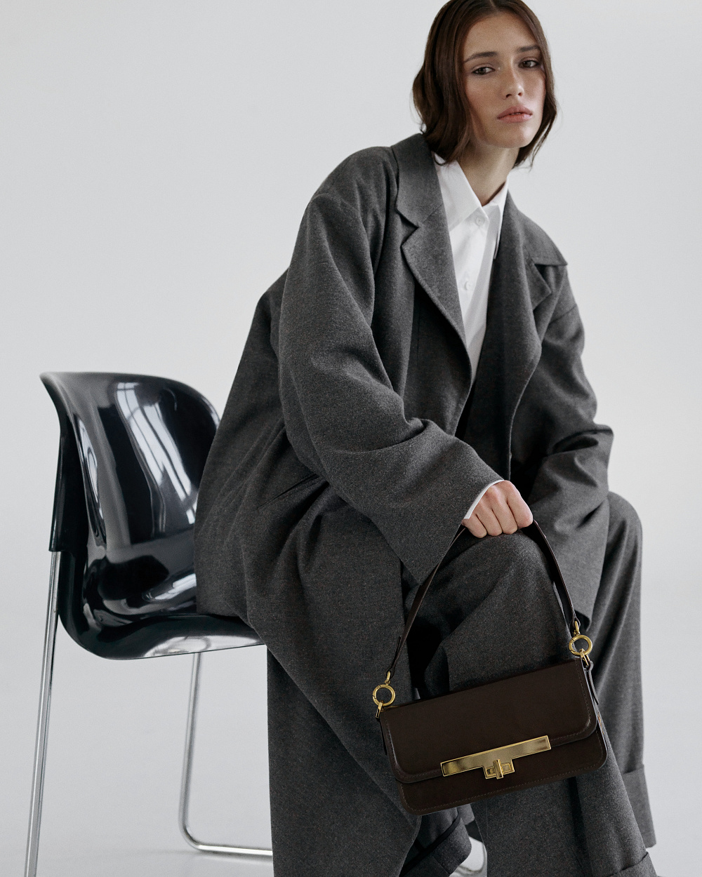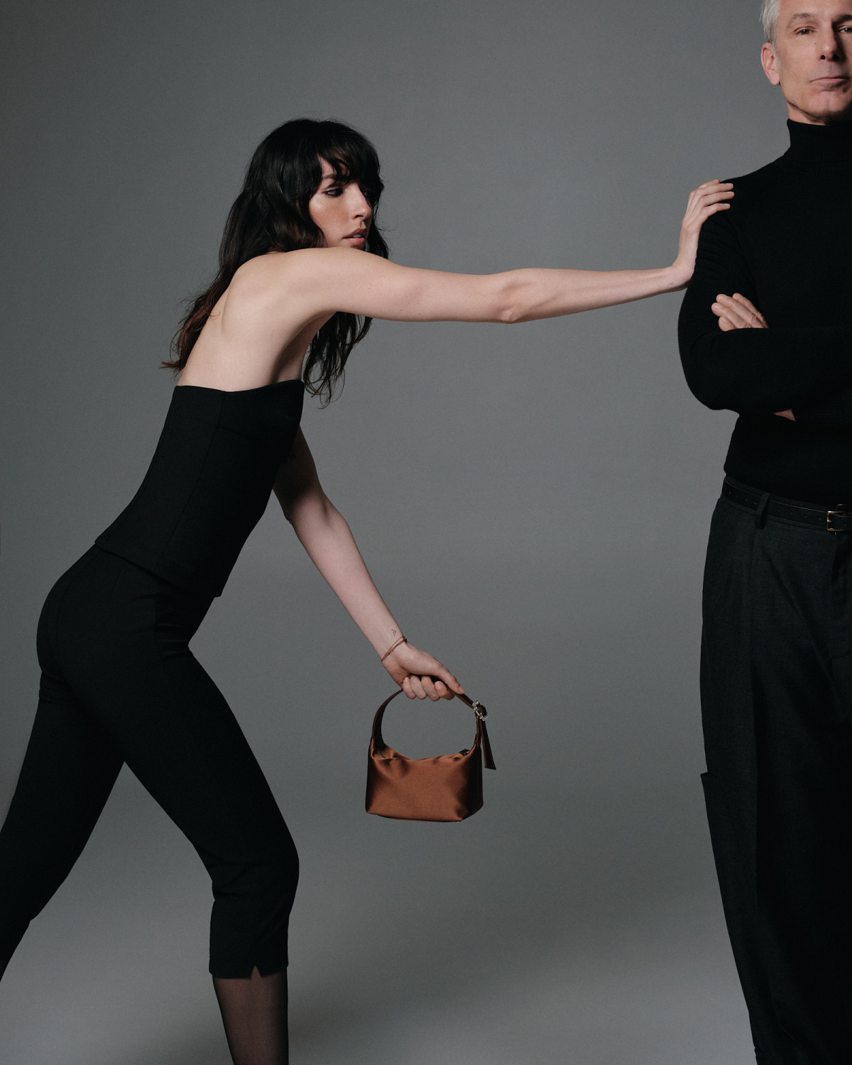 На кадрах модель та актор позують у нових речах лінійки, до якої увійшли сатинові балетки з декоративною пряжкою з камінням, слінбеки на підборах, а також сумки в ідентичних відтінках. Головними кольорами цього дропу стали оливковий і шоколадний.