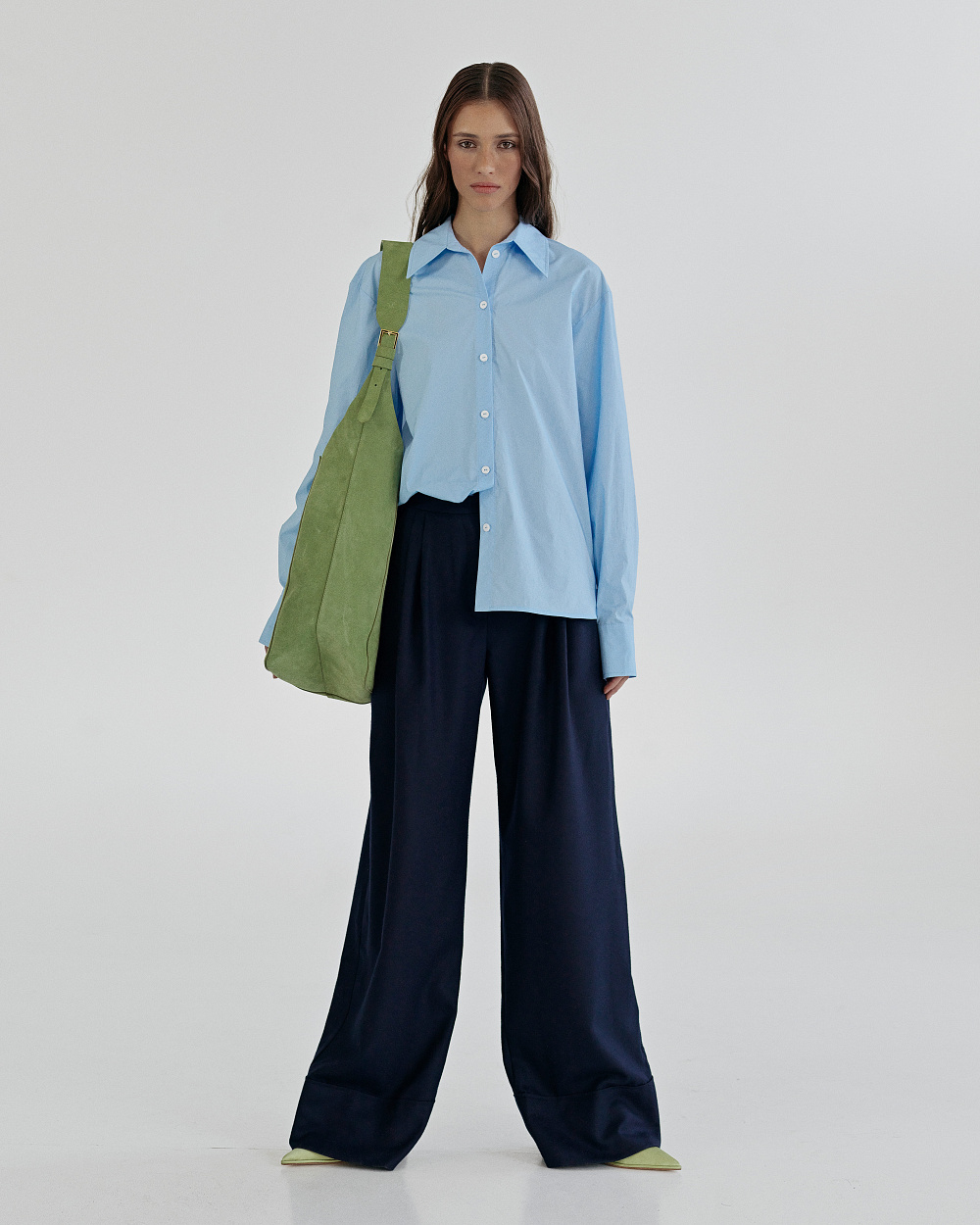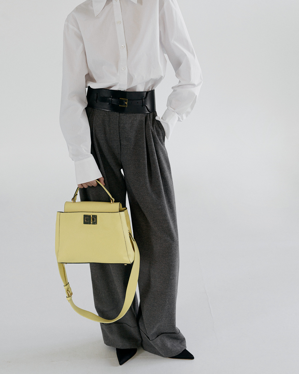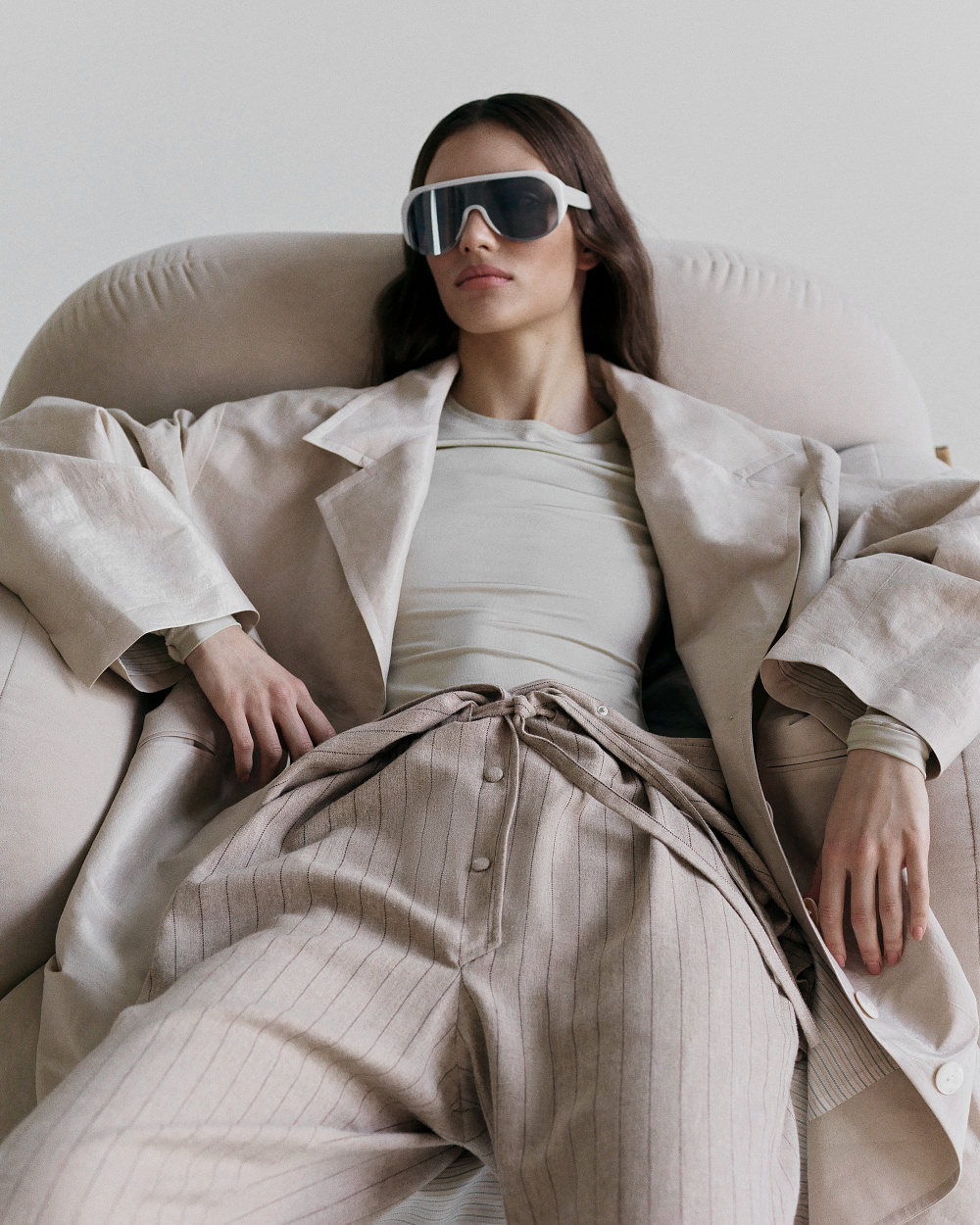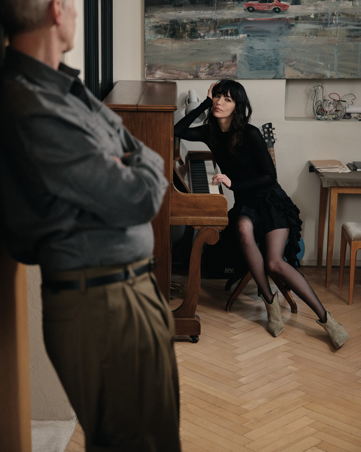 На кадрах модель та актор позують у нових речах лінійки, до якої увійшли сатинові балетки з декоративною пряжкою з камінням, слінбеки на підборах, а також сумки в ідентичних відтінках. Головними кольорами цього дропу стали оливковий і шоколадний.