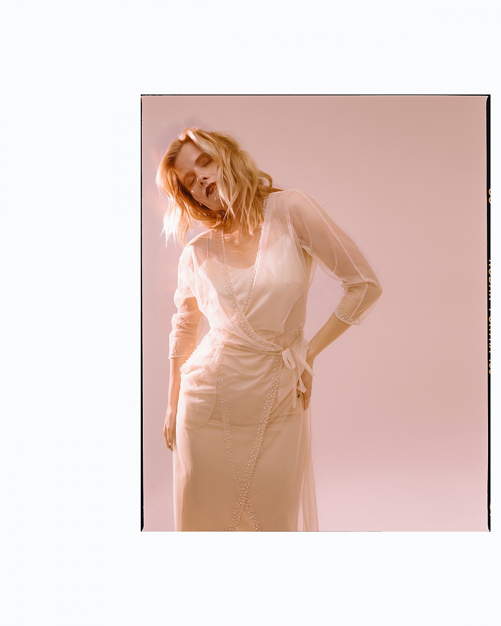 Все вещи сделаны из крепа, вискозы, нейлоновой сетки и шерсти черного и бежевого цветов, некоторые — украшены ручной вышивкой, в которую давно влюблены друзья бренда.