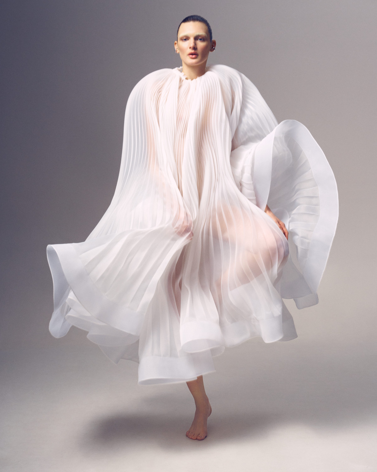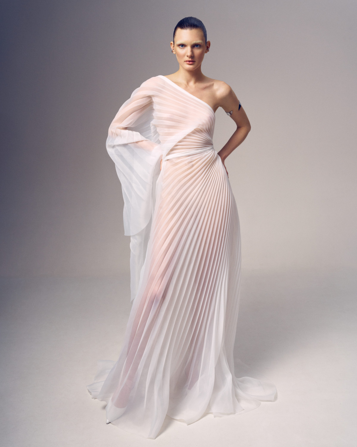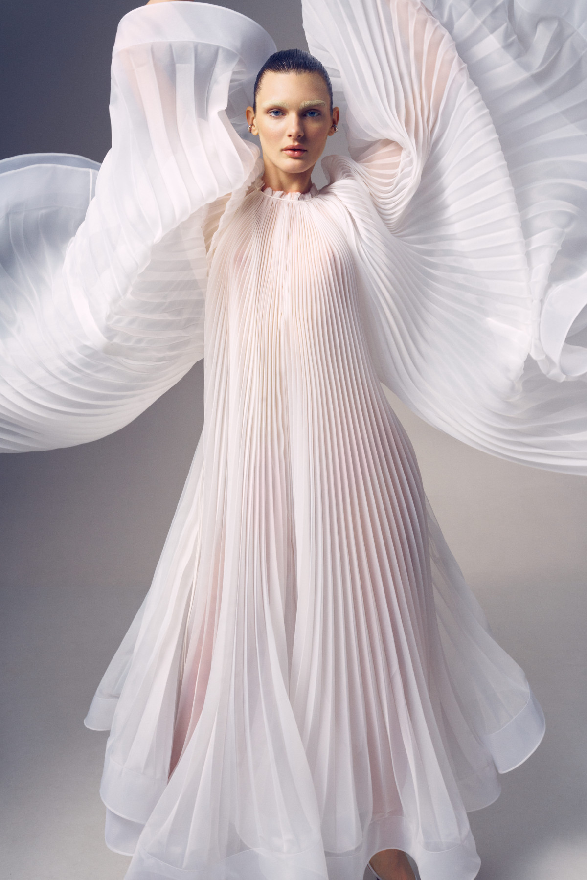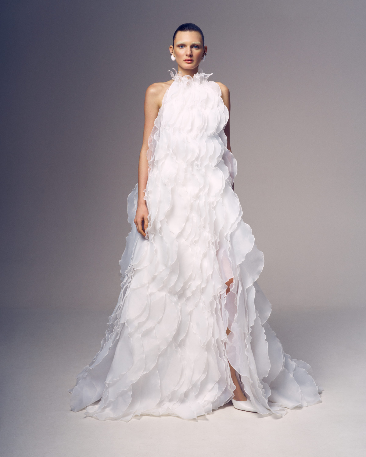 В основі колекції — сукня, яка акцентує на собі всю увагу: нова плісирована максі зі струмливим подолом. Створена для того, щоб стати новою улюбленицею наречених, модель поєднує романтику та інтригу, ідеально пасує як для вишуканої церемонії, так і для яскравої танцювальної вечірки після. На цьому складна кутюрна робота не зупинилася: до колекції увійшли найзнаковіші вироби бренду, що пропонують щось унікальне для кожної нареченої.
