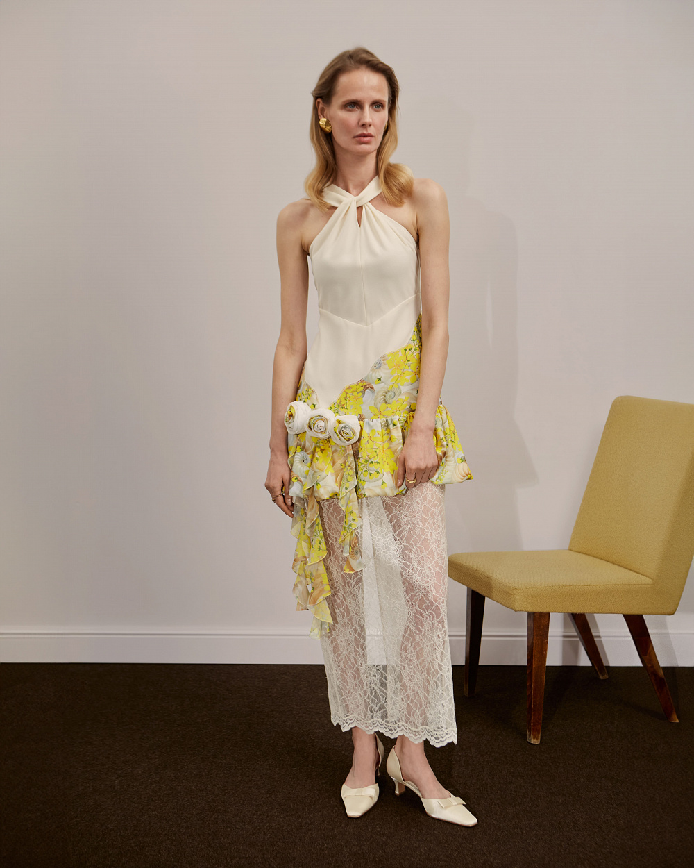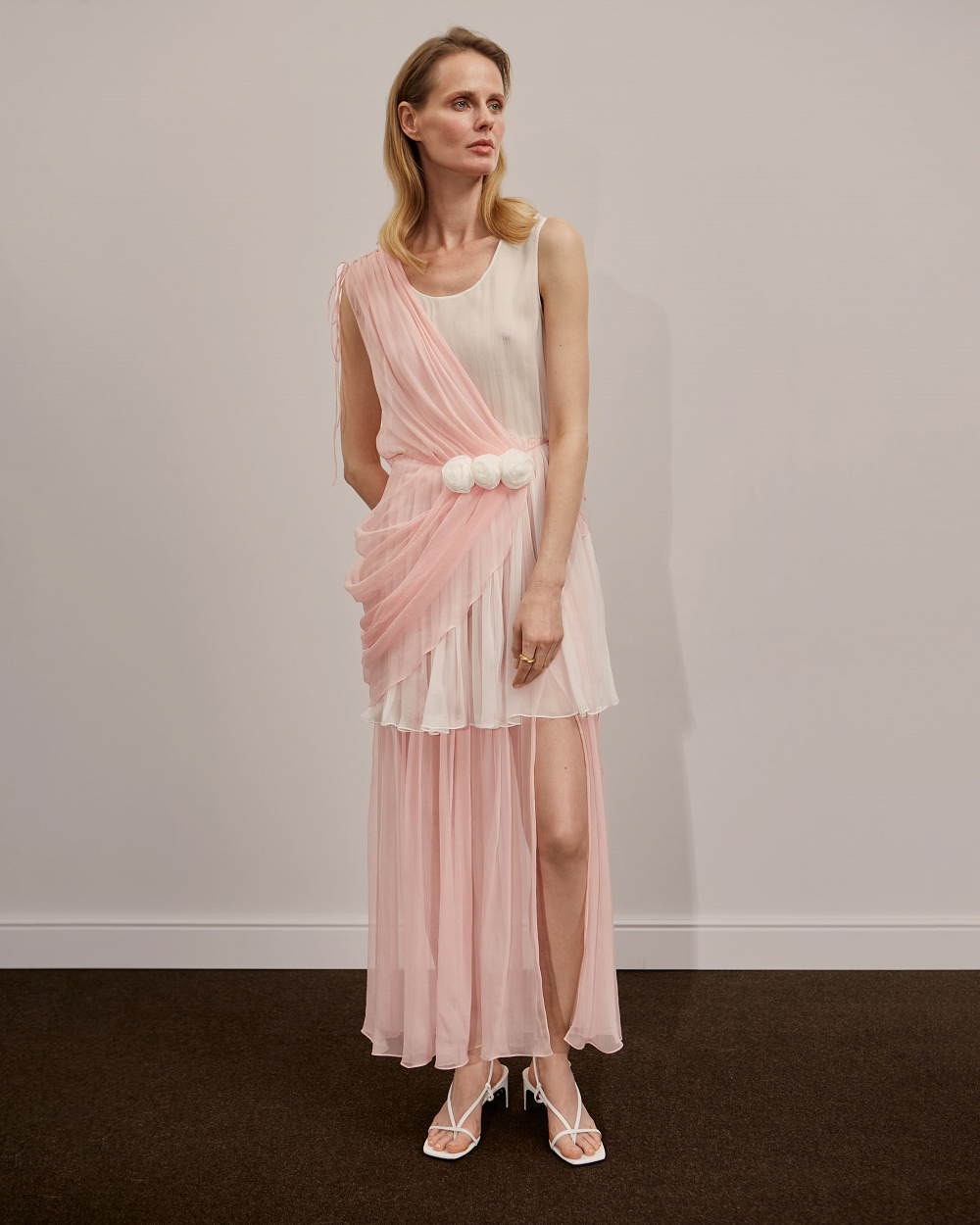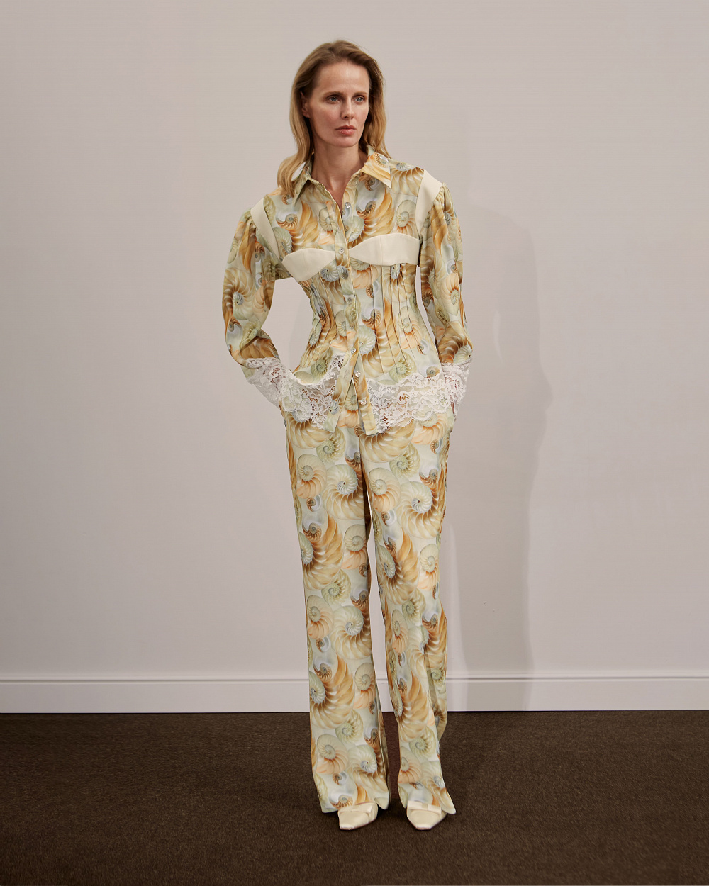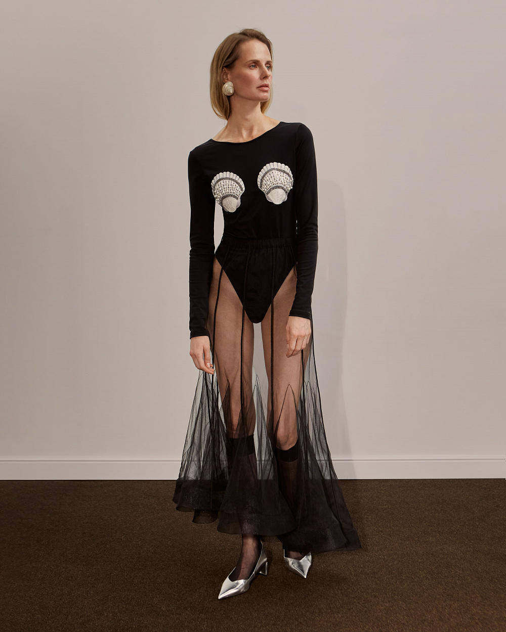 Головним елементом колекції стала декоративна мушля наутилуса. Її об’ємні акценти з перлинами прикрашають сукні та боді, а принт із закрученими черепашками видніється на яскравих і напівпрозорих тканинах. Кожна деталь вбрання немовби нагадує нам про океан. Мереживні й сітчасті вставки на сукнях, фатинові елементи та яскраві квіти, що доповнюють блузи та костюми, — усе це додає особливої легкості й невагомості вбранню.