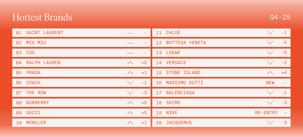 Цього кварталу рейтинг виглядає дивно спокійно: топ-три бренди залишилися незмінними порівняно з третім кварталом минолого року, а Saint Laurent і Miu Miu просто помінялися місцями.