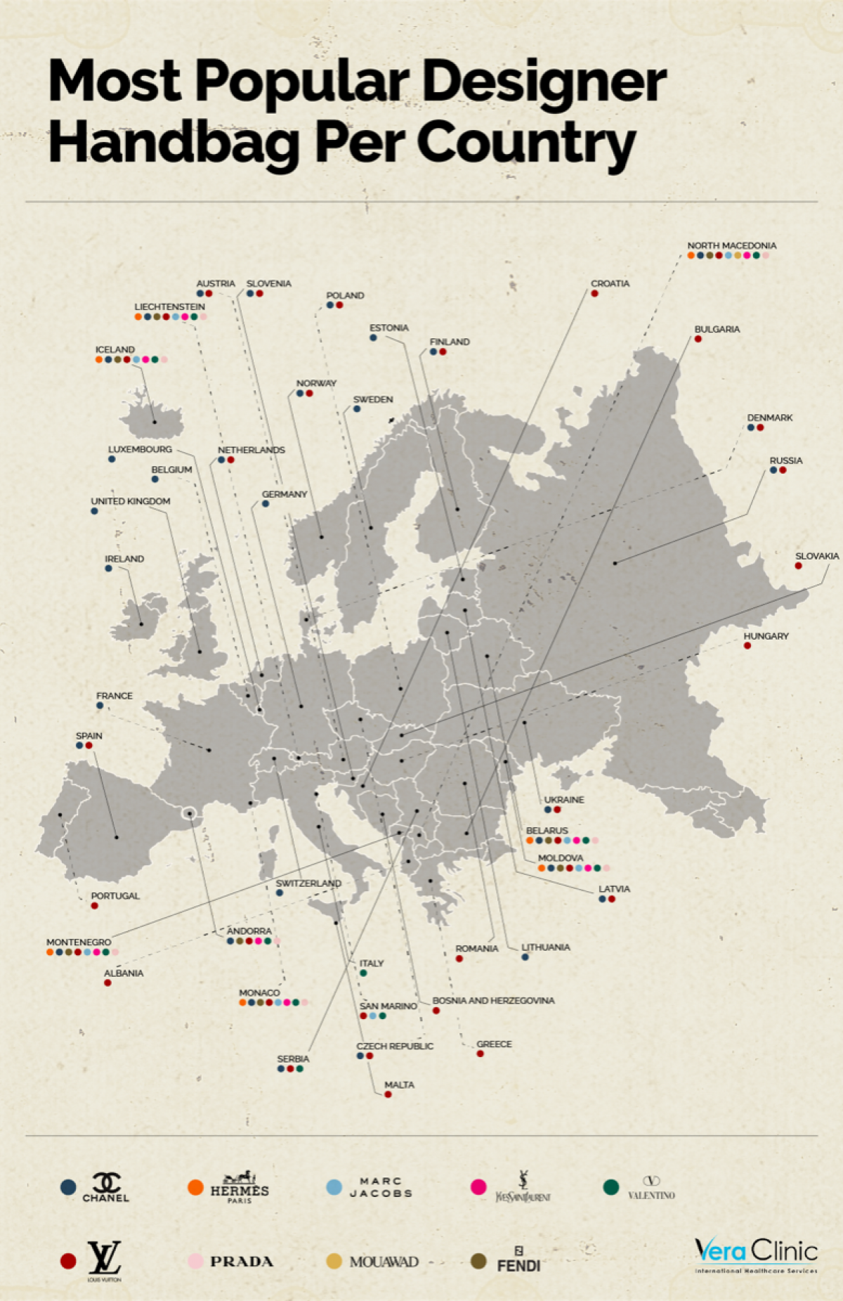 Vera Clinic проаналізувала популярність дизайнерських сумок у країнах Європи та на континенті загалом. Компанія використала SEO-інструмент Ahrefs для пошукового запиту «[Назва бренду] сумка» — вона обрала 10 відомих брендів і порівняла кількість запитів за місяць.