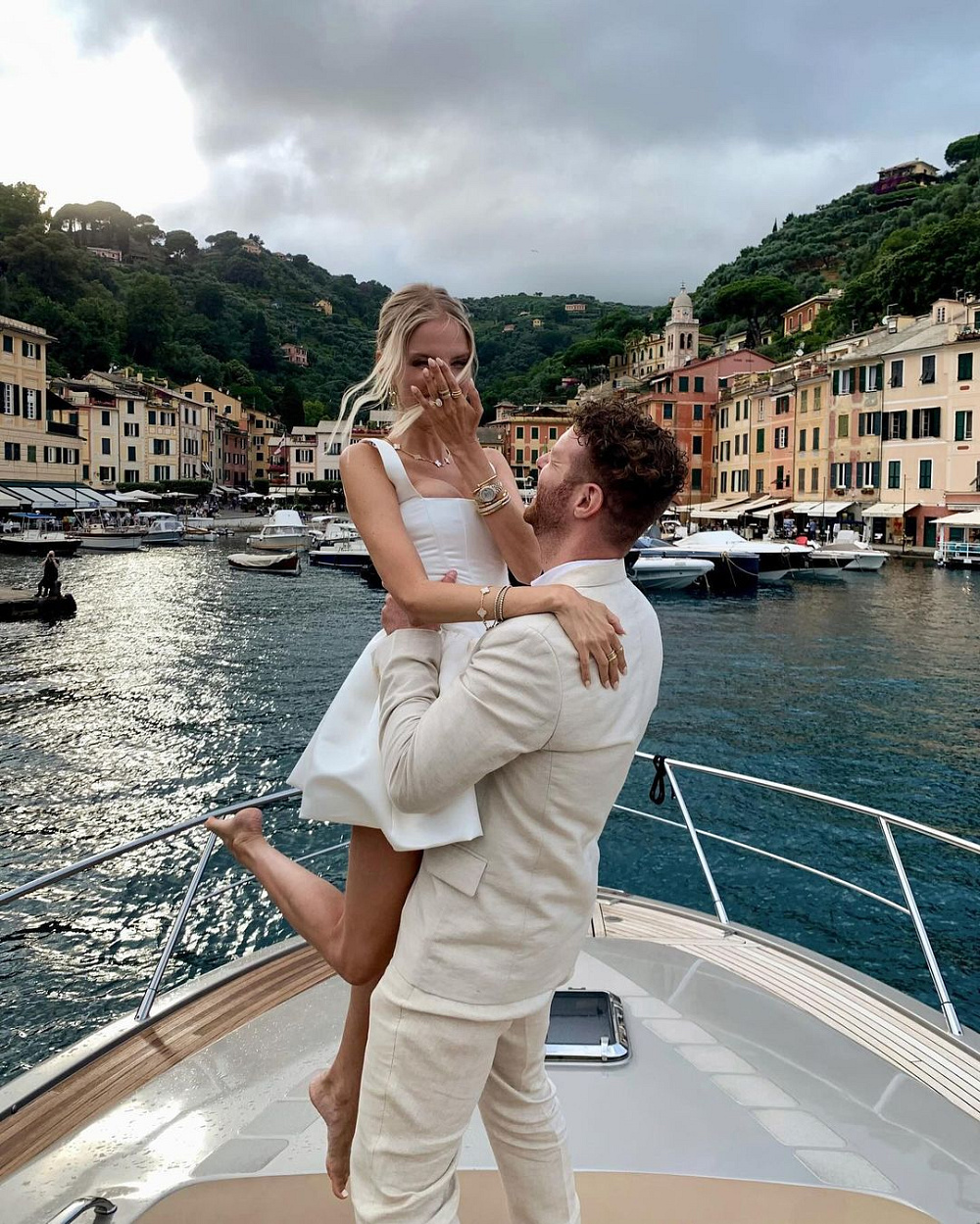 Днями інфлюенсерка поділилася своєю щасливою новиною: її хлопець Алекс, який до того ж має українське походження, зробив їй пропозицію під час відпочинку в Портофіно. На світлинах Леоні вбрана в білу сукню міні від бренду BALYKINA. Натхнена естетикою старого Голлівуду, модель має широкі бретельки, пишну повітряну спідницю та обтислий корсет із квадратним декольте.