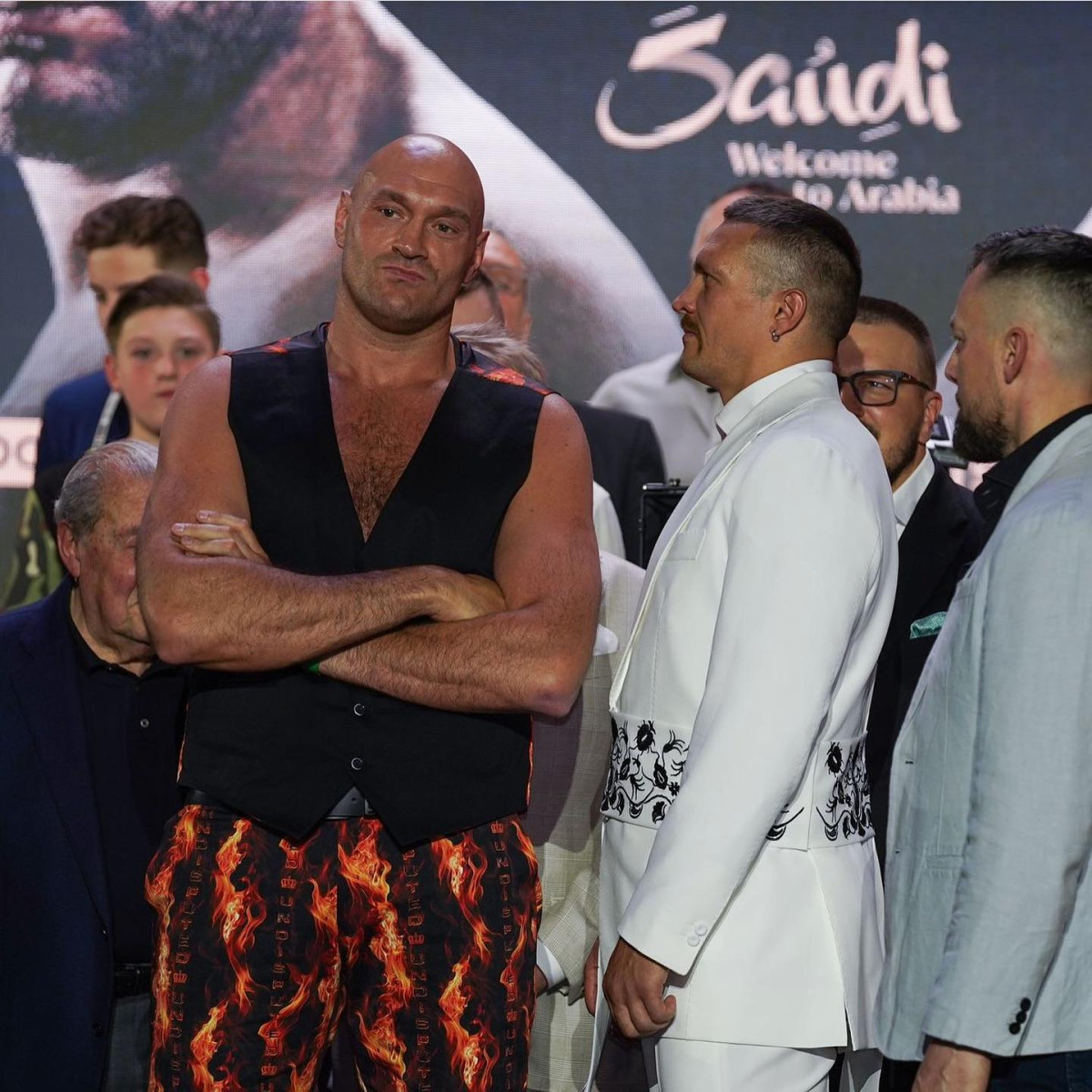 За останні роки кар’єри боксера ми побачили чимало патріотичних образів, які він обирав для пресконференцій. Більшість із них — творіння чоловічого бренду Damirli, заснованого дизайнеркою Ельвірою Гасановою. Зокрема, й образ, який Олександр Усик вдягнув перед історичним боєм для «битви поглядів».