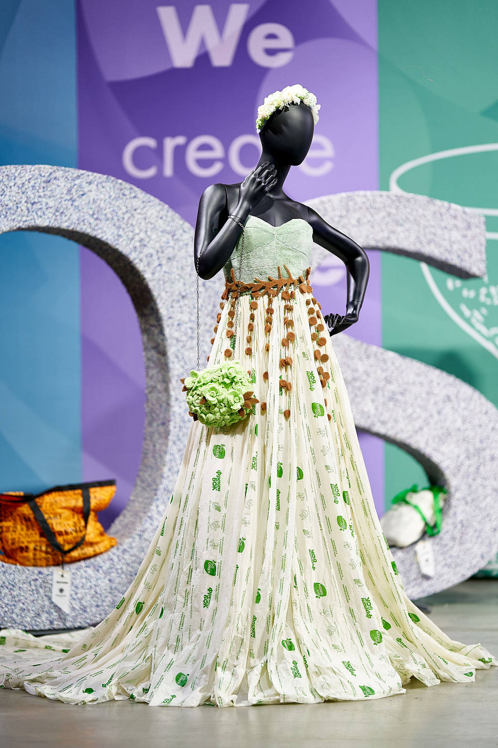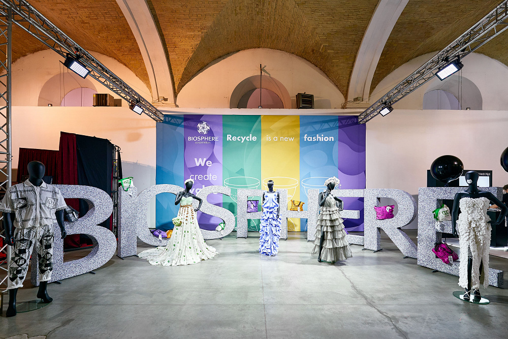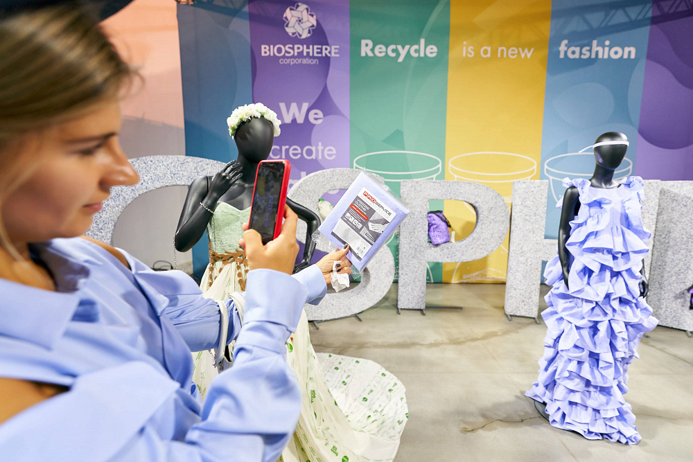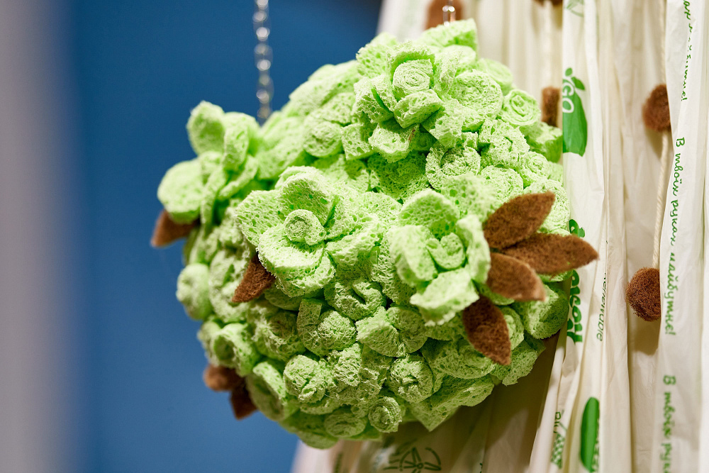 В сотрудничестве было создано 6 вариаций сумок. Три из них — в трендовых цветах 2021-2022, и еще три модели — оммаж известным брендам. Для их производства было изготовлено 100 м пленки из рециклинговых гранул, которые выпускают на заводе Polygreen, где ежемесячно 860 т полиэтилена превращается в полезный ресурс. Кроме этого, в пространстве Мыстецкого Арсенала корпорация «Биосфера» создала 5 образов из экопродуктов: хлопковых влажных салфеток, моющих губок, биоразлагаемых пакетов и не только.