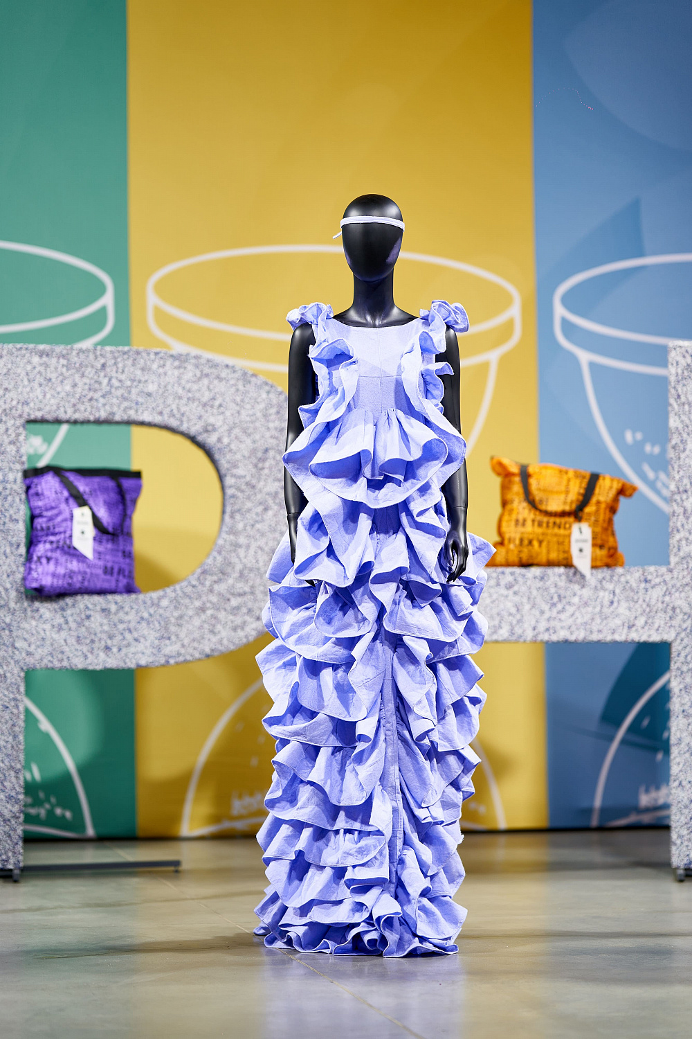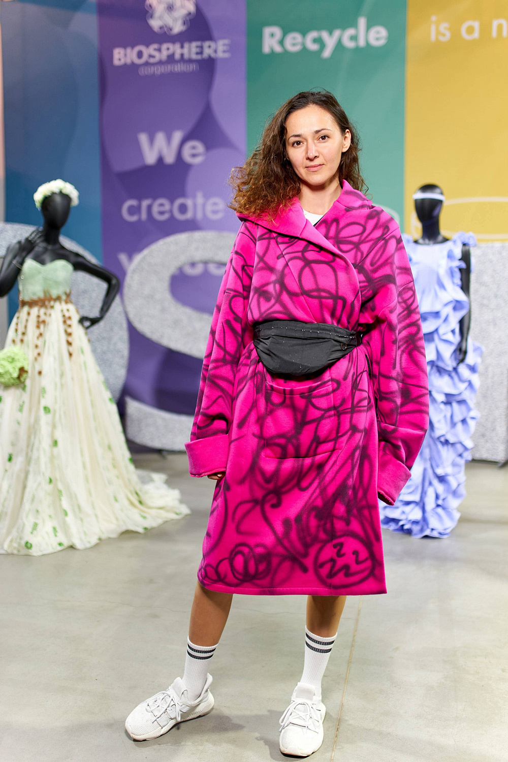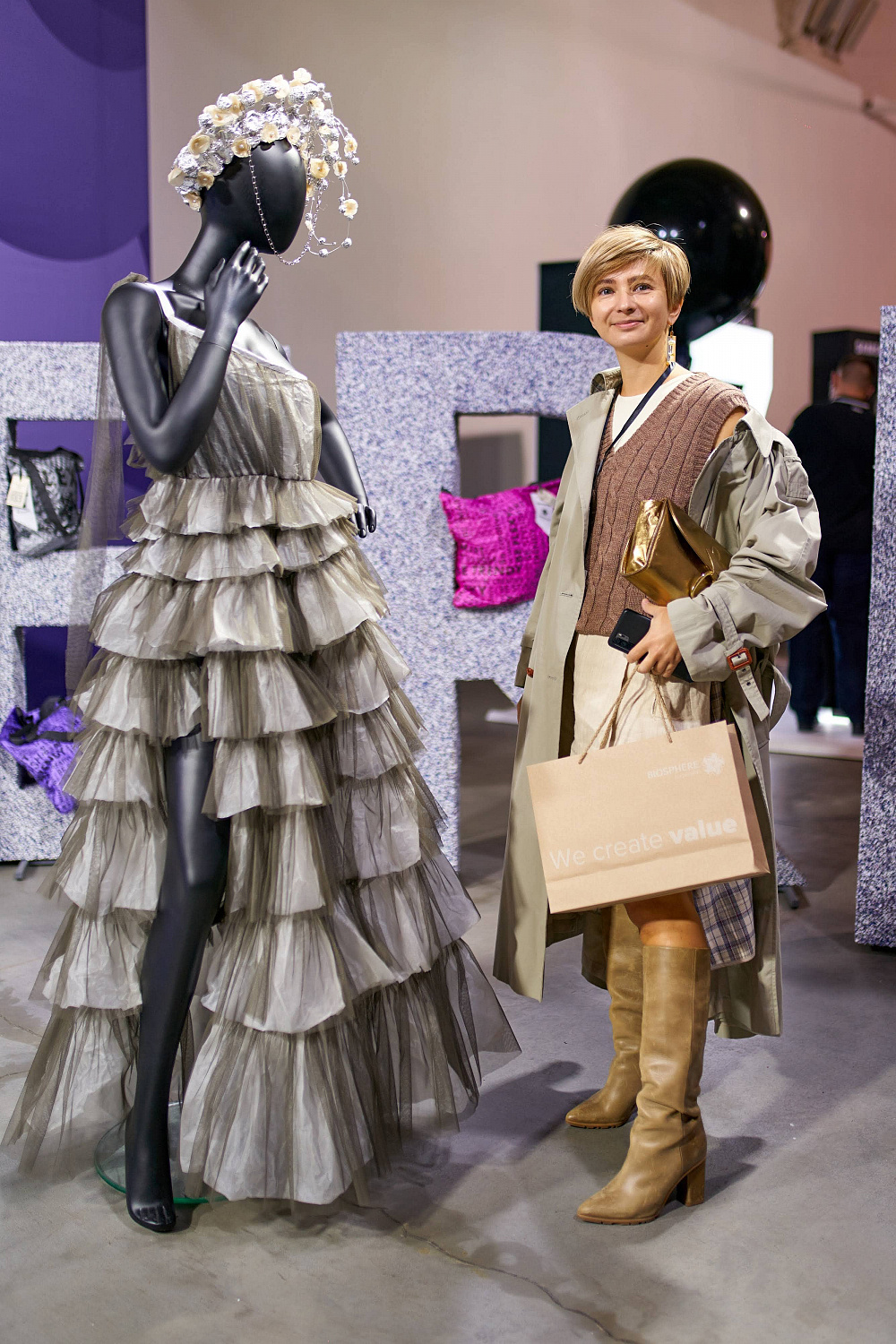 В сотрудничестве было создано 6 вариаций сумок. Три из них — в трендовых цветах 2021-2022, и еще три модели — оммаж известным брендам. Для их производства было изготовлено 100 м пленки из рециклинговых гранул, которые выпускают на заводе Polygreen, где ежемесячно 860 т полиэтилена превращается в полезный ресурс. Кроме этого, в пространстве Мыстецкого Арсенала корпорация «Биосфера» создала 5 образов из экопродуктов: хлопковых влажных салфеток, моющих губок, биоразлагаемых пакетов и не только.