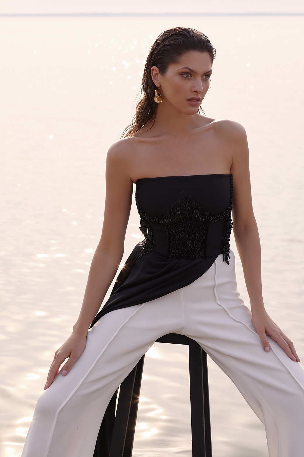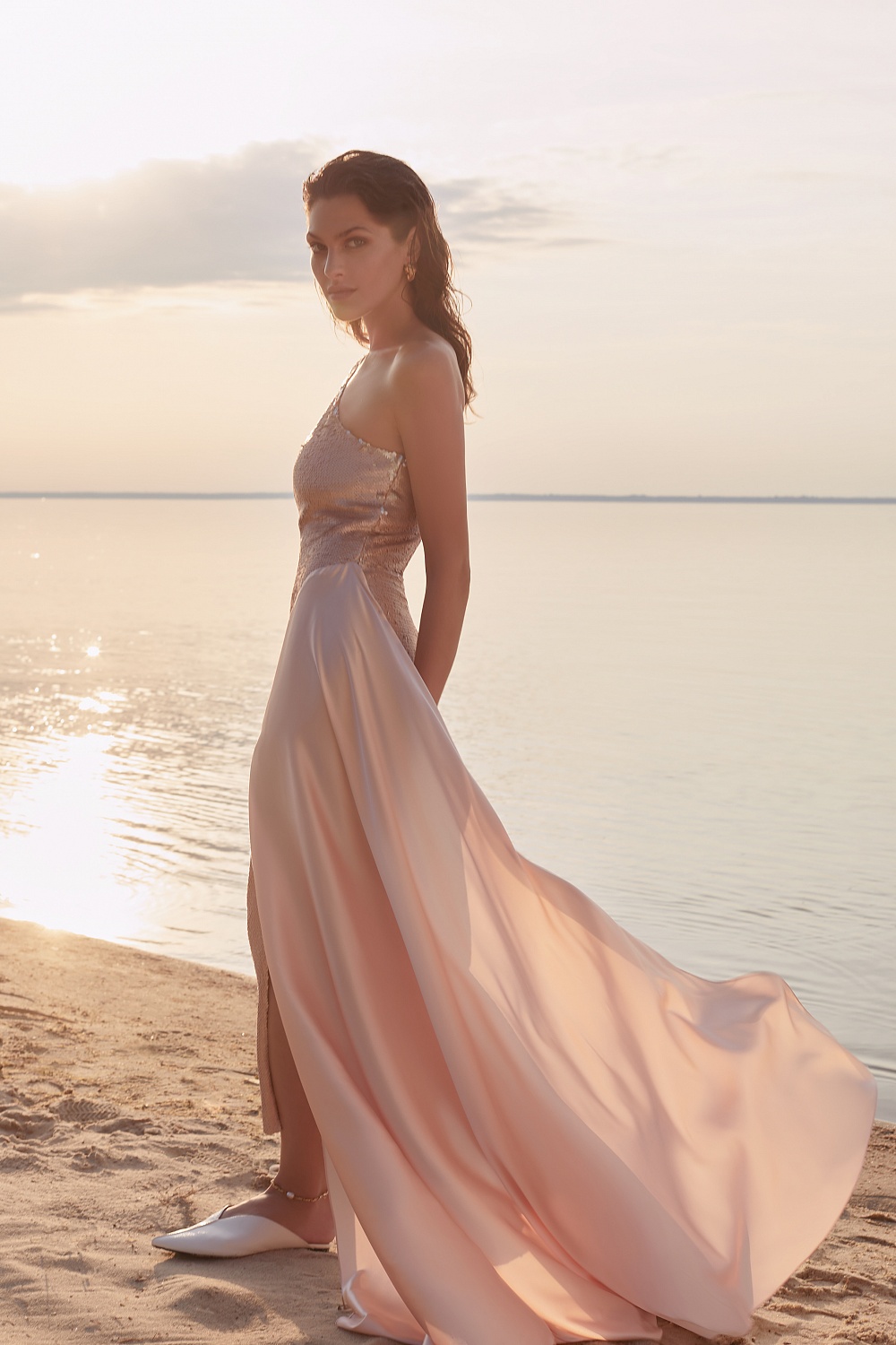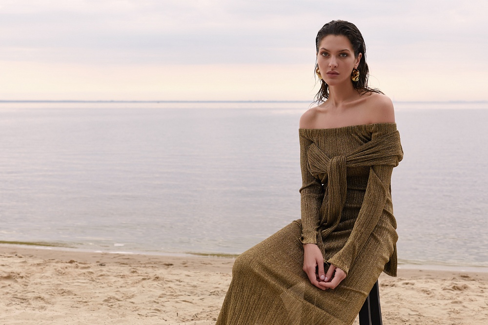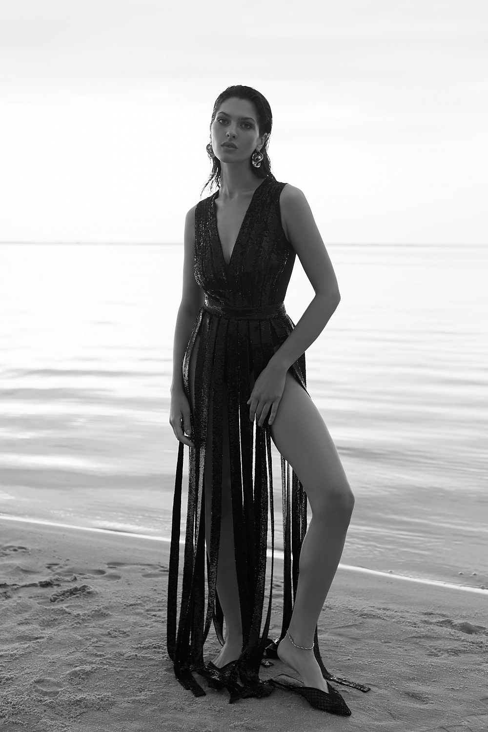 Перед стилистом съемки Натальей Осадчей стояла задача создать из кутюрно-вечерних нарядов универсальные образы, ведь именно в этом и состоит идея сегодняшнего осознанного потребления — надевать вещь не один раз и по разным поводам. Отсюда и нестандартные стилистические решения — купальник-бандо соседствует с юбкой с бахромой из стекляруса, рубашка с кристаллами, наклеенными вручную, надета поверх купального костюма телесного цвета. Камни на боди и топах-бюстье отражаются в рассветном зеркале воды - и героиня съемки из модели превращается в мифический образ.